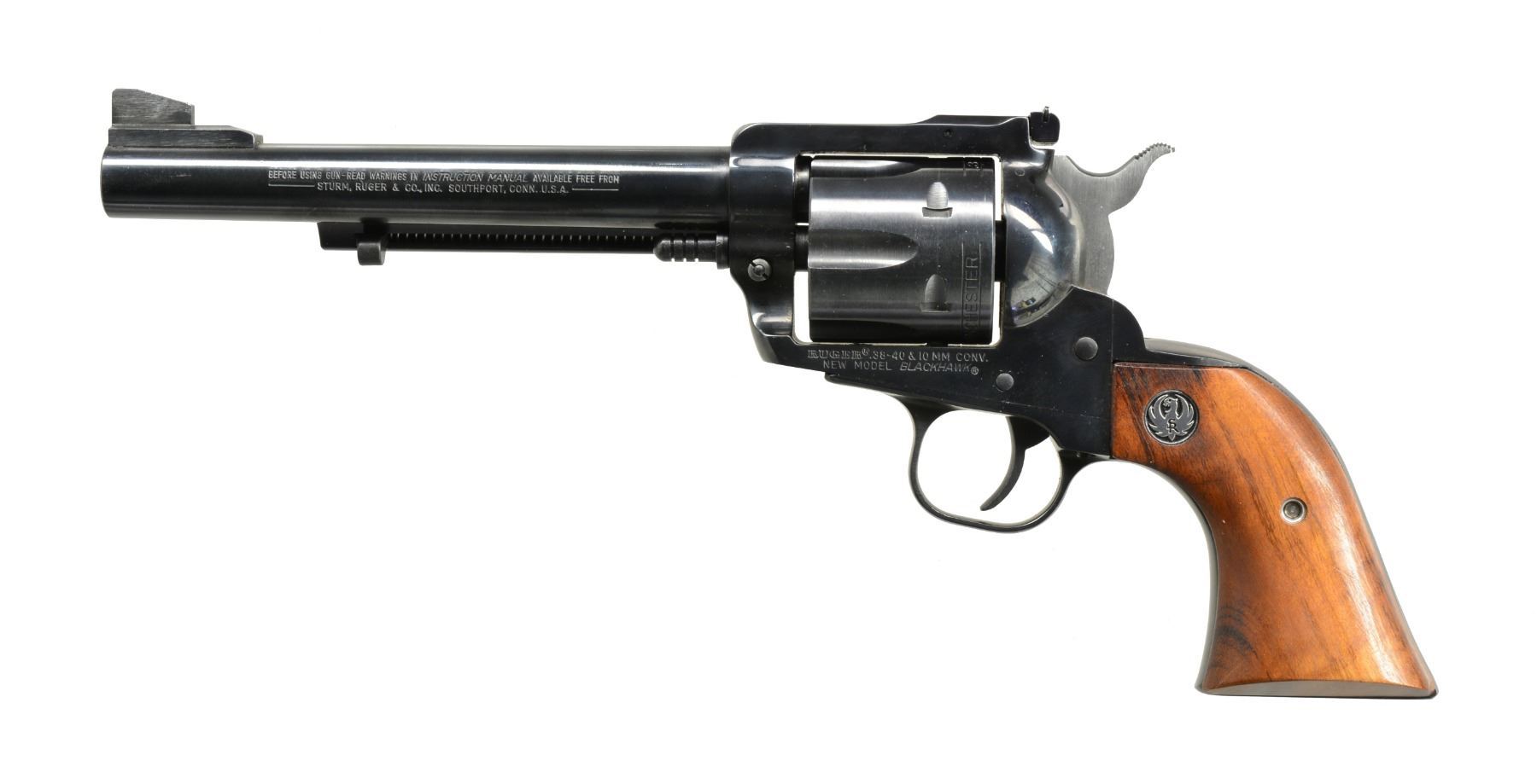 1) Cal. 38-40/10mm. S# 611-03531. Bbl. 6 1/2" w/ serrated ramp front sight & square notch adj. rear sight. Both cyl.'s 6 shot fluted, blue finish. 2 Piece wood grips w/ black eagle medallions. CONDITION: over 95% blue. Grips show light wear. Bright bore w/ strong rifling. (20-1067/DS). 2) Cal. 45 ACP/45 Colt. S# 47-40347. Bbl. 4 5/8" w/ ramp front sight & adj. square notch rear sight. Both cyls. 6 shot fluted, blue finish. 2 Piece synthetic black eagle grips. UNATTACHED ACCESSORIES: original 2 piece black eagle wood grips. CONDITION: over 85% blue showing wear at trigger guard, muzzle & cyl. drag lines. Very good grips. Bore is bright w/ strong rifling. (20-1069/DS). BOTH MODERN. $1,000-1,300.