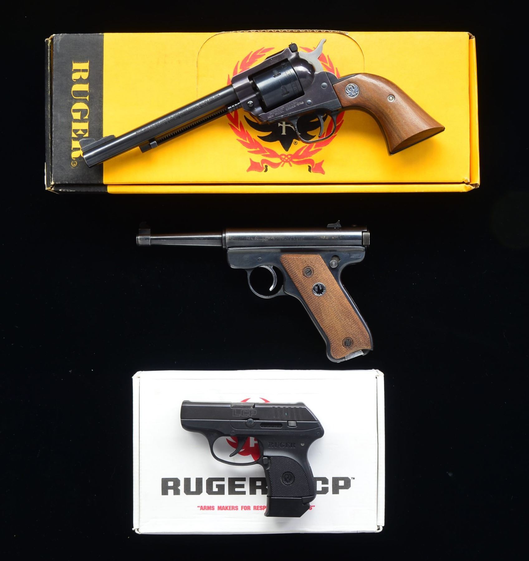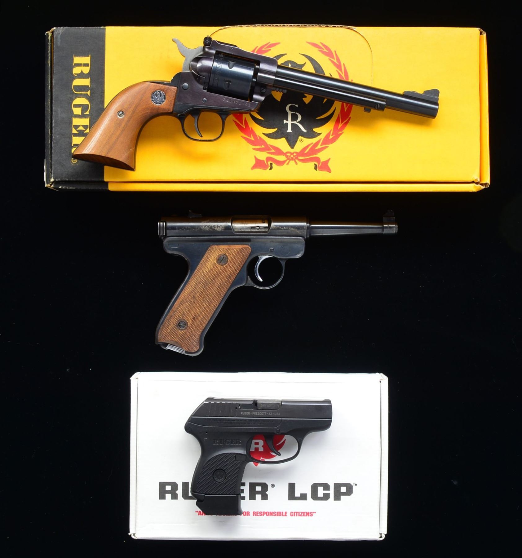 1) NEW MODEL SINGLE-SIX REVOLVER. Cal. 22 Mag. S# 261-71343. Bbl. 6 1/2" w/ screw attached front sight & adj. rear. Mfg. 1988 w/ walnut grips having silver eagle medallions. Originally convertible, missing LR cyl. UNATTACHED ACCESSORIES: matching numbered factory box & lock. CONDITION: very good w/ occasional sm. mark & beginning high point wear. Faint grip marks & near excellent bore. (20-967/NW). MODERN. 2) STANDARD AUTO PISTOL. Cal. 22 LR. S# 235422. Bbl. 4 3/4" w/ blade front sight & drift adj. rear. Mfg. 1962 w/ silver trigger. Optional checkered walnut grips w/ black eagle medallion. MAGS: 2 factory 9 rd. w/ chrome bases & slotted right side only. CONDITION: good plus w/ light high point finish loss plus splotchy appearance on right of receiver. Near excellent bore & grips. (20-1007/NW). CURIO. 3) LCP PISTOL. Cal. 380 ACP. S# 377-61556. Bbl. 2 3/4". Mfg. 2012 w/ integral sights on slide; hammer firing. MAGS: 3 total; blued Pro Mag. 6 rd. w/ short finger extension, Mec-Gar 7 rd. w/ extra long finger extension & Ruger 6 rd. w/ long finger extension plus flat base. UNATTACHED ACCESSORIES: factory box & packaging. Black R.L. Graham holster w/ #32 North American Arms backer. CONDITION: all aspects near excellent including bore. (20-1055/NW). MODERN. $500-750.
