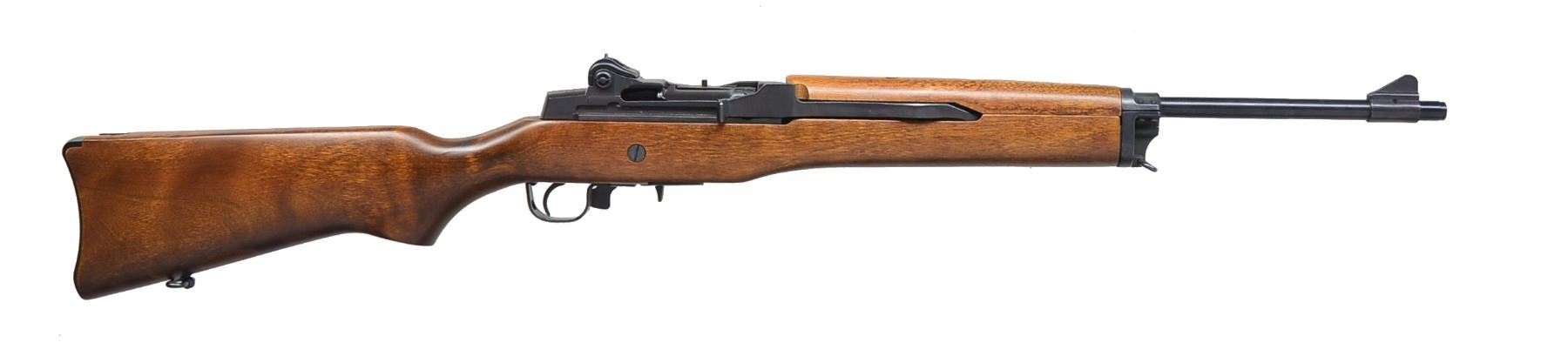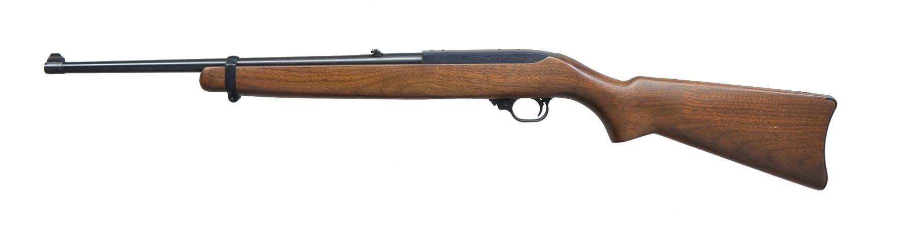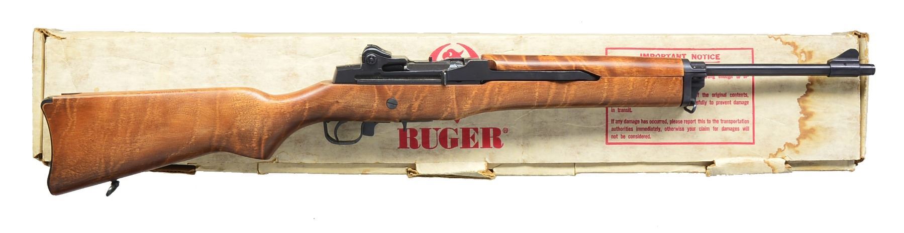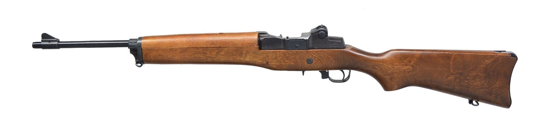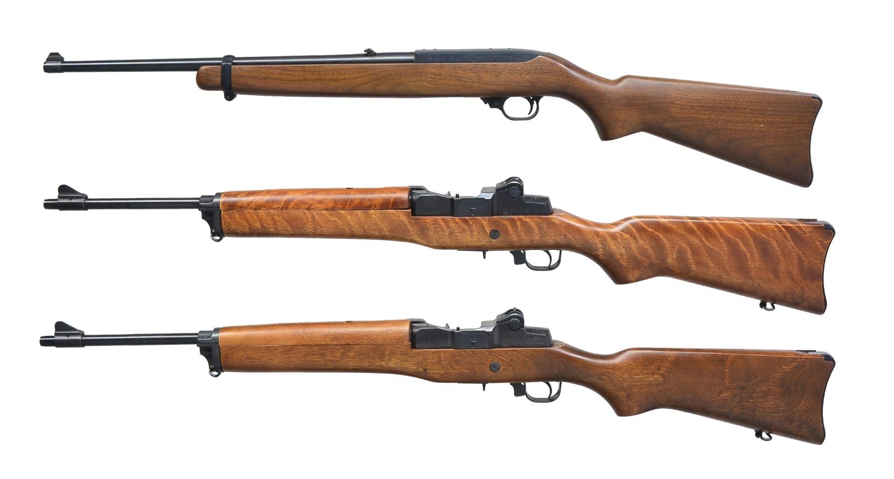 1) RUGER MODEL 10/22. Cal. 22 LR. S# 110-52812. Bbl. 18 1/2". Band mounted bead front sight w/ folding leaf rear sight. Walnut carbine style stock. MAGS: 1 rotary 10 rd. CONDITION: 98% metal finish. Stock shows scattered handling marks. Very good bright bore. (19-5910/DS). 2) RUGER MINI-14. Cal. 223 Rem. S# 181-00074. Bbl. 18 1/2". Serrated ramp front sight w/ adj. peep rear sight. Birch stock & handguard. MAGS: 1 detachable 5 rd. UNATTACHED ACCESSORIES: original box. CONDITION: near excellent retaining 99% original finish. (19-5931/DS). 3) RUGER MINI-14. Cal. 223 Rem. S# 182-12149. Bbl. 18 1/2". Serrated ramp front sight w/ adj. peep rear sight. Birch stock & handguard. MAGS: 1 detachable 5 rd. CONDITION: over 98% wood & metal finish. Very good bright bore. (19-5950/DS). ALL MODERN. $900-1,200.