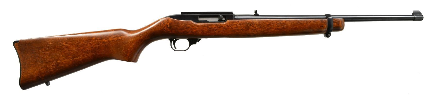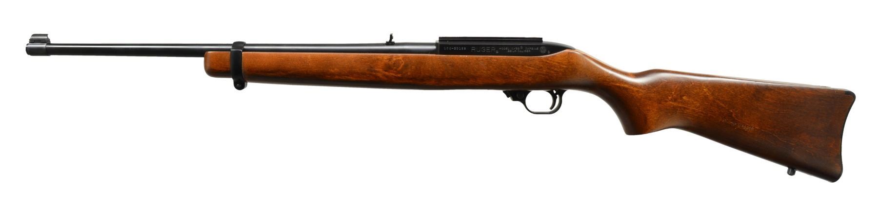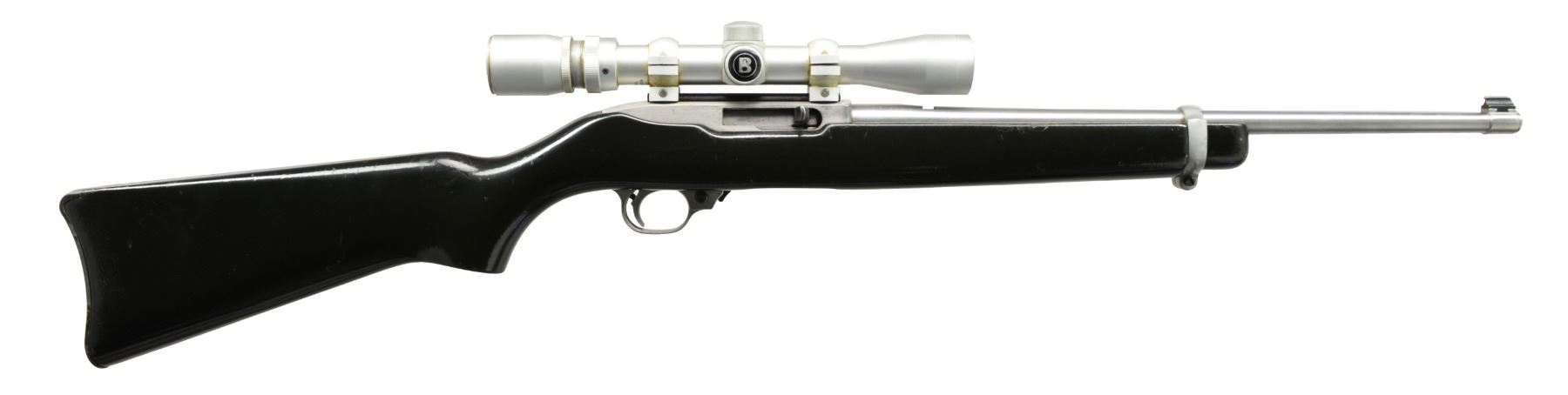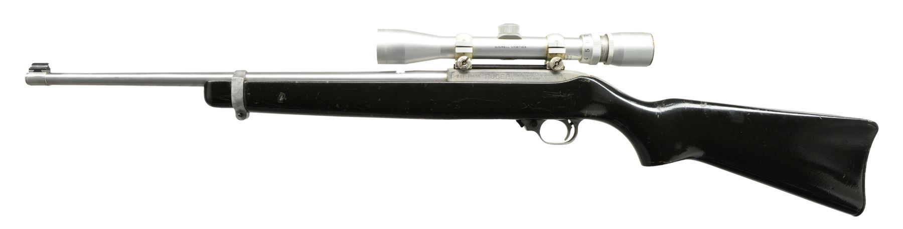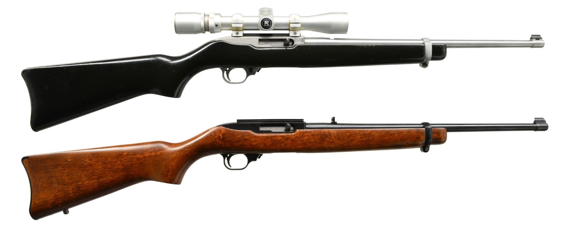 BOTH: cal. 22 LR. Bbls. warning marked 18 1/2" w/ brass bead front sights & folding rears. MAGS: none. 1) S# 240-14664. Mfg. 1994 as stainless w/ hardwood carbine stock now painted black. Weaver scope base w/ silver Bushnell Sportview 3-9 X 32 duplex reticle scope. CONDITION: fair to good overall appearance w/ spotty finish appearance to trigger guard, bbl. band & receiver. Light marks by rear sight (missing) dovetail. Good appearing scope missing rubber eye ring; near excellent optics. Numerous marks & spots of paint loss on stock. Near excellent bore. (20-281/NW). 2) S# 126-30159. Mfg. 1984 as blued w/ stained hardwood stock. Ruger grooved scope adapter installed on receiver. QD sling stud near butt; none at front. CONDITION: very good overall appearance w/ very good to excellent metal finish. Numerous light handling marks on stock set. Near excellent bore. (20-282/NW). BOTH MODERN. $250-400.