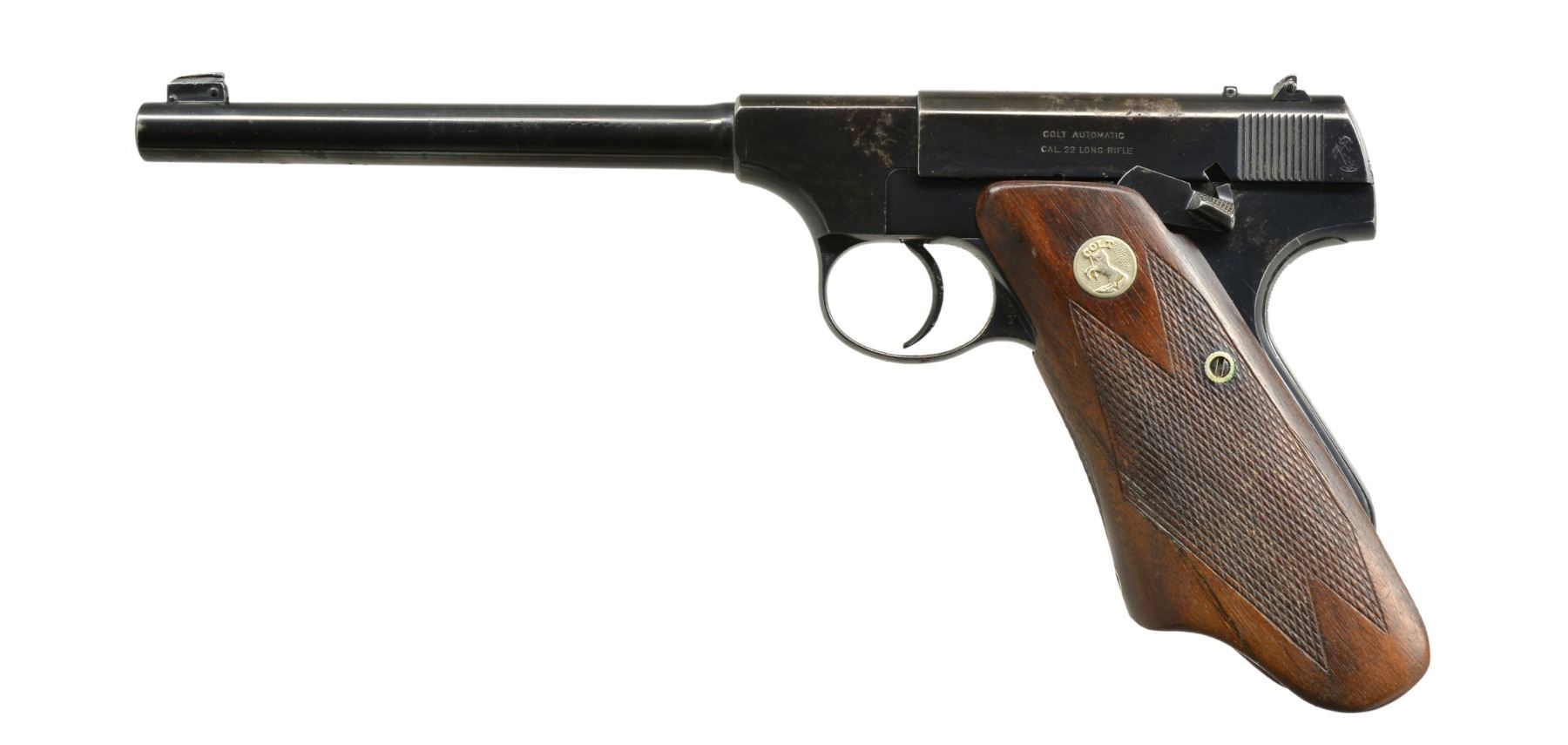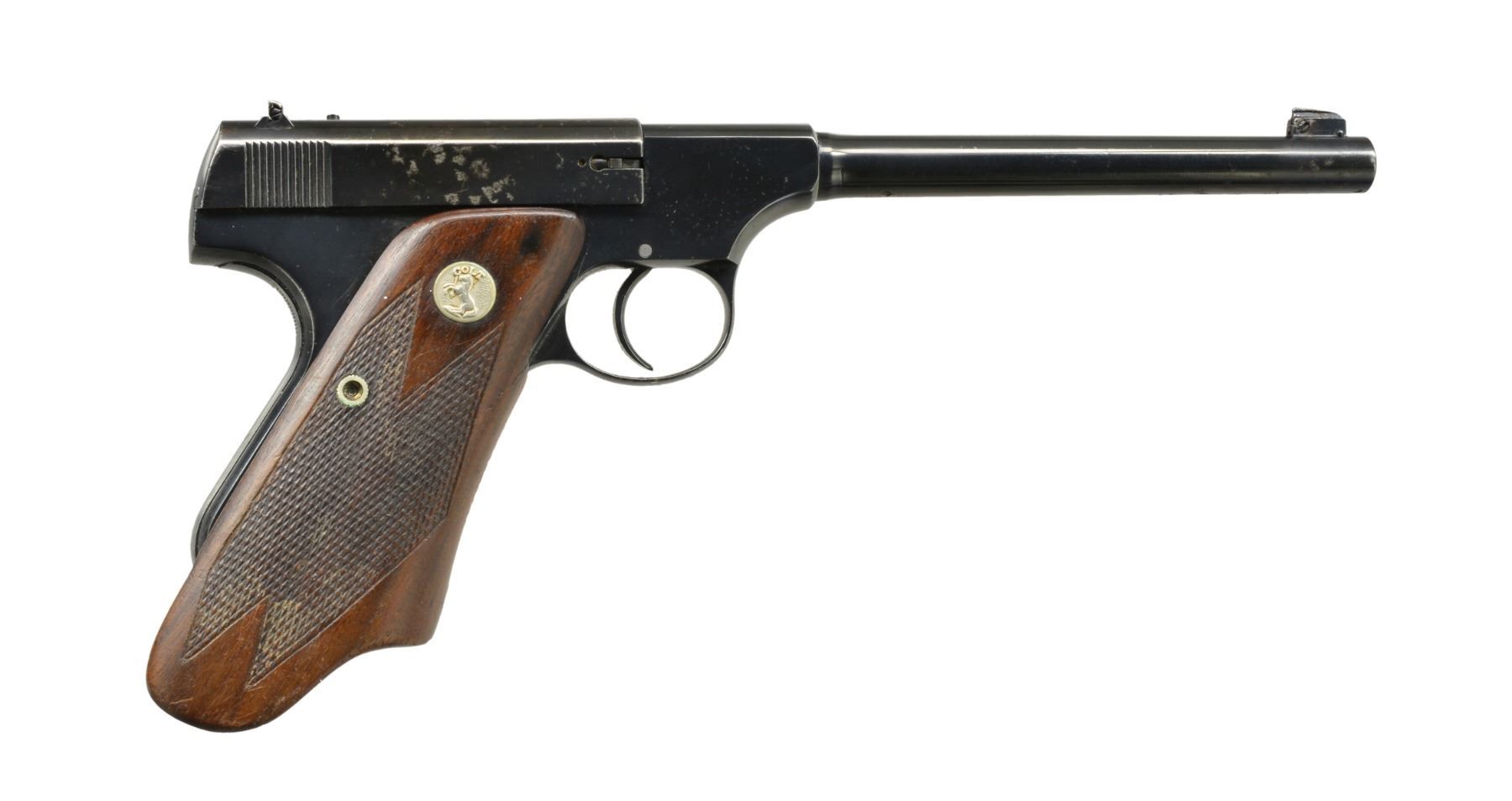 AUTO PISTOL. Cal. 22 LR. S# 427 (under grips). Bbl. 6 5/8" heavy w/ blade front sight & windage adj. U notch rear sight. Blue finish. 1 Piece checkered walnut "elephant ear" grip w/ silver Rampant Colt medallions. Approx. total of 16,000 mfg. 1938-1944. MAGS: 3 detachable 10 rd.; 1 has brass follower marked "CAL.22 / COLT"; 2 unmarked aftermarket. CONDITION: 90% reblued finish showing scattered spots of light pitting. Grips show light wear & handling marks having a glued full length break at front of left side. Bright bore has strong rifling. (20-973/DS). CURIO. $900-1,500.