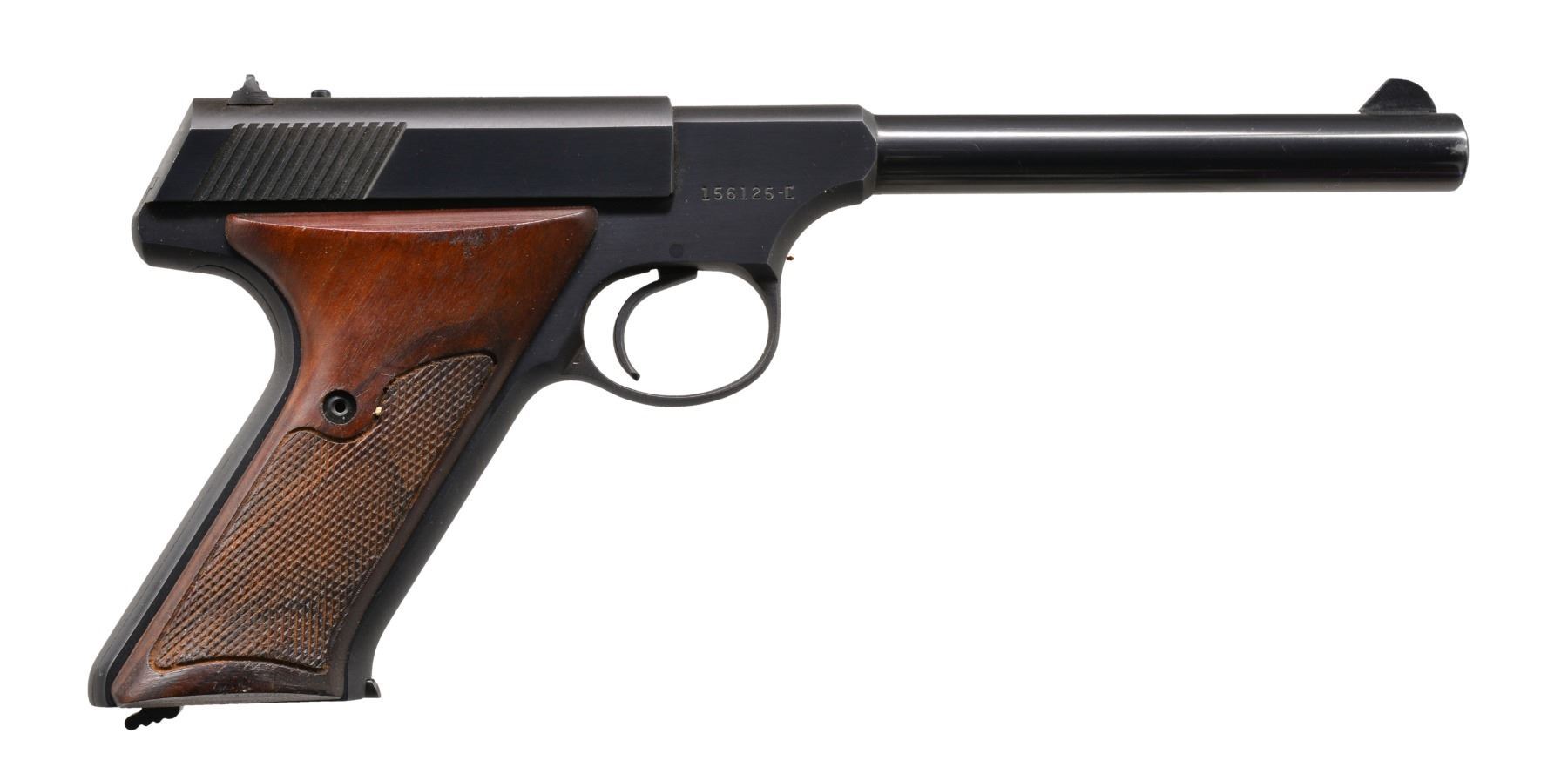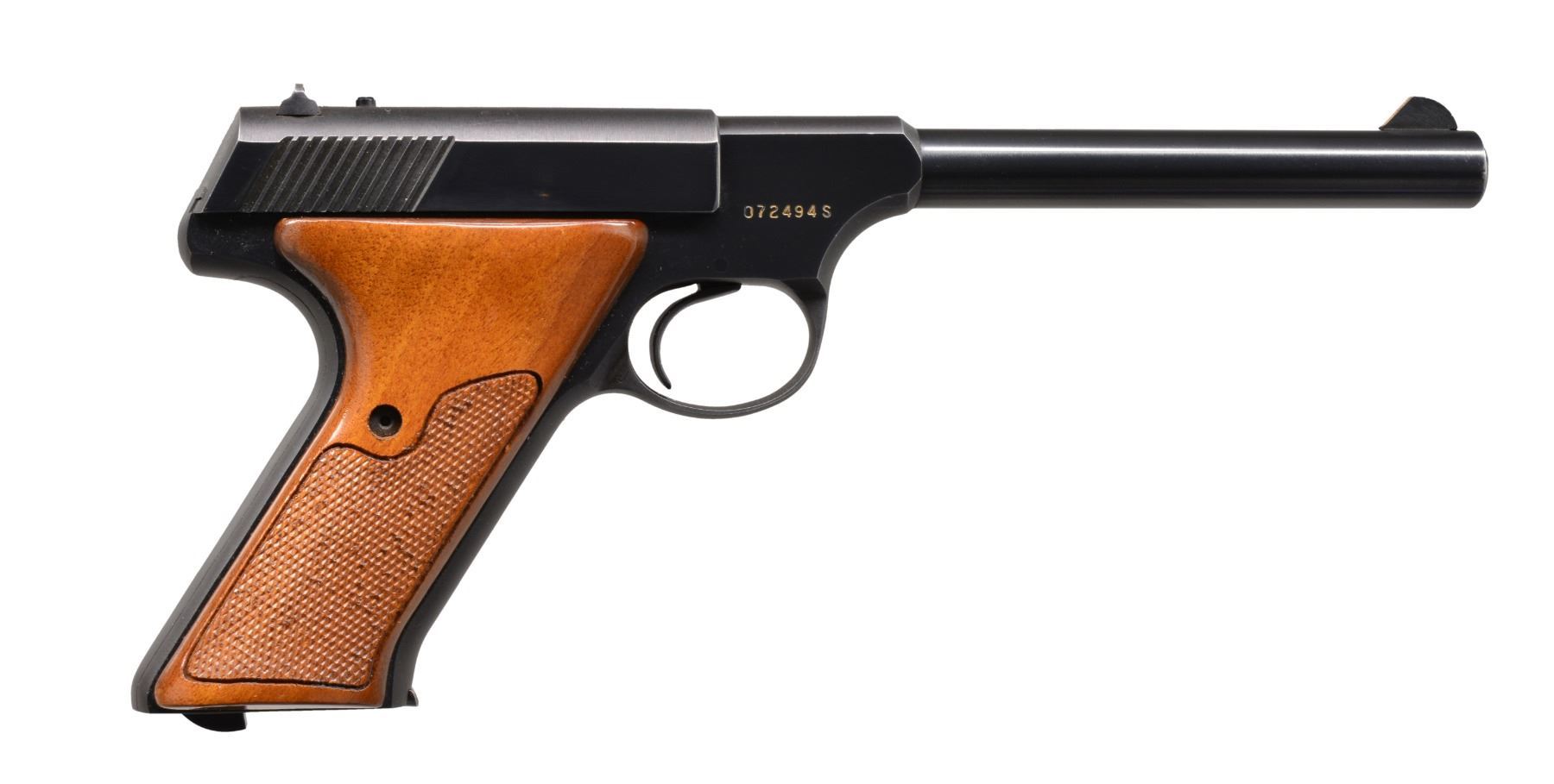BOTH: cal. 22 LR. Bbls. 6" w/ serrated ramp front sights & square notch rear sights. Both have blue finish w/ 2 piece checkered walnut grips. MAGS: 2 detachable 10 rd. 1) S# 156125-C. CONDITION: over 98% blue showing slight muzzle wear & sm. scratches. Grips have darkened finish showing dents & handling marks. Bore is bright w/ sound rifling. (20-50/DS). 2) S# 072494S. CONDITION: 95% original blue showing edge wear & sm. spots. Bbl. & frame markings have added Bonanza gold. Grips show light handling marks. Bore is bright w/ sound rifling. (20-63/DS). BOTH CURIO. $800-1,200.