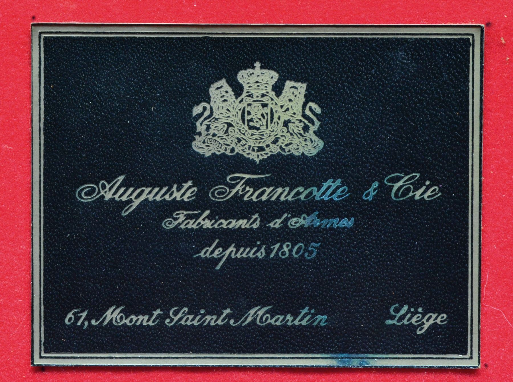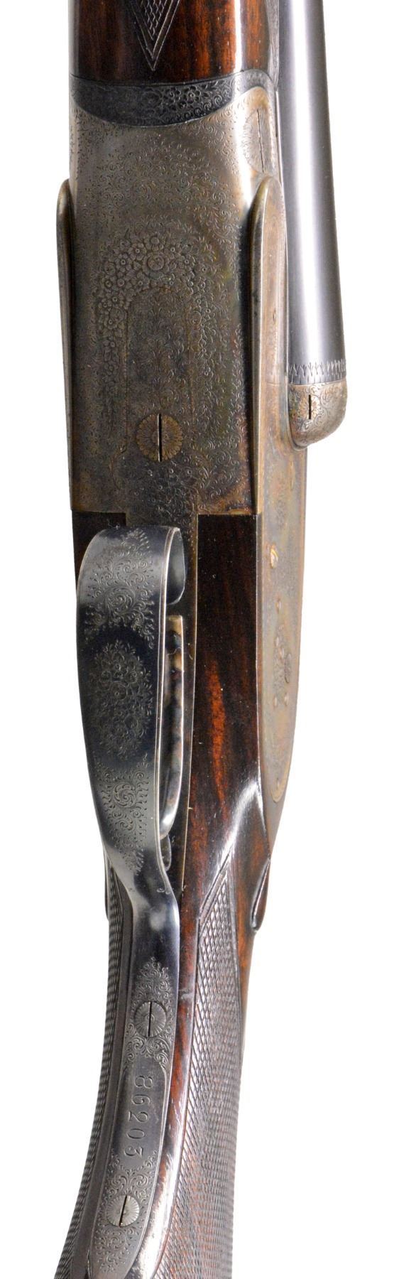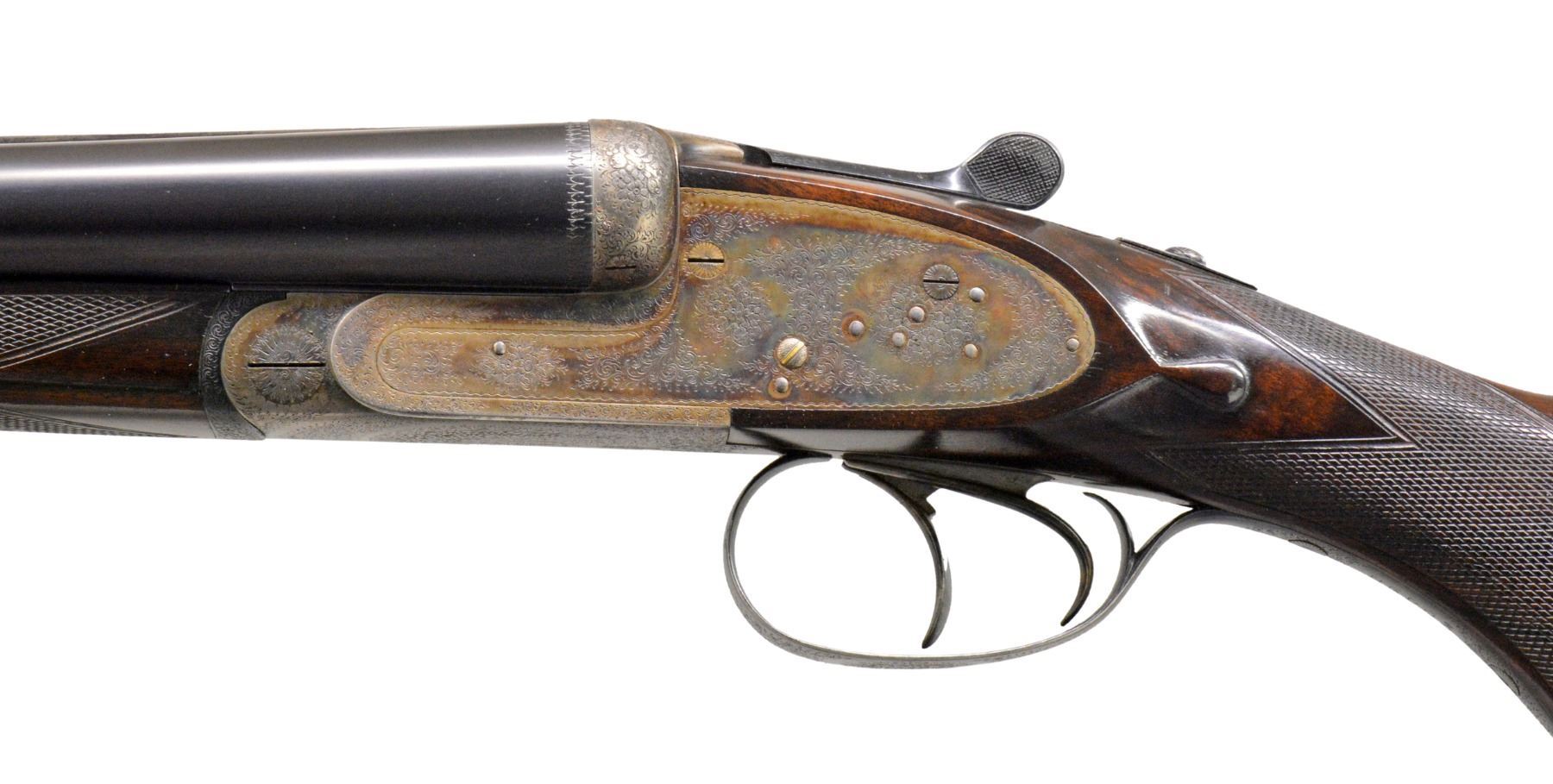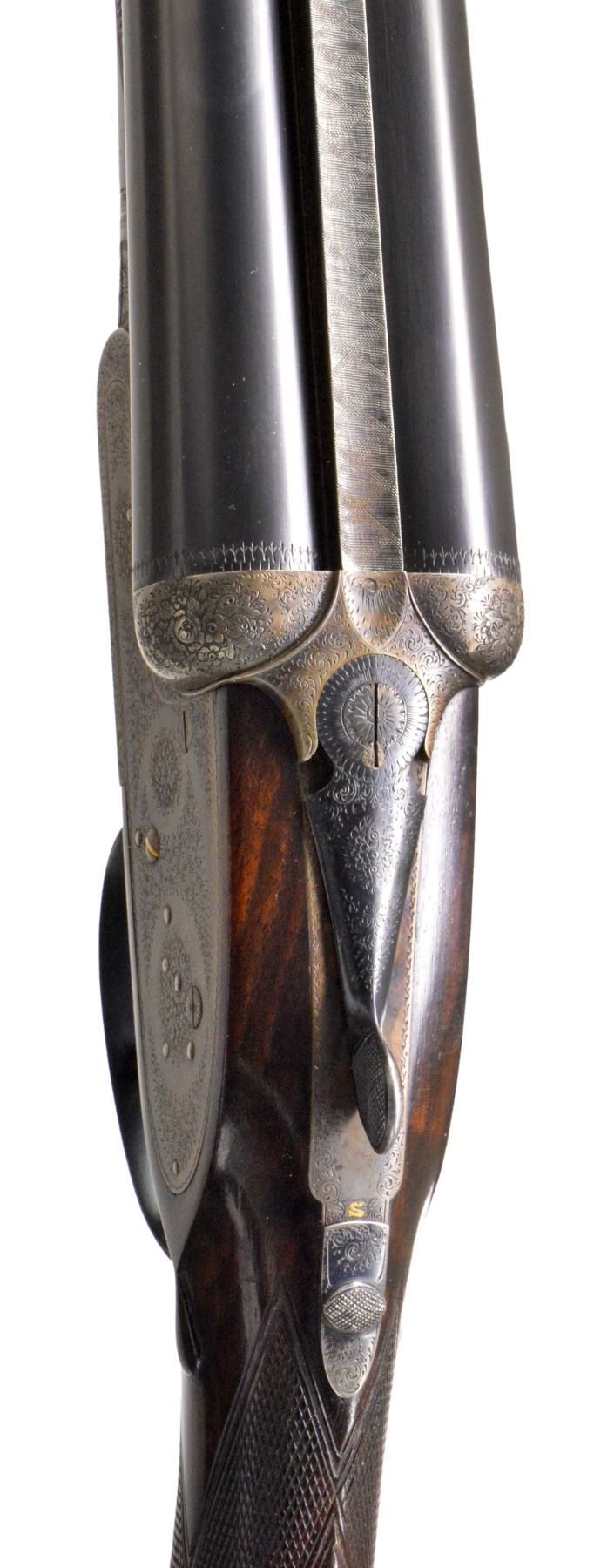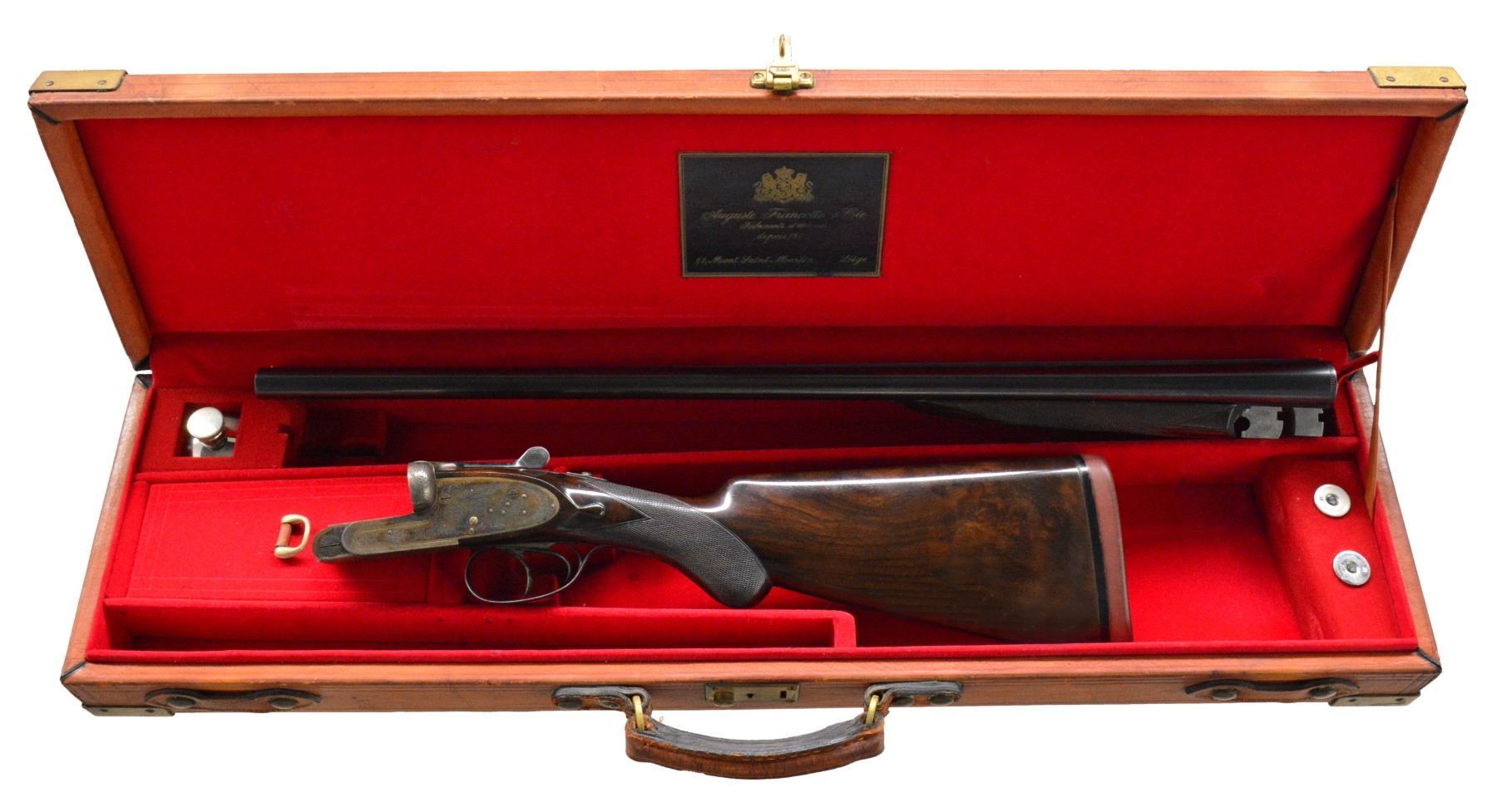 EJECTOR GAME GUN WITH CASE. Cal. 12 Ga., 2 1/2". S# 86203. Bbls. 26 1/8" dovetailed w/ slightly raised, matted & concave rib; is engraved "Aug. Francotte Bte" & "A. Liege" on tops. Bbl. flats & bottoms of bbls. are stamped w/ 1929 Belgian nitro proofs for 2 1/2" chambers. Crowned A & F stamps are also present. S# corresponds to a medium grade Francotte of 1929. The "8" appears to be added in front of the other numbers every place the S# appears, except where engraved on trigger guard tang. This was done at the factory before this gun was finished. The "Francotte Deluxe" sidelock, a "best" gun offered by A & F in 1933, featured chopper lump bbls. & side clips. Casehardened action of this gun features automatic safety, bushed strikers & hidden third fastener, along w/ gold line tumbler end cocking indicators & dbl. triggers, (front articulated). Action & sidelocks are engraved w/ 80% coverage lightly cut open scroll surrounding more deeply cut & superbly detailed rose bouquets w/ a horseshoe shaped rose & other bloom garland on bottom of action. Blued top lever & trigger guard are engraved to match. Dark, somewhat burl figured, European walnut rnd. knob pistol grip buttstock measures 14 1/8" over Silver type pad. Gun also features drop points & flat top point pattern checkering. Matching splinter Francotte type ejector forend has Anson release. Bore diameters: left - .725, choke .019 (mod), right - .724, choke .016 (mod). Wall thickness: left - .032, right - .032. DAC: 1 9/16". DAH: 2 1/2". Cast approx. 1/4" off. LOP: 14 1/8". WEIGHT: 6 lbs.13 oz. UNATTACHED ACCESSORIES: vintage, possibly original, tan leather case w/ brass corners, lined in scarlet velvet & has gold embossed Francotte label in lid. Case contains a pair of snap caps & a square oil bottle. Condition of case is fine w/ some scuffs & marks in leather. Handle is good. Interior cloth has some compressions & light soiling. Label is fine w/ some blue staining. CONDITION: very fine, appears to be all original. Bbls. retain nearly all of what appears to be original blue w/ only a few light handling marks. Action retains 60-70% original color, silvered on fences & beads, thinning on bottom. Lockplates retain nearly all of their original color. Top lever is silvered on thumbpiece. Trigger guard has blue thinning on edges & is silvered at grip. Stocks retain nearly all of what appears to be their original French polish finish, perhaps re polished a bit w/ addition of newer pad, checkering lightly worn. Bores are excellent. Chambers measure 2 11/16", so in proof for 2 1/2". Action is tight. Bbls. are on face. Ejectors are in time. This is a very fine gun in fine condition. (19-5441/MGM2). CURIO. $2,500-$3,500.
