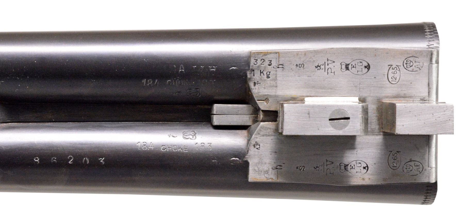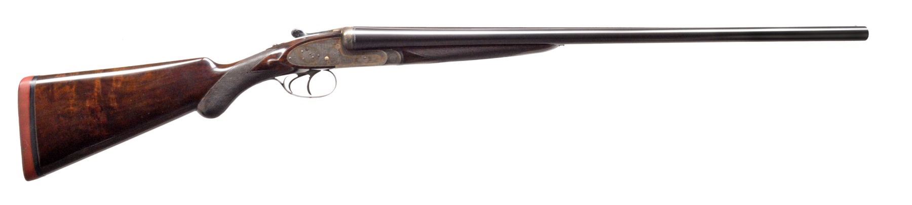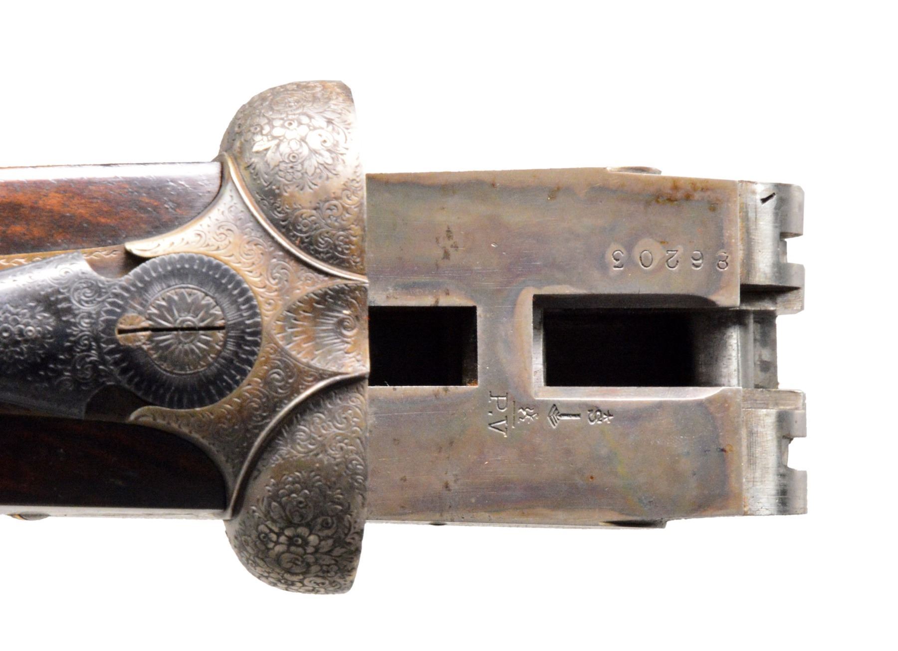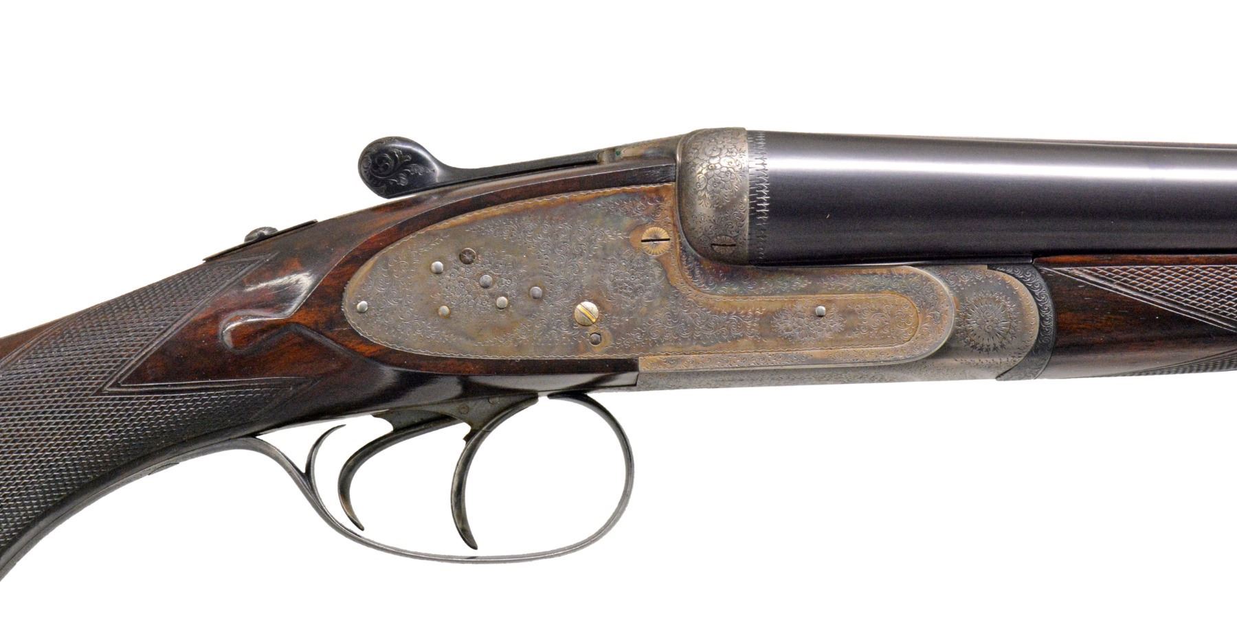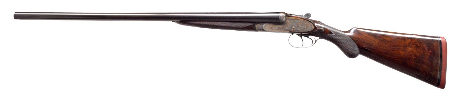 EJECTOR GAME GUN WITH CASE. Cal. 12 Ga., 2 1/2". S# 86203. Bbls. 26 1/8" dovetailed w/ slightly raised, matted & concave rib; is engraved "Aug. Francotte Bte" & "A. Liege" on tops. Bbl. flats & bottoms of bbls. are stamped w/ 1929 Belgian nitro proofs for 2 1/2" chambers. Crowned A & F stamps are also present. S# corresponds to a medium grade Francotte of 1929. The "8" appears to be added in front of the other numbers every place the S# appears, except where engraved on trigger guard tang. This was done at the factory before this gun was finished. The "Francotte Deluxe" sidelock, a "best" gun offered by A & F in 1933, featured chopper lump bbls. & side clips. Casehardened action of this gun features automatic safety, bushed strikers & hidden third fastener, along w/ gold line tumbler end cocking indicators & dbl. triggers, (front articulated). Action & sidelocks are engraved w/ 80% coverage lightly cut open scroll surrounding more deeply cut & superbly detailed rose bouquets w/ a horseshoe shaped rose & other bloom garland on bottom of action. Blued top lever & trigger guard are engraved to match. Dark, somewhat burl figured, European walnut rnd. knob pistol grip buttstock measures 14 1/8" over Silver type pad. Gun also features drop points & flat top point pattern checkering. Matching splinter Francotte type ejector forend has Anson release. Bore diameters: left - .725, choke .019 (mod), right - .724, choke .016 (mod). Wall thickness: left - .032, right - .032. DAC: 1 9/16". DAH: 2 1/2". Cast approx. 1/4" off. LOP: 14 1/8". WEIGHT: 6 lbs.13 oz. UNATTACHED ACCESSORIES: vintage, possibly original, tan leather case w/ brass corners, lined in scarlet velvet & has gold embossed Francotte label in lid. Case contains a pair of snap caps & a square oil bottle. Condition of case is fine w/ some scuffs & marks in leather. Handle is good. Interior cloth has some compressions & light soiling. Label is fine w/ some blue staining. CONDITION: very fine, appears to be all original. Bbls. retain nearly all of what appears to be original blue w/ only a few light handling marks. Action retains 60-70% original color, silvered on fences & beads, thinning on bottom. Lockplates retain nearly all of their original color. Top lever is silvered on thumbpiece. Trigger guard has blue thinning on edges & is silvered at grip. Stocks retain nearly all of what appears to be their original French polish finish, perhaps re polished a bit w/ addition of newer pad, checkering lightly worn. Bores are excellent. Chambers measure 2 11/16", so in proof for 2 1/2". Action is tight. Bbls. are on face. Ejectors are in time. This is a very fine gun in fine condition. (19-5441/MGM2). CURIO. $2,500-$3,500.