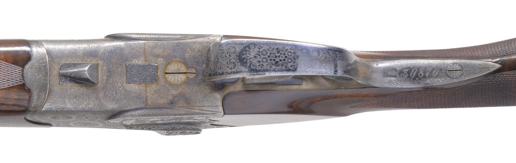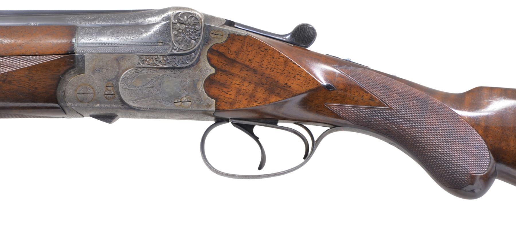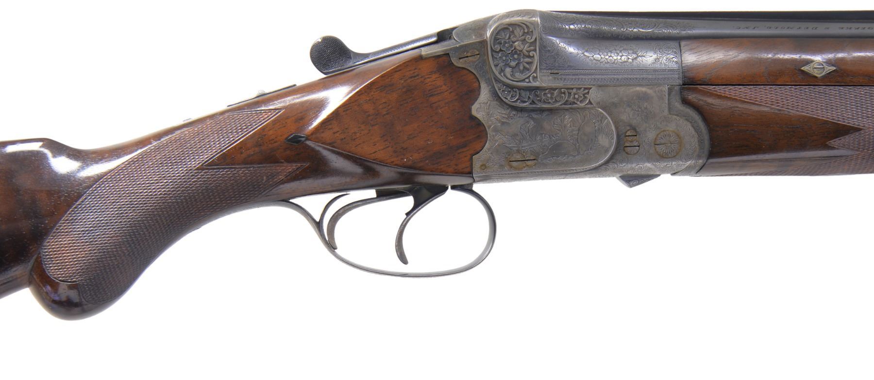 LIGHT GAME GUN. Cal. 20 Ga. 2 3/4". S# 30870. Bbls. 28" Demi-bloc w/ solid matted rib, are engraved "Von Lengerke & Detmold, Inc." & "New - York" on top bbl. either side of rib. Breech portion is nicely engraved in rose & scroll motif. Bottom bbl. marked "GERMANY" & "20 - 2 1/2"". Casehardened dbl. Kerston scallop-backed O/U action features automatic safety (SAFE inlaid in gold) & dbl. triggers (front articulated). Action is engraved w/ more rose & scroll surrounding nicely rendered game scenes portraying a nye of 4 pheasant resting in meadow on left & a group of quail (?) on right; three are feeding, two flushing over a rail fence. "Greifelt & Co Suhl" is under each game scene. Fences & reinforcing bolsters are beautifully relief engraved w/ blossoms & foliage. Blued trigger guard w/ more rose & scroll has S# on tang. Lightly figured & somewhat streaked European walnut rnd. knob pistol grip buttstock measures 14 1/8" over ribbed horn buttplate. There are inset horn diamonds at drop points & point pattern checkering is at grip. Matching 3 piece ejector forend has Anson type release. Bore diameters: top .627, choke .027 (full), bottom .627, choke .017 (mod). Wall thickness: top .032, bottom .032. DAC: 1 3/4". DAH: 2 3/4". Neutral cast. LOP: 14 1/8". WEIGHT: 5 lbs. 12 oz. CONDITION: near excellent, as partially & lightly refinished. Bbls. retain approx. 90% of what appears to be original blue w/ sharp edge wear along rib. Action retains 70-80% original casehardening color w/ relief engraving nicely highlighted by slight silvering of high spots. Trigger guard & top lever retain approx 80% of their original blue. Stocks lightly re-polished w/ a few subsequent marks, checkering competently freshened. Bores are very fine to excellent, bright & shiny throughout w/ a couple of sm. pings. Action is tight. Bbls. are on face. Ejectors are out of time. These beautiful lightweight little guns were offered by Abercrombie & Fitch in 1933 for $450.00. The same catalog offered CHE Parkers for $236.50. (19-5430/MGM6). CURIO. $2,500-3,500.