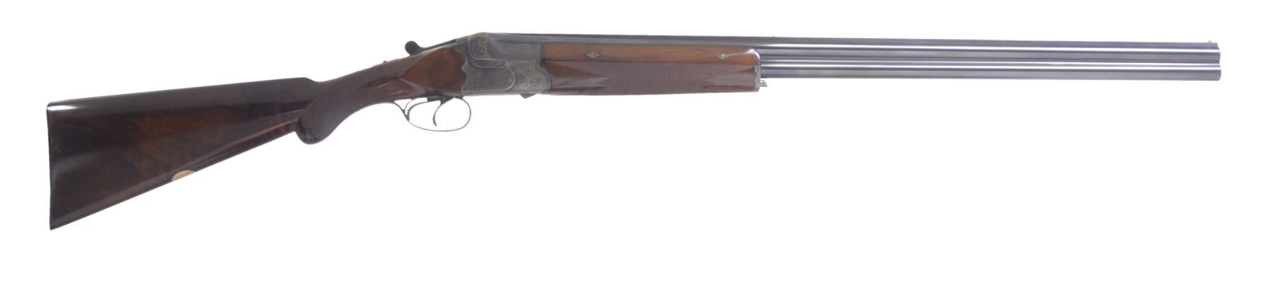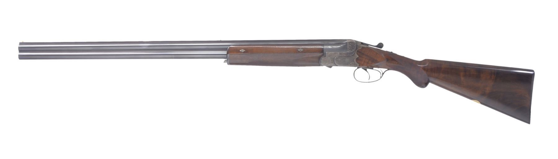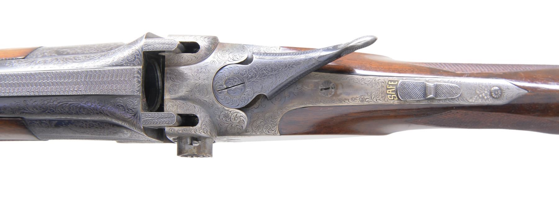 LIGHT GAME GUN. Cal. 20 Ga. 2 3/4". S# 30870. Bbls. 28" Demi-bloc w/ solid matted rib, are engraved "Von Lengerke & Detmold, Inc." & "New - York" on top bbl. either side of rib. Breech portion is nicely engraved in rose & scroll motif. Bottom bbl. marked "GERMANY" & "20 - 2 1/2"". Casehardened dbl. Kerston scallop-backed O/U action features automatic safety (SAFE inlaid in gold) & dbl. triggers (front articulated). Action is engraved w/ more rose & scroll surrounding nicely rendered game scenes portraying a nye of 4 pheasant resting in meadow on left & a group of quail (?) on right; three are feeding, two flushing over a rail fence. "Greifelt & Co Suhl" is under each game scene. Fences & reinforcing bolsters are beautifully relief engraved w/ blossoms & foliage. Blued trigger guard w/ more rose & scroll has S# on tang. Lightly figured & somewhat streaked European walnut rnd. knob pistol grip buttstock measures 14 1/8" over ribbed horn buttplate. There are inset horn diamonds at drop points & point pattern checkering is at grip. Matching 3 piece ejector forend has Anson type release. Bore diameters: top .627, choke .027 (full), bottom .627, choke .017 (mod). Wall thickness: top .032, bottom .032. DAC: 1 3/4". DAH: 2 3/4". Neutral cast. LOP: 14 1/8". WEIGHT: 5 lbs. 12 oz. CONDITION: near excellent, as partially & lightly refinished. Bbls. retain approx. 90% of what appears to be original blue w/ sharp edge wear along rib. Action retains 70-80% original casehardening color w/ relief engraving nicely highlighted by slight silvering of high spots. Trigger guard & top lever retain approx 80% of their original blue. Stocks lightly re-polished w/ a few subsequent marks, checkering competently freshened. Bores are very fine to excellent, bright & shiny throughout w/ a couple of sm. pings. Action is tight. Bbls. are on face. Ejectors are out of time. These beautiful lightweight little guns were offered by Abercrombie & Fitch in 1933 for $450.00. The same catalog offered CHE Parkers for $236.50. (19-5430/MGM6). CURIO. $2,500-3,500.