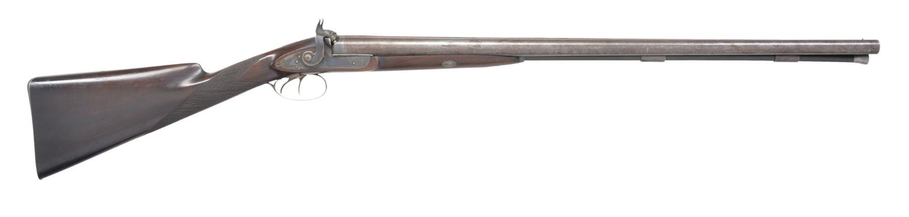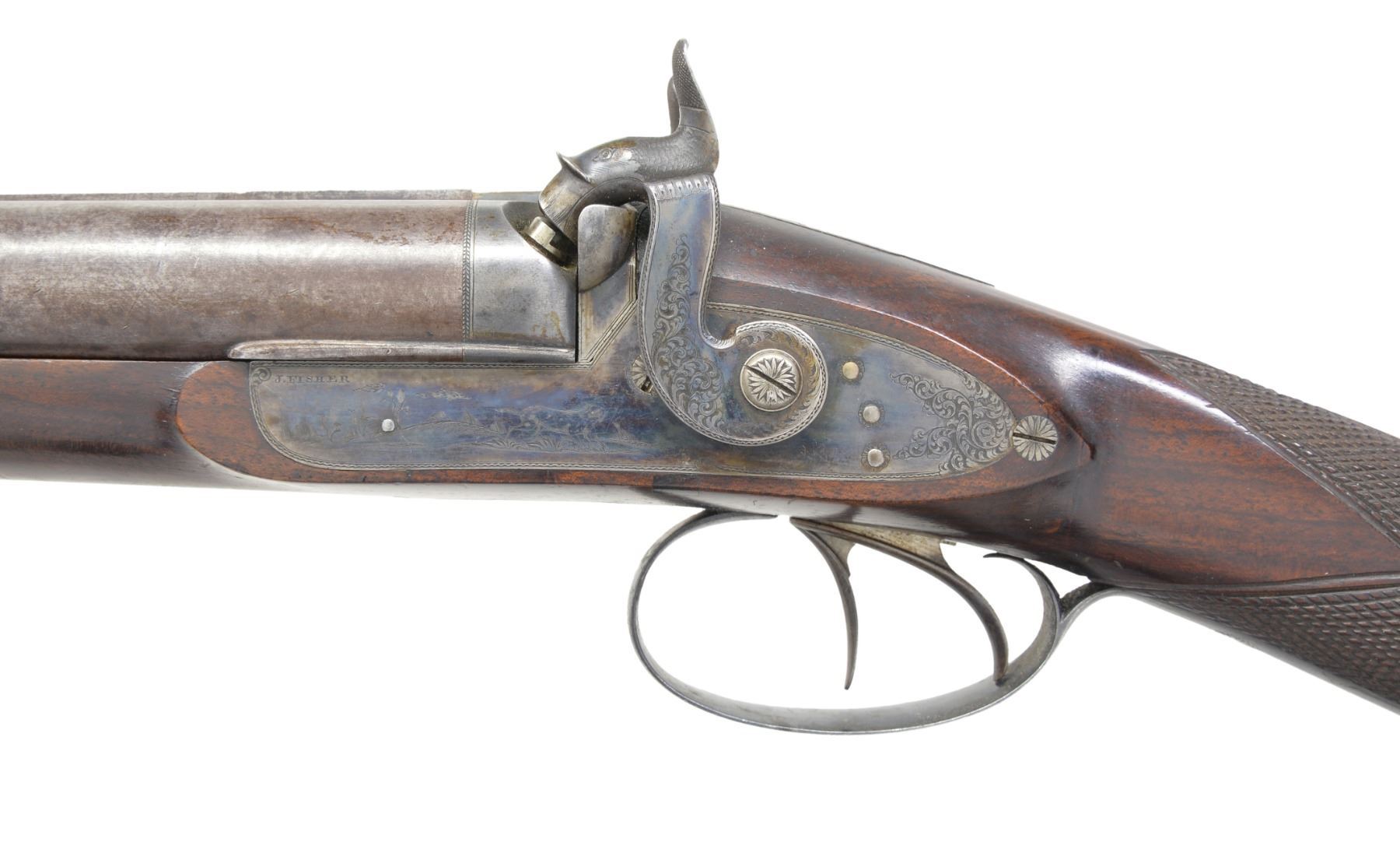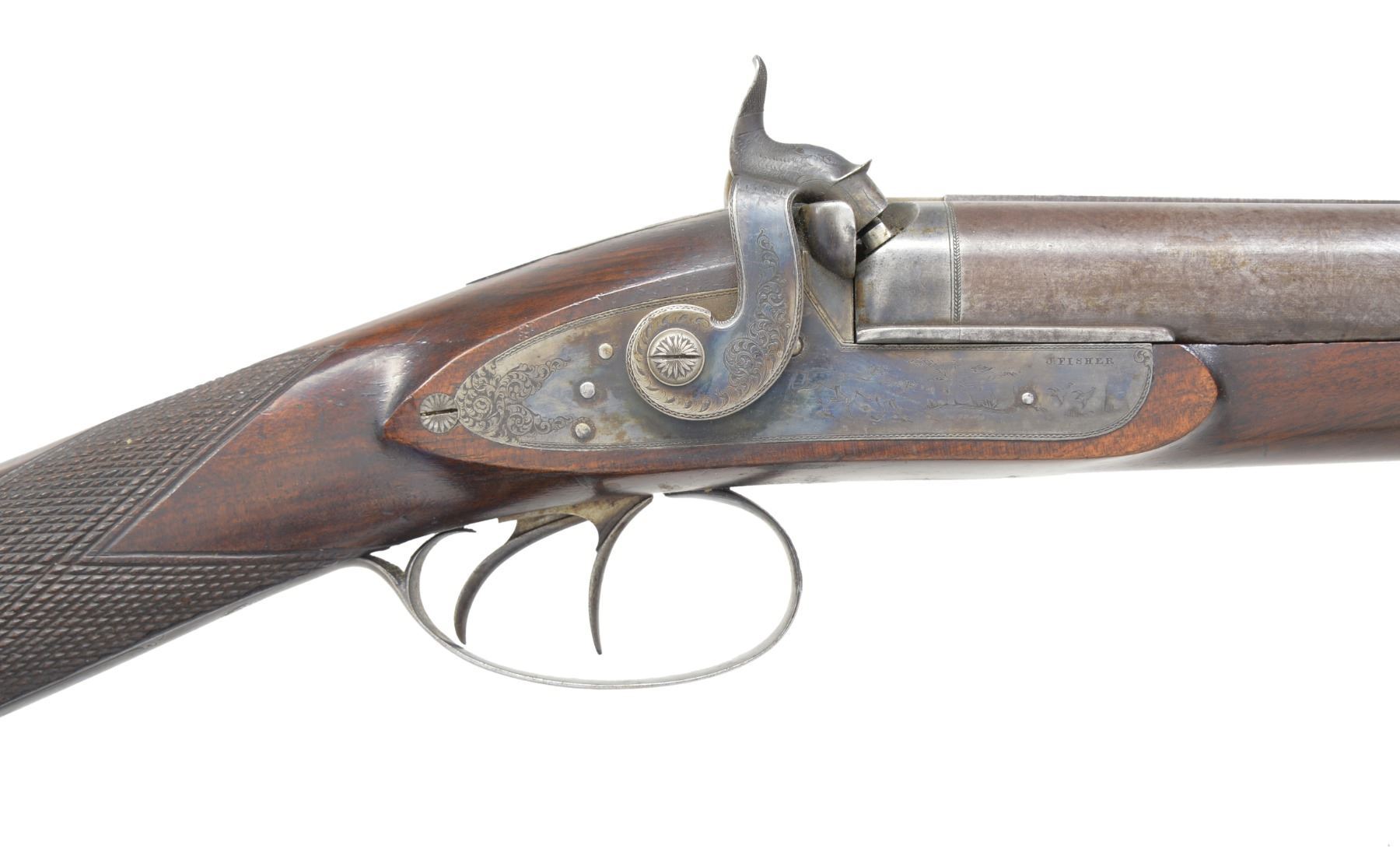 BY J. FISHER OF NEW YORK. Cal. 12 Bore. NSN. John Fisher worked in New York City between 1841 & 1850 as evidenced by this high quality gun, he was a very accomplished maker. 29" High quality Damascus bbls. are engraved "J. Fisher New. York." on broad concave rib. Bbl. flats are stamped w/ London black powder proofs. An ebony ramrod w/ steel tip & brass tail (worm under tail) is held by 2 plain pipes. Breech iron w/ integral fences is casehardened & very nicely scroll engraved. Front spring locks w/ flat faced serpentine hammers are engraved w/ sprays of well cut shaded scroll at tails & nicely detailed game scenes toward front; dogs are pointing birds on both sides. "J. FISHER" is at the front of each lockplate. Lockplates are held in stock by usual screw as well as secondary screws at tails into wood, a seldom seen feature. Stock appears to be of American walnut measuring 14" over blued steel buttplate w/ long scroll engraved top tang. Widely spaced point pattern checkering is at grip. Trigger plate has stylized pineapple finial & blued trigger guard has dog scene on bow. Bbls. attach to stock w/ side bolt through oval steel escutcheons. Bore diameters: left - .739, .000 (cyl), right - .736, .000 (cyl). Wall thickness: left - .032, right - .038. DAC: 1 1/2". DAH: 2 5/16". Cast is neutral. LOP: 14". WEIGHT: 8 lbs. 1 oz. CONDITION: bbls. retain 60-70% original brown w/ fine definition to pattern w/ some scattered staining done by cleaning. Locks & other casehardened parts retain over 85% of their color. Buttplate & trigger guard retain most of their original blue. Stock has nearly all of its original oil finish w/ a number of scratches & marks. Bores are shiny w/ some frosting toward muzzles. Locks are crisp. Rear portion of rib has lifted for about 3". An attractive American gun. (01-17179/MGM44). ANTIQUE. $1,200-1,800.