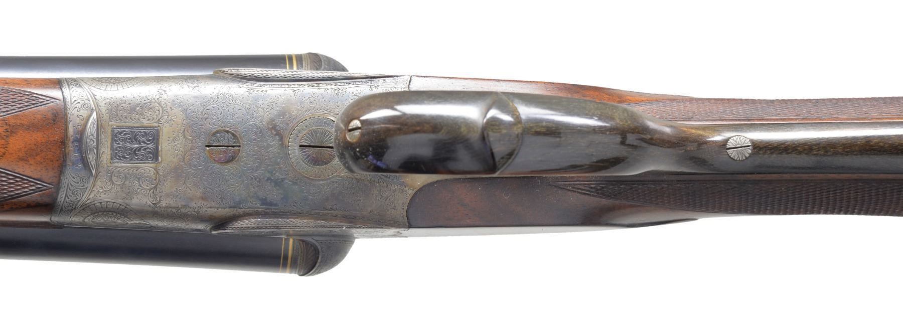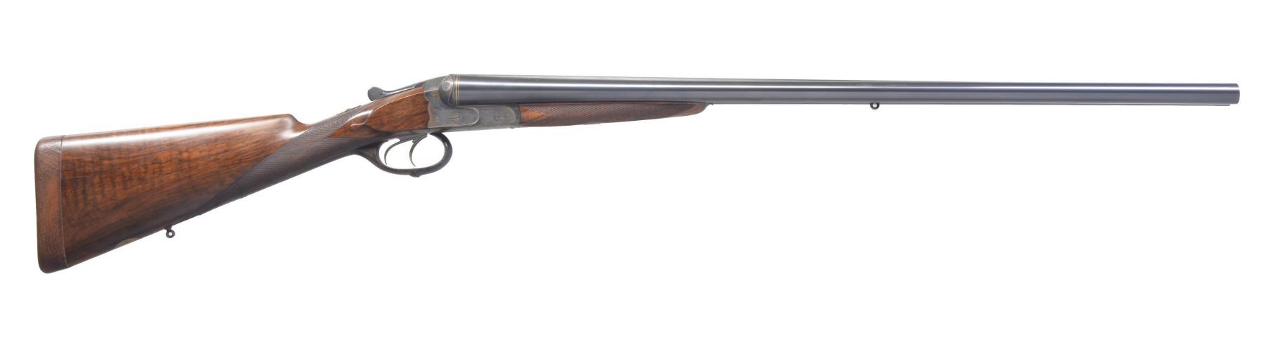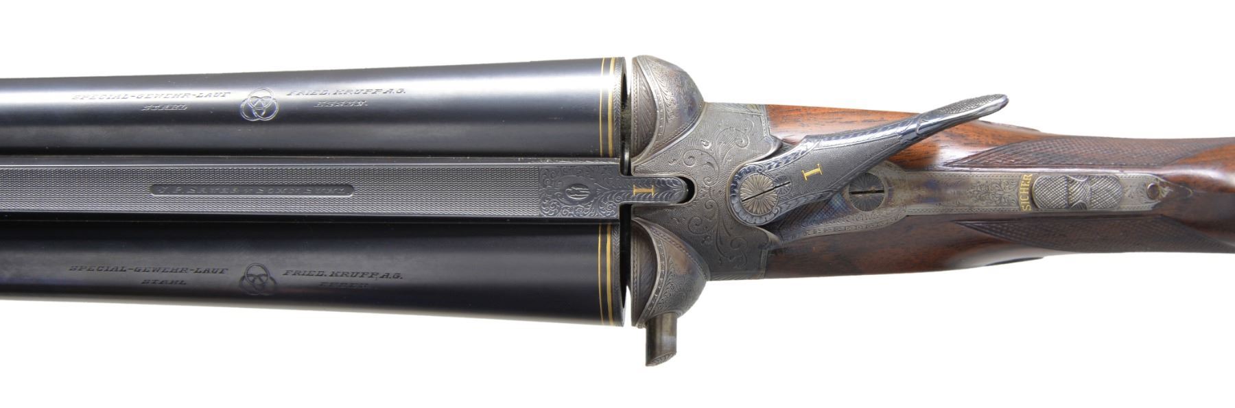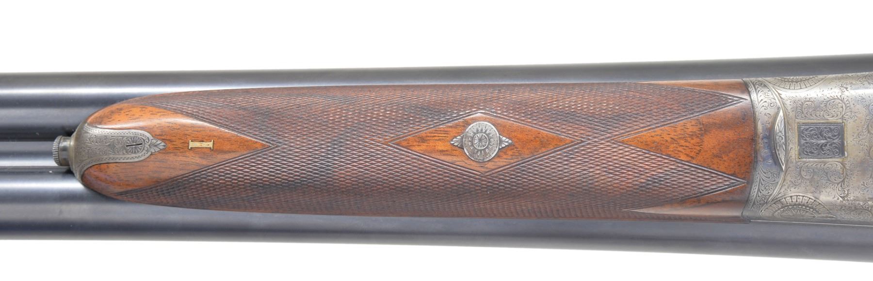 GAME GUN SPECIALLY FINISHED FOR ERNEST LOUIS, LAST GRAND DUKE OF HESSE-DARMSTADT BY LOUIS DELP, HOFBUCHSENMACHER. Cal. 12 Ga. S# 193445. Bbls. 29 1/8" shoe lump w/ nicely matted concave game rib are engraved "J. P. Sauer & Sohn Suhl" on rib. Tops of bbls. are engraved w/ Krupp special steel 3 ring logos. Inlaid gold lines at breech end. Crossbolt rib extension is inlaid "I", as gun is No. 1 of a pair. ("II" is also in this auction) w/ "I" on top lever & forend tip. Bbl. flats are stamped w/ Prussian nitro proofs & w/ crown. A sling eye is screwed to bottom rib. Casehardened boxlock action features automatic safety & dbl. triggers (front articulated), along w/ a crossbolt third fastener. Action & bbls. procured from Sauer were finished & engraved by Delp w/ distinctive ogee back to action. Engraving consists of 80% coverage varying size scroll w/ geometric borders. Top of action has lg. open scroll in matted background. "LOUIS DELP HOFBUCHSENMACHER" is in oval on left side of action & "IN. DARMSTARDT" is in similar device on right. Trigger guard is of horn. Nicely fiddle figured & lightly veined European walnut straight grip buttstock measures 14" over brown leather covered pad. Stock features drop points & point pattern checkering at grip. A sling eye is on toeline along w/ gold oval engraved w/ monogram "EL" flanked by date "19" "13" all surmounted by a sovereigns crown. (The mother of Ernest Louis was Princess Alice, the second daughter of Queen Victoria & Albert. She died in 1878 & Ernest Louis spent much of his childhood w/ the Queen in England. (A complete history is in provenance.) Matching splinter ejector forend has Anson release. Bore diameter: left - .724, choke .036 (full), right - .727, choke .023 (mod). Wall thickness: left - .034, right - .032. DAC: 1 9/16". DAH: 2 1/2". Cast about 1/4" off. LOP: 14". WEIGHT: 6 lbs. 14 oz. CONDITION: very close to new. Bbls. retain over 97% original blue w/ just a hint of high edge wear. Action retains over 90% original casehardening color, slightly silvered on fences & beads. Top lever thumb piece is slightly silvered. Stocks retain nearly all of what appears to be their original finish, perhaps lightly freshened w/ added oil at time of installation of newer pad. Checkering also shows light freshening. Bores are excellent. Action is tight. Bbls. are on face. Ejectors are very slightly out of time. An unusual & elegant gun. (19-5438/MGM8). CURIO. $4,000-6,000.