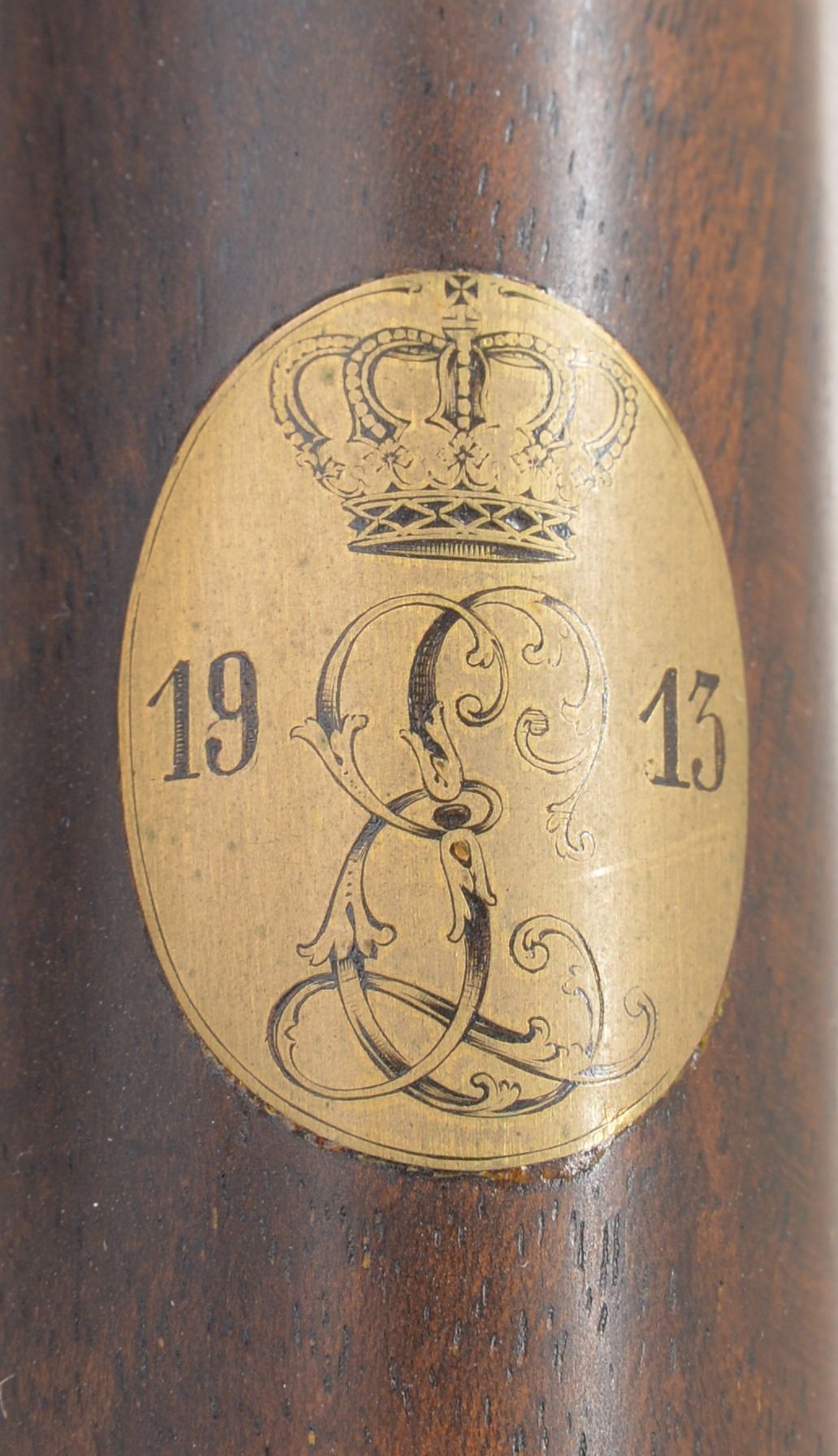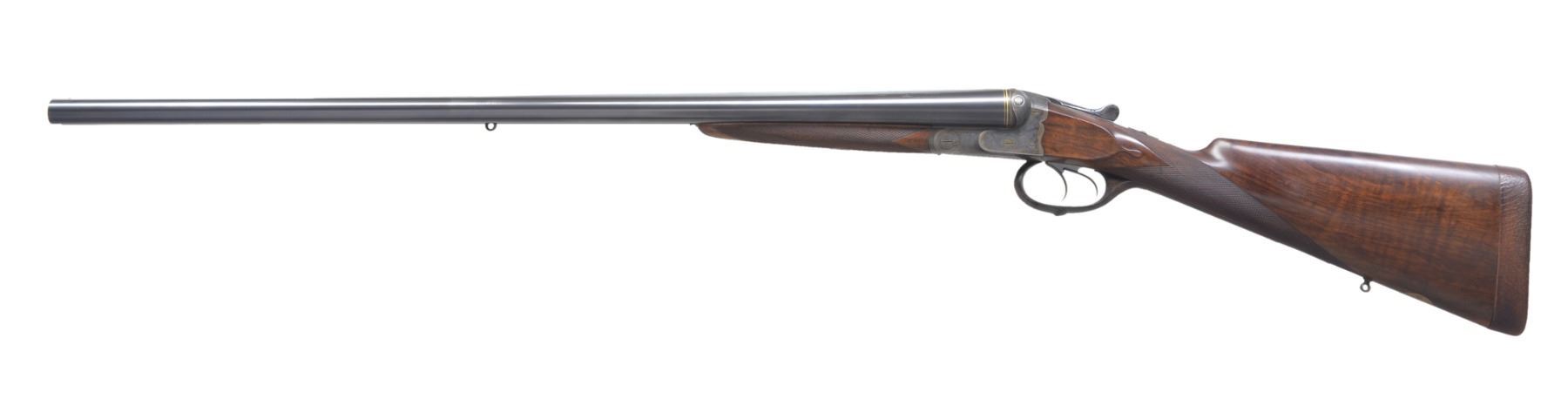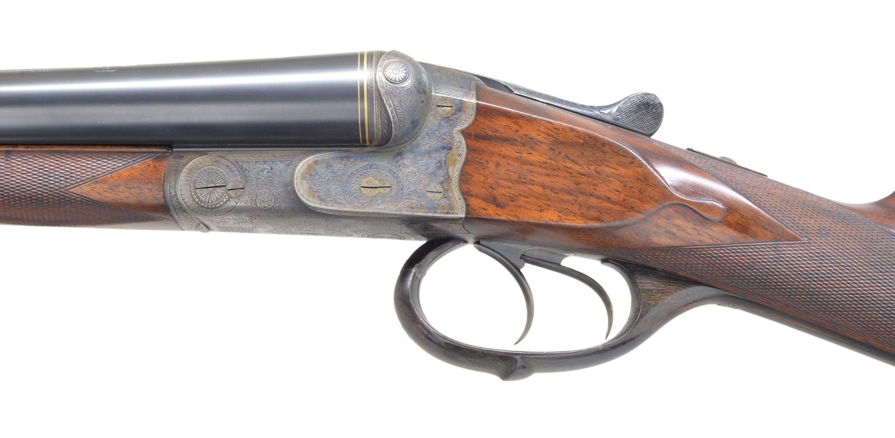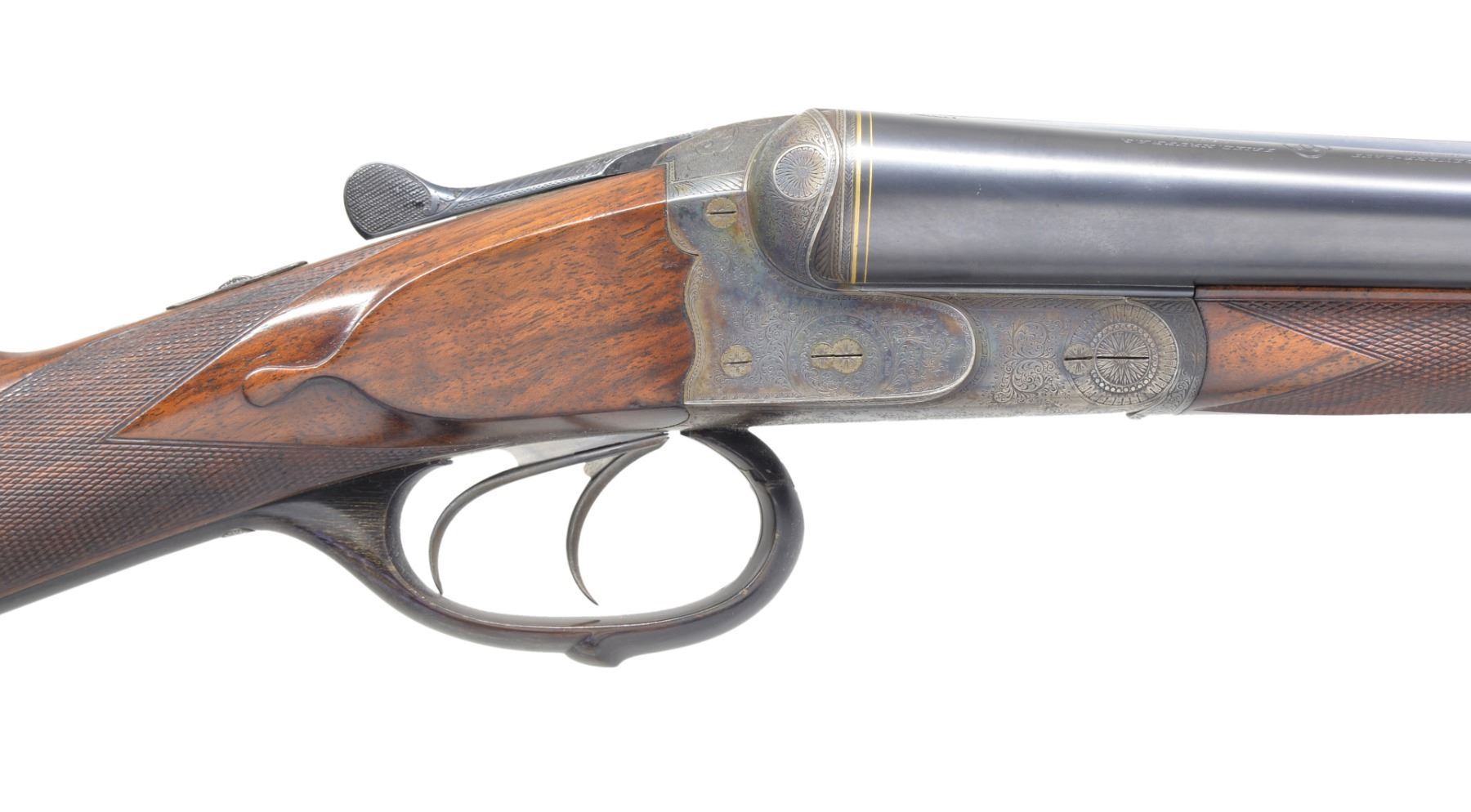 GAME GUN SPECIALLY FINISHED FOR ERNEST LOUIS, LAST GRAND DUKE OF HESSE-DARMSTADT BY LOUIS DELP, HOFBUCHSENMACHER. Cal. 12 Ga. S# 193445. Bbls. 29 1/8" shoe lump w/ nicely matted concave game rib are engraved "J. P. Sauer & Sohn Suhl" on rib. Tops of bbls. are engraved w/ Krupp special steel 3 ring logos. Inlaid gold lines at breech end. Crossbolt rib extension is inlaid "I", as gun is No. 1 of a pair. ("II" is also in this auction) w/ "I" on top lever & forend tip. Bbl. flats are stamped w/ Prussian nitro proofs & w/ crown. A sling eye is screwed to bottom rib. Casehardened boxlock action features automatic safety & dbl. triggers (front articulated), along w/ a crossbolt third fastener. Action & bbls. procured from Sauer were finished & engraved by Delp w/ distinctive ogee back to action. Engraving consists of 80% coverage varying size scroll w/ geometric borders. Top of action has lg. open scroll in matted background. "LOUIS DELP HOFBUCHSENMACHER" is in oval on left side of action & "IN. DARMSTARDT" is in similar device on right. Trigger guard is of horn. Nicely fiddle figured & lightly veined European walnut straight grip buttstock measures 14" over brown leather covered pad. Stock features drop points & point pattern checkering at grip. A sling eye is on toeline along w/ gold oval engraved w/ monogram "EL" flanked by date "19" "13" all surmounted by a sovereigns crown. (The mother of Ernest Louis was Princess Alice, the second daughter of Queen Victoria & Albert. She died in 1878 & Ernest Louis spent much of his childhood w/ the Queen in England. (A complete history is in provenance.) Matching splinter ejector forend has Anson release. Bore diameter: left - .724, choke .036 (full), right - .727, choke .023 (mod). Wall thickness: left - .034, right - .032. DAC: 1 9/16". DAH: 2 1/2". Cast about 1/4" off. LOP: 14". WEIGHT: 6 lbs. 14 oz. CONDITION: very close to new. Bbls. retain over 97% original blue w/ just a hint of high edge wear. Action retains over 90% original casehardening color, slightly silvered on fences & beads. Top lever thumb piece is slightly silvered. Stocks retain nearly all of what appears to be their original finish, perhaps lightly freshened w/ added oil at time of installation of newer pad. Checkering also shows light freshening. Bores are excellent. Action is tight. Bbls. are on face. Ejectors are very slightly out of time. An unusual & elegant gun. (19-5438/MGM8). CURIO. $4,000-6,000.