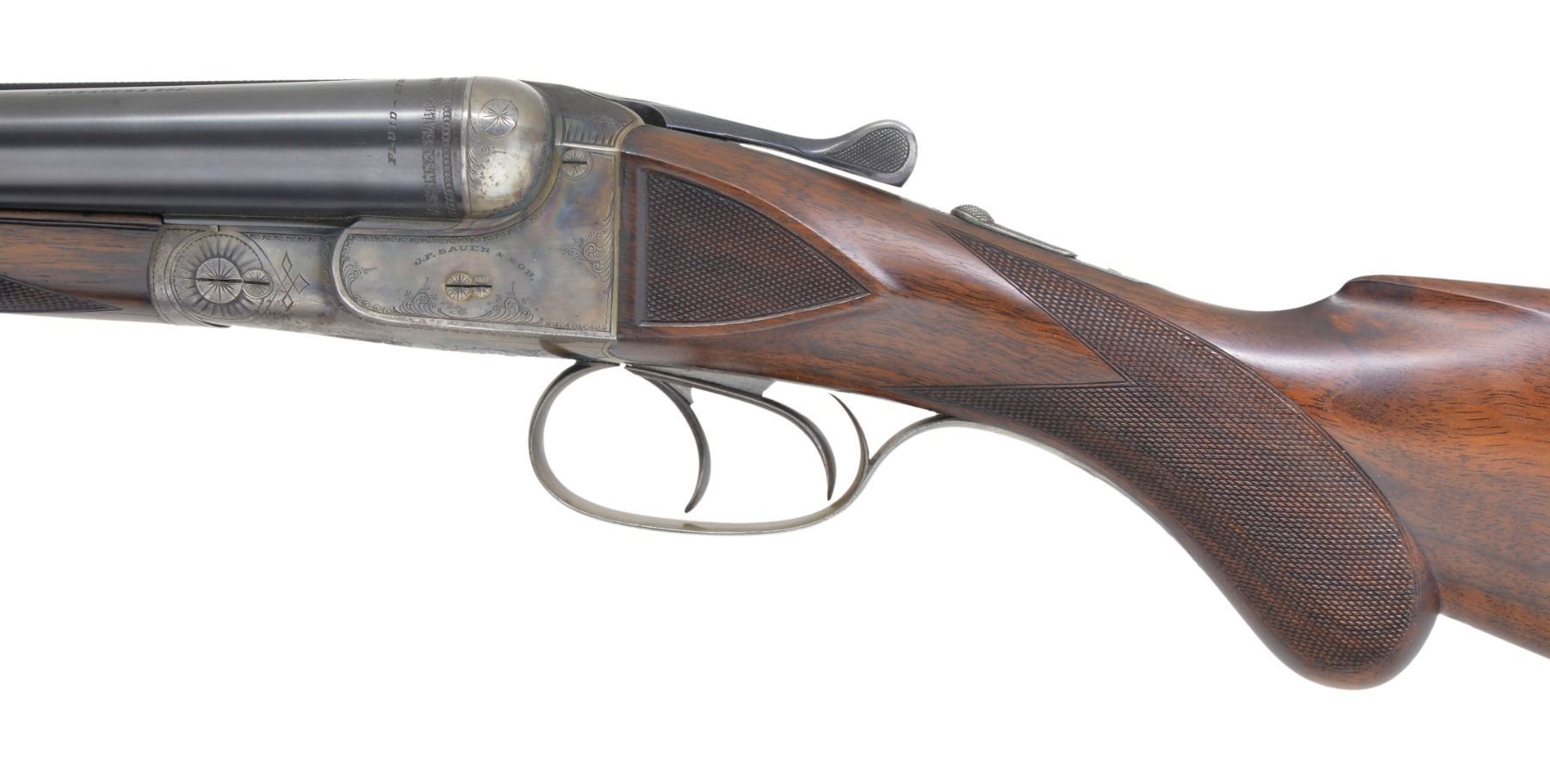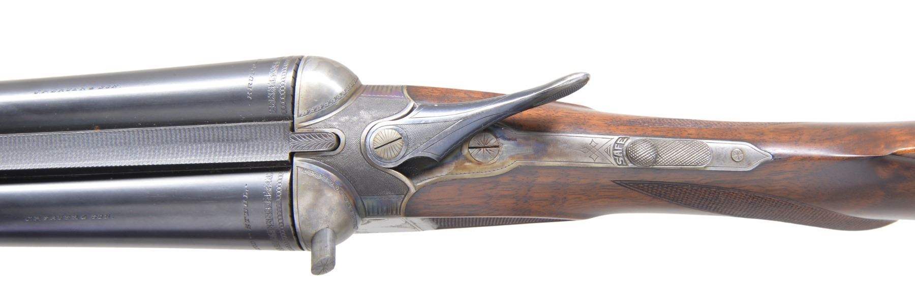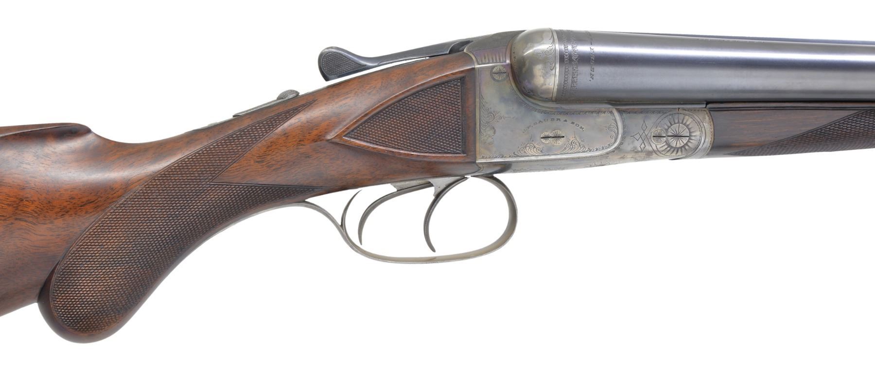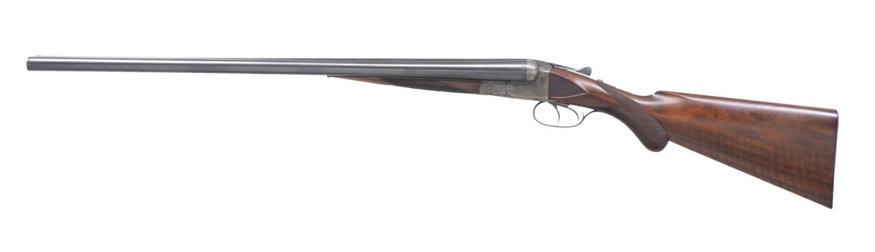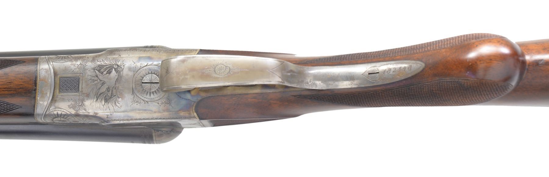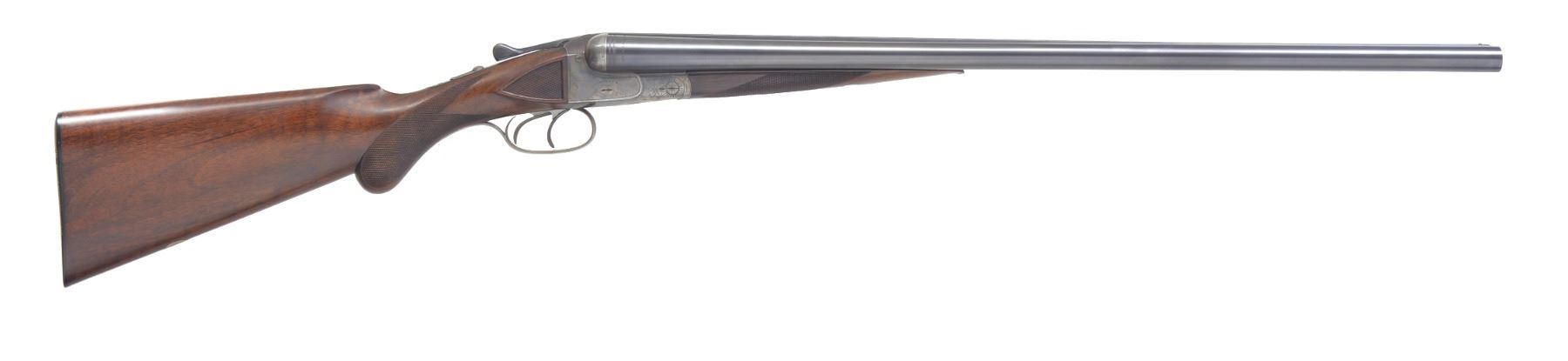 Cal. 12 Ga., 2 1/2". S# 182548. Bbls. 26" w/ shoe lump, are fitted w/ slightly swamped matted, concave rib. Makers name & "FLUID STEEL" "ESSEN" are on each bbl. Bbl. flats are stamped w/ Imperial German nitro proofs & "PRUSSIA". Casehardened boxlock action features automatic safety, crossbolt third fastener & dbl. triggers. Action is engraved w/ 30% coverage splashes of scroll w/in line & scroll borders. Makers name is on each side. Trigger plate is engraved w/ semi relief scene of duck flushing from marsh. This game scene is the hallmark of this grade. Trigger guard has S# on tang. Lightly fiddle figured European walnut rnd. knob pistol grip buttstock measures 14 1/4" over ribbed horn buttplate. Side panels are checkered & point pattern checkering is at grip. A vacant sm. German silver oval is on toeline. Matching splinter ejector forend has Deeley release. Bore diameters: left - .724, choke .036 (full), right - .725, choke .004 (IC). Wall thickness: left .013 (6" area on side, 7"-13" back from muzzle, remainder over .025). (There is no evidence of any dent removal, etc.; this is how this lightweight gun was made.) right - .024. DAC: 1 9/16". DAH: 2 1/2". Neutral cast. LOP: 14 1/4". WEIGHT: 6 lbs. 2 oz. CONDITION: very fine, w/ some light refinishing. Bbls. have nearly all their original blue w/ some light browning & frosting toward left muzzle. Original damascening on breech ends. Action retains 70-80% original casehardening color w/ some brown splotches around bottom. Thumb piece & trigger guard tang somewhat silvered. Stocks lightly refinished, checkering cleaned. Bores are excellent, bright & shiny. Action is tight. Bbls. are on face. Ejectors are strong & in time. This grade retailed for $175.00 in 1933. (19-5437/MGM10). CURIO. $600-900.