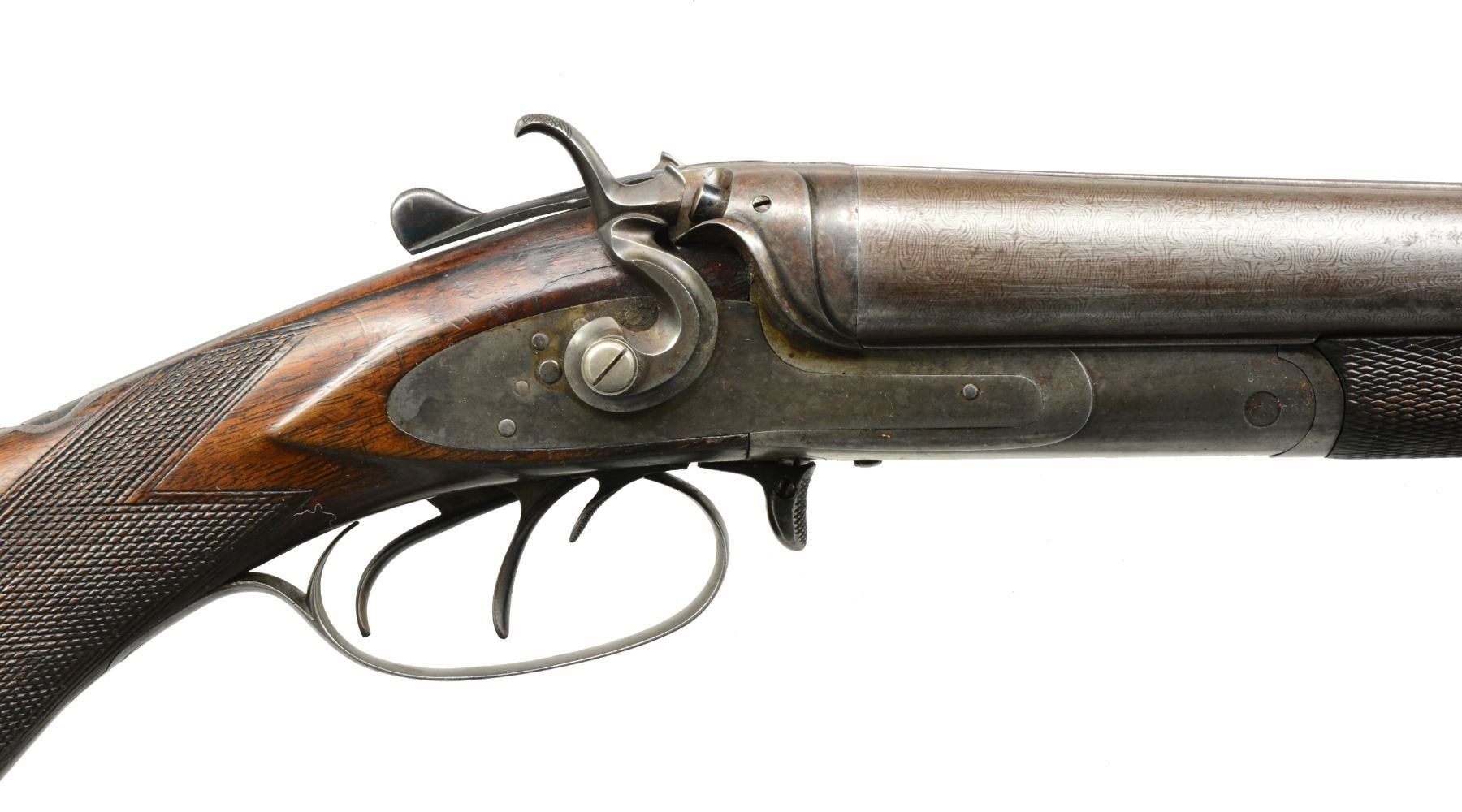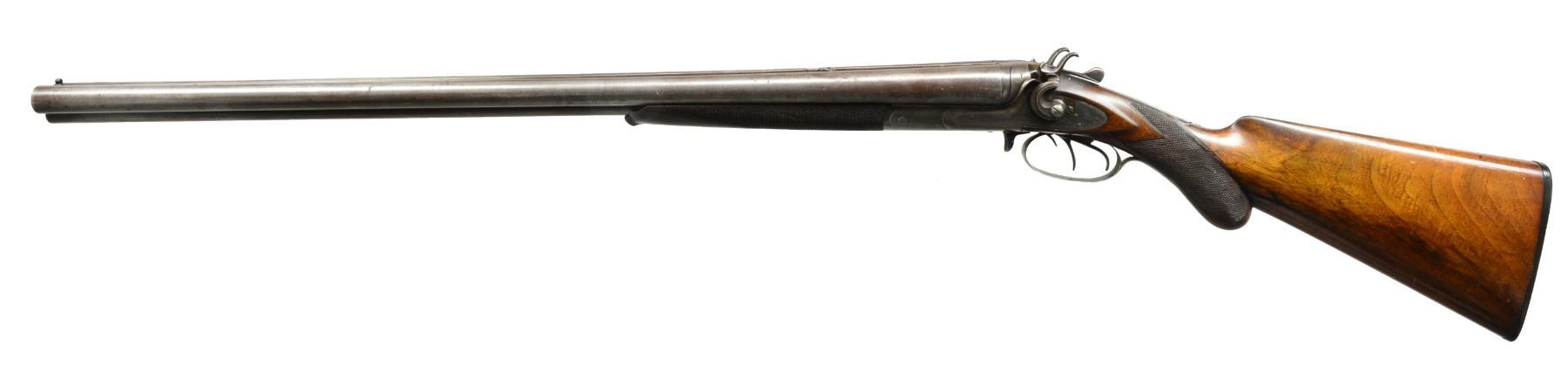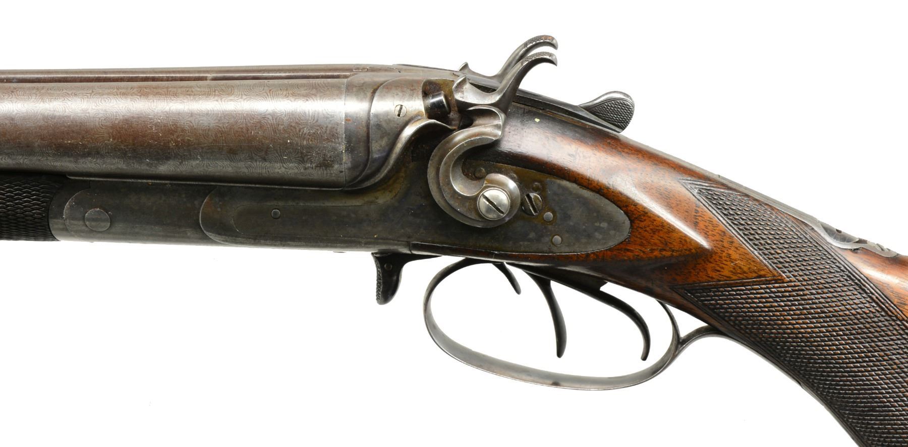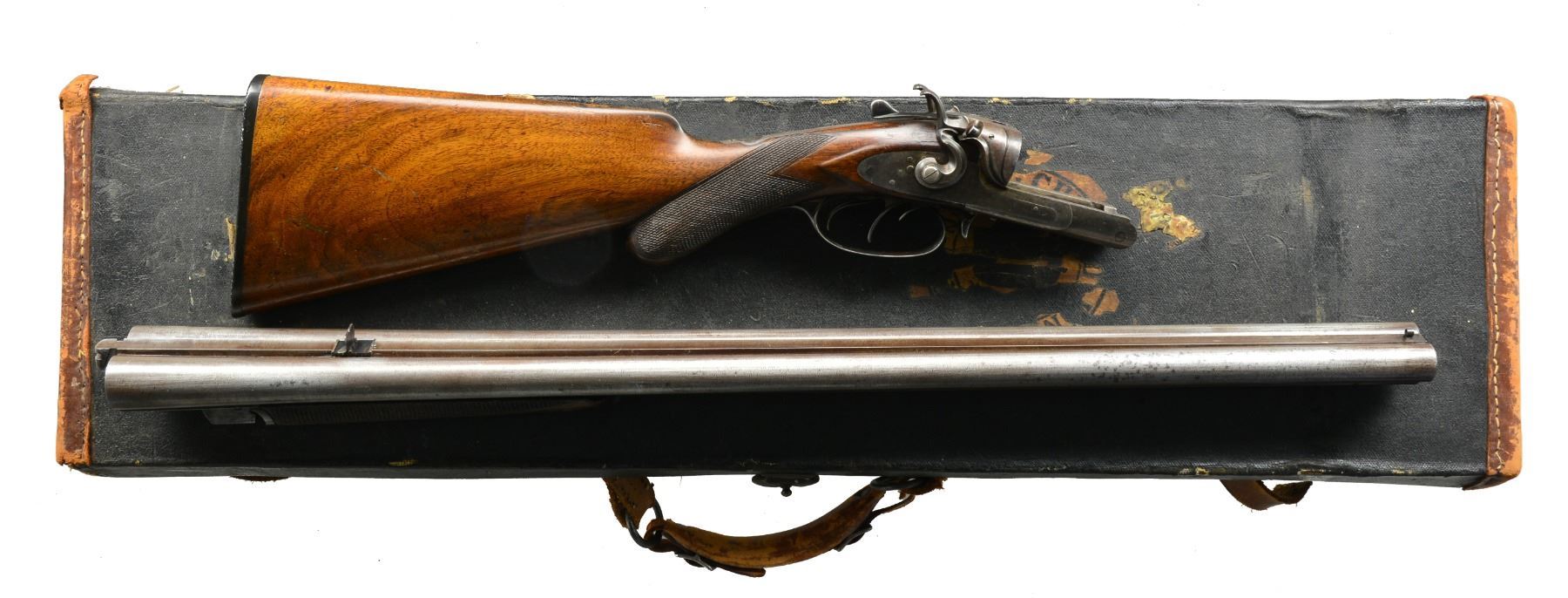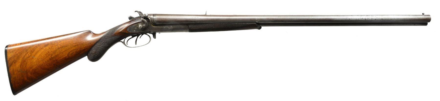 MADE 3 BARREL HAMMER GUN WITH CASE. Cal. 12 Ga. x 12 Ga. x 38-55. NSN. Made shortly after David Kirkwood dissolved his partnership w/ Mortimer, this gun is unnumbered so predates numbering system established ca. 1883. 28" Fine Damascus shot bbls. & steel rifle bbl. are stamped "D KIRKWOOD" "BOSTON" on rear portion of concave game rib. Rib is fitted w/ 2 folding leaf rear sight & hollow bead front. There are no Kirkwood proofs on bottoms of bbls. Birmingham provisional proofs are on shotgun bbls. Casehardened rnd. bodied action is fitted w/ front spring locks w/ nicely sculpted rebounding hammers. Fences are also nicely filed. Top tang is fitted w/ Kirkwood's special concealed rear sight "Adapted for Fine Target Shooting, Regulated for Distance & w/ Wind Gauge". This was a $15.00 option added to the base price of the 3 bbl. hammer gun of $135.00. ca 1885. Action & locks are devoid of any engraving. The only locking bolt is Kirkwood's sliding bolt which engages a square shouldered dolls head rib extension. Rifle bbl. is cocked by a checkered slide in front of trigger guard & fired by a sm. third trigger at the right side front trigger guard bow. Lightly marbled European walnut rnd. knob pistol grip buttstock measures 13 3/4" over checkered & ribbed hard rubber buttplate. Point pattern checkering is at grip. Matching splinter forend has inset shaped hard rubber tip & sugar tong type friction release. Bore diameters: left - .729, choke .023 (mod), right - .726, choke .015 (lt mod). Wall thickness: left - .035, right - .030. DAC: 1 3/4". DAH: 3 1/4". Cast approx. 1/2" off. LOP: 13 3/4". WEIGHT: 8 lbs. 8 oz. UNATTACHED ACCESSORIES: vintage leather trimmed black oilcloth case is lined in scarlet felt & contains BGI roll crimper, shot & powder dipper & an unmarked but high quality holder for shot shell heads. CONDITION: "as found". Bbls. retain perhaps as much as 50% original bbl. brown, most loss due to cleaning of scattered areas w/ some light pitting. Rear sight still w/ considerable temper blue. Action retains 20-30% casehardening color, mostly where protected. Lockplates retain over 80% of their original color, stronger on left plate. Firing pins & top lever retain most of their original blue as does trigger guard. Stocks retain over 80% original oil finish w/ numerous marks, both light & heavy, checkering lightly worn. Original buttplate has 1958 sticker w/ description & price of $45.00. Bores are bright & shiny w/ 1 or 2 pits in right bbl. Rifle bore is shiny w/ strong rifling throughout w/ a couple of sm. pits toward breech end. Action is tight. Bbls. are on face. Locks are crisp. Rifle lock should be brought to 1/2 cock before opening gun. Case has numerous marks & scuffs & has remnants of old steamship labels, handle partially detached, 1 strap broken. Interior is soiled, partitions detached. Accessories are good. (01-17177/MGM41). ANTIQUE. $2,500-4,500.