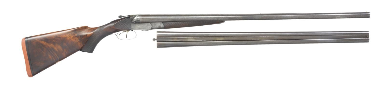 WITH 2 SETS OF BARRELS. Cal. 12 Ga. S# 987. Both bbl. sets are engraved "D. KIRKWOOD BOSTON" on slightly raised game ribs. 30" Set appears to be original to the gun, & is of high grade 3 stripe Damascus. Bbl. flats are stamped "D KIRKWOOD" & w/ 1880 patent date. Bottoms of bbls. have Kirkwood's proof w/ remnants of Birmingham provisional proofs. 28" Set appears to be made later by Kirkwood & bbls. are of exceptional, ultra fine mottled Damascus. Belgian proofs on bbl. flats. Both bbl. sets have later type dovetailed through steel bottoms to rear lumps as an attempt to remedy this wear point in earlier guns. Loops are also of Kirkwood's adj. type. Boxlock action features automatic safety (safe position being denoted by a gold band). Action also features Kirkwood's usual square shouldered dolls head dovetail rib extension w/ sliding bolt fastener as well as nickel plated dbl. triggers w/ finger blades checkered. Action is filed w/ Kirkwood's typical dramatic flutes on fences & is engraved w/ geometric borders. "D. KIRKWOOD" is on each side. Steel trigger guard has S# on tang which extends to sunburst horn grip cap. European walnut pistol grip stock is nicely stump figured & measures 13 7/8" over old Silver type pad. Side panels are checkered & top fronts of both sides were filled in at the factory where cocking indicators were either removed or not wanted by the customer who ordered this gun. Point pattern checkering is at grip & a gold oval on toeline is engraved "F. W. P." Matching splinter forend w/ snap off release is near full checkered at rear & has tip of hard rubber w/ raised decoration. 30" Bbls: bore diameters: left - .760, choke .046 (extra full), right - .754, choke .030 (full). Wall thickness: left - .020, right - .016. 28" Bbls: bore diameters: left - .722, choke .014 (mod), right -.724, choke .008 (IC). Wall thickness: left - .028, right - .022. 30" Bbls: DAC: 1 1/2". DAH: 3". Cast approx. 1/4" off. LOP: 14 1/8". WEIGHT: 6 lbs. 13 oz.. UNATTACHED ACCESSORIES: extra set of bbls. CONDITION: bbls. retain 70-80% original Damascus finish. 28" Bbls. are considerably stronger, perhaps 90%. Action retains 10-20% original casehardening color, mostly where protected. Stocks have most of an old oil refinish over a few deep marks. Checkering gummed. Grip cap has chips. Pad not well fit & petrified. Bores are bright & shiny. Action is tight w/ both bbl. sets. 28" Bbls. have chambers lengthened to over 2 3/4". A good example of these very interesting guns. (01-17162/MGM21). ANTIQUE. $1,500-2,500.