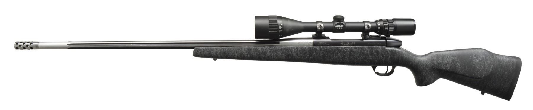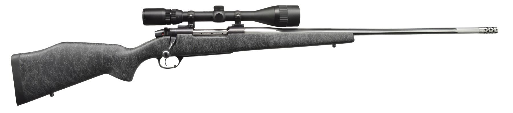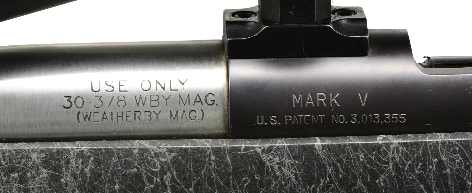 Cal. 30-378 Wby. Mag. S# SB035839. Bbl. 28" free floated of fluted stainless steel w/ Accubrake. 9 Locking lug Mark V action. LXX trigger. Hand laminated Monte Carlo cheekpiece composite stock w/ matte gelcoat finish & spider web accents. LOP: 13 1/2" over H-S Precision solid black pad. Millett 6-18x40 AO matte finished scope w/ duplex reticle on 2 piece mts. Weight w/ scope: 9 lbs., 14.9 oz. CONDITION: near excellent retaining over 98% finish. Near excellent bore. Scope has clear optics. (20-312/DS). MODERN. $1,500-2,000.