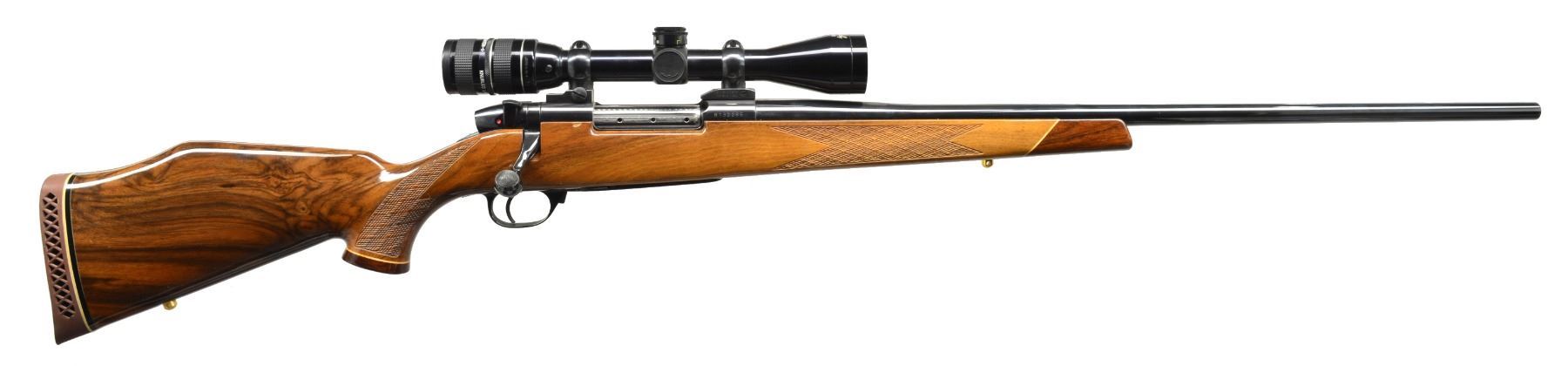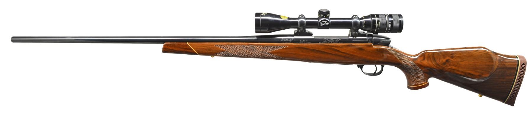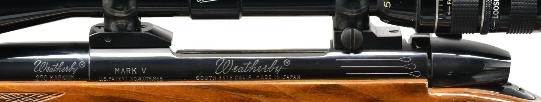 Cal. 270 Wby. Mag. S# H132286. Bbl. 26" w/out sights. Mark V action w/ 9 locking lugs & 2 panel checkered bolt knob. Floorplate is marked "WEATHERBY CUSTOM". Weatherby Premier 3X-9X40 gloss finished wide field scope w/ duplex reticle on Buehler mts. Monte Carlo cheekpiece stock of fancy Claro walnut w/ contrasting forearm tip & grip cap having light wood spacers. Stock features skip line checkering & gold anodized swivel bases. LOP: 13 3/8" over original Weatherby pad. Weight: 9 lbs. 13.2 oz. Mfg. in Japan. CONDITION: 99% metal finish. Stock shows a few very sm. marks. Very good bore. Scope has clear optics. (20-318/DS). MODERN. $1,250-1,750.