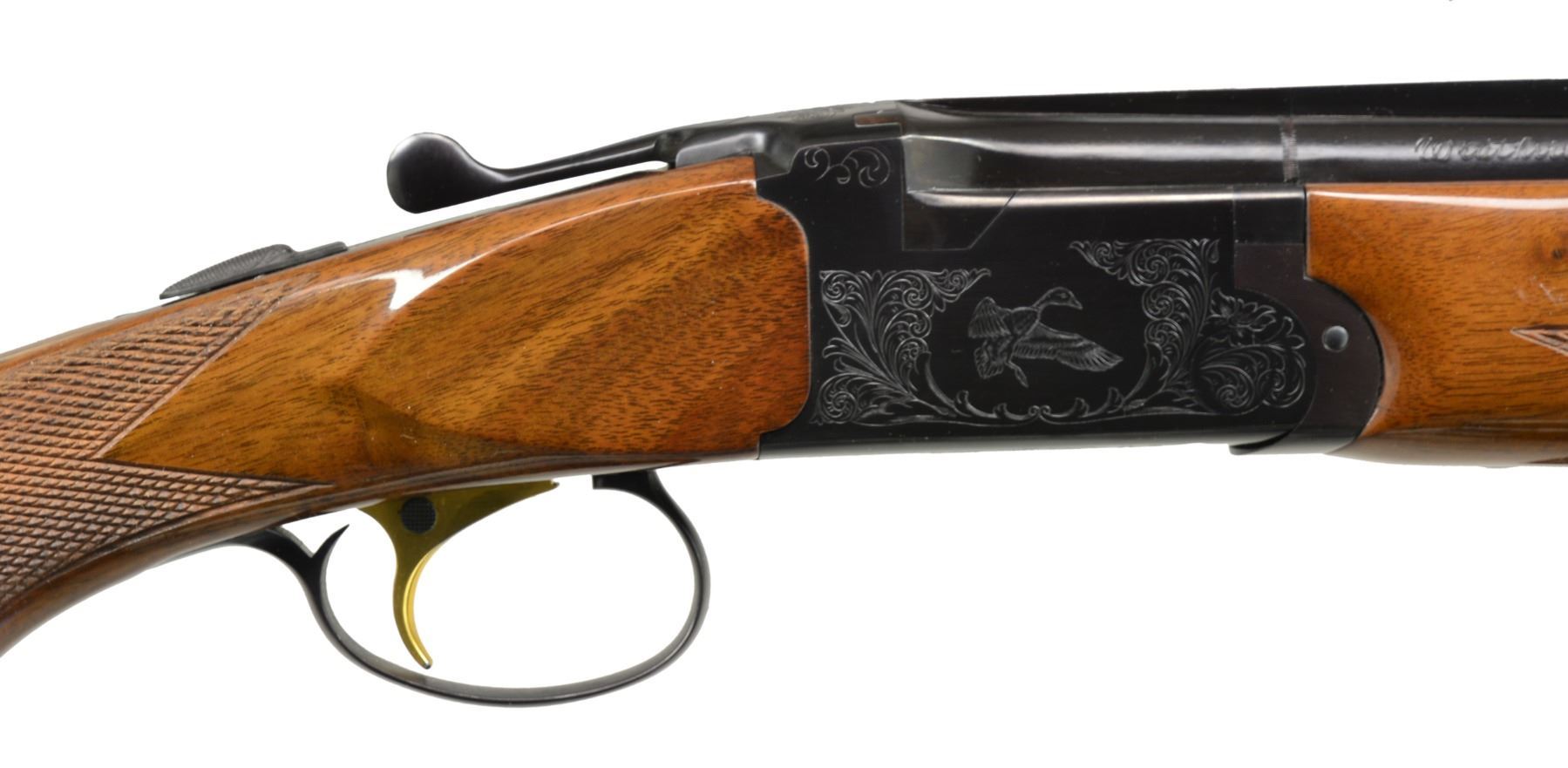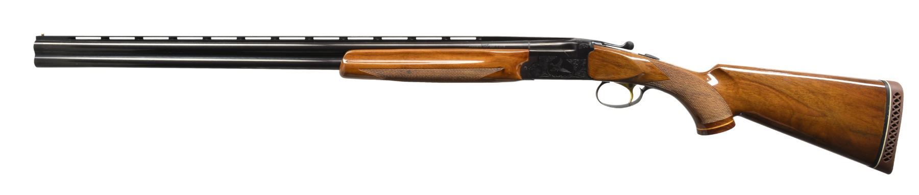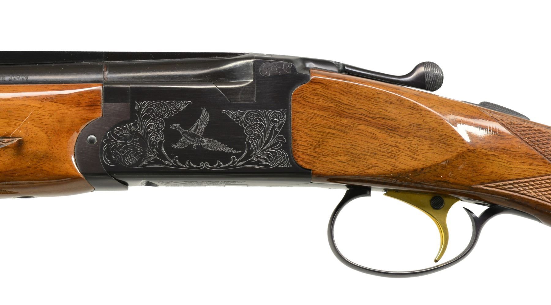 Cal. 20 Ga., 3". S# GN03369. Bbls. 28" VR w/ brass front bead. Fitted for interchangeable chokes; Imp. Cyl,. Mod. & Full included. Blued boxlock action w/ scroll ornamentation featuring flying mallard on right side & flying pheasant on left side. Gold plated SST. Selective ejectors. Field style forearm & pistol grip stock of gloss finished walnut w/ cut checkering. Pistol grip has contrasting spacer to rosewood grip cap w/ diamond inlay. LOP: 14 1/4" over Weatherby pad. Mfg. in Japan by SKB. UNATTACHED ACCESSORIES: original foam lined box containing owner's manual & spare choke. CONDITION: near excellent retaining over 98% metal finish. Stock shows mild finish checking. Bright near excellent bores. (20-1368/DS). MODERN. $800-1,200.