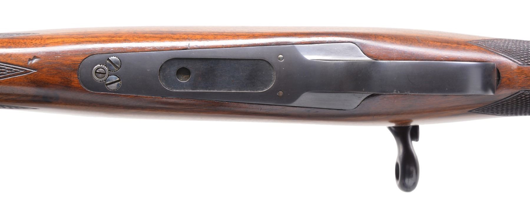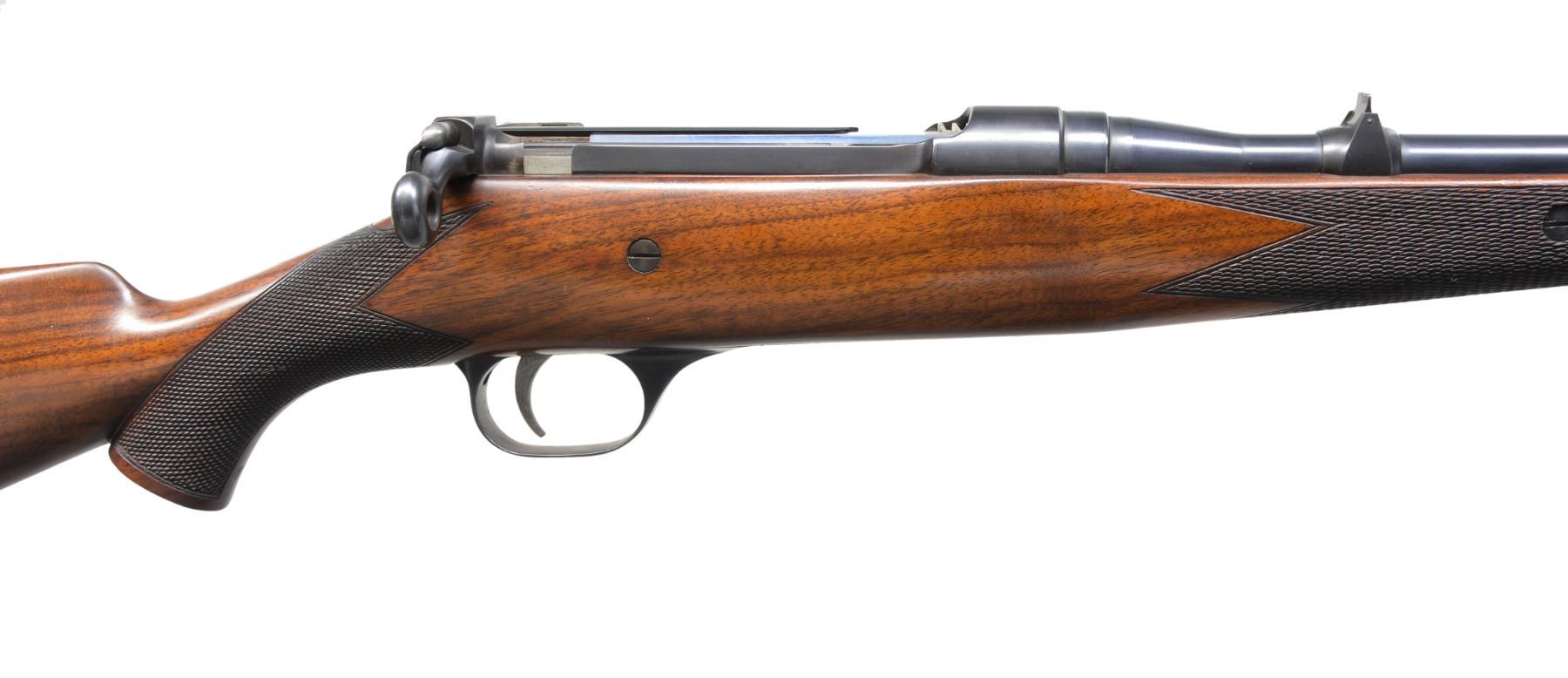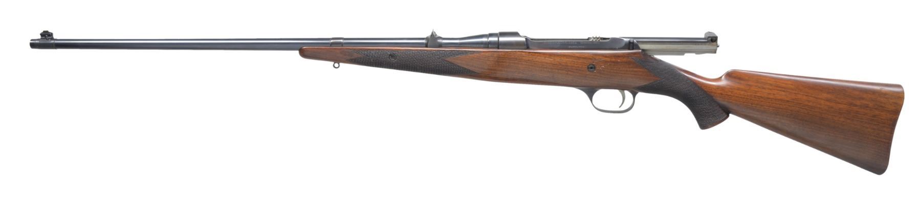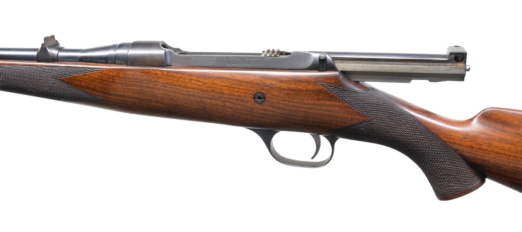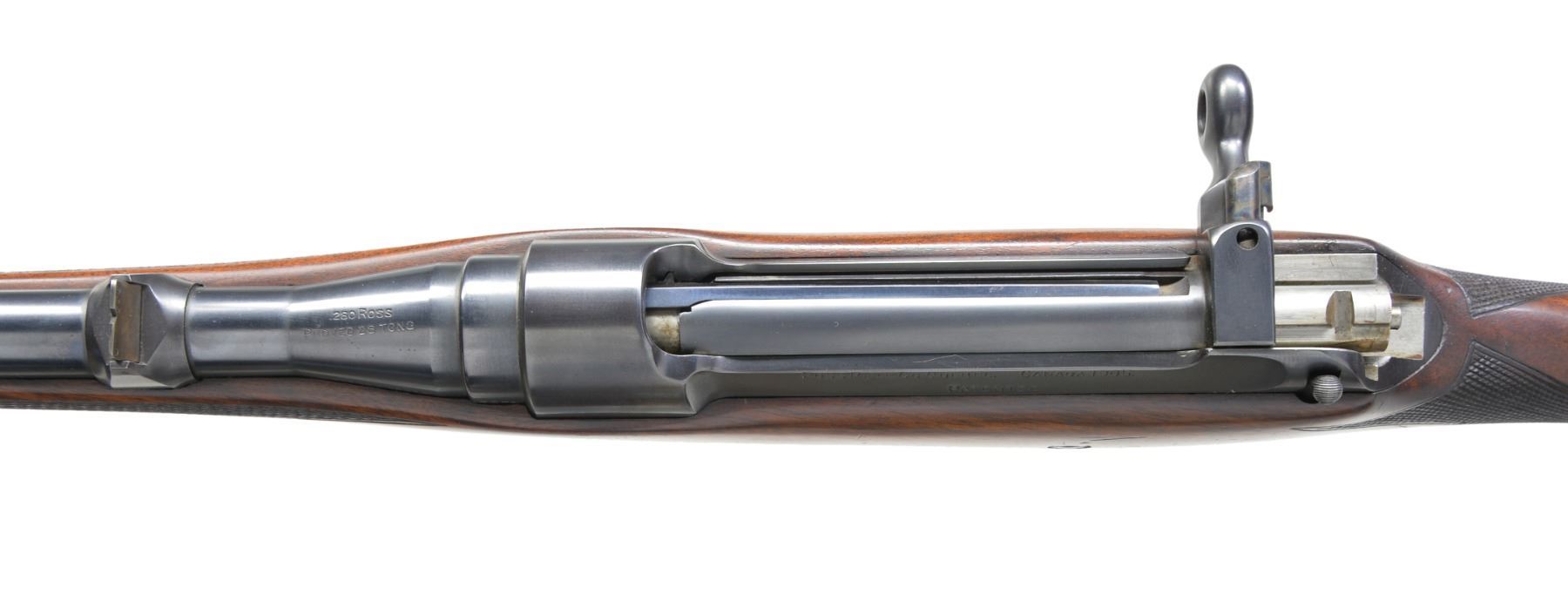 STALKING PATTERN RIFLE. Cal. 280 Ross. S# 7074. Based on the Ross 1905 action, this rifle is a transition to the later Model 10. In the Model 1905 the interrupted screw thread bolt locks horizontally. (Supposedly this model could not be incorrectly assembled, resulting in the bolt blowing out.). This later example w/out mag. cutoff lever has 25 1/2" bbl. (scarce) w/ single standing leaf rear sight & front sight bead held by two screws. Pistol grip stock of relatively plain European walnut measures 14 1/2" over checkered wood butt. Stock is checkered in point pattern at grip & forend. CONDITION: near new. All metal parts retain 95% + original finish w/ bright temper blue on extractor. Stock retains nearly all of its original oil finish w/ a few scattered marks, mostly on left side of action area. Bore is excellent w/ sharp rifling throughout. (19-5472/MGM3). CURIO. $1,000-1,800.