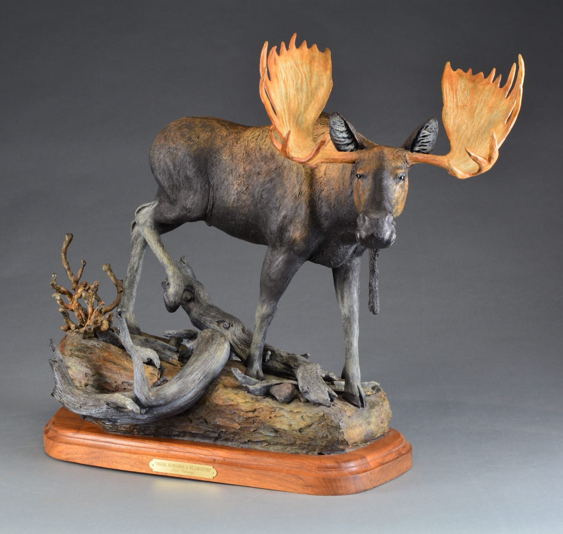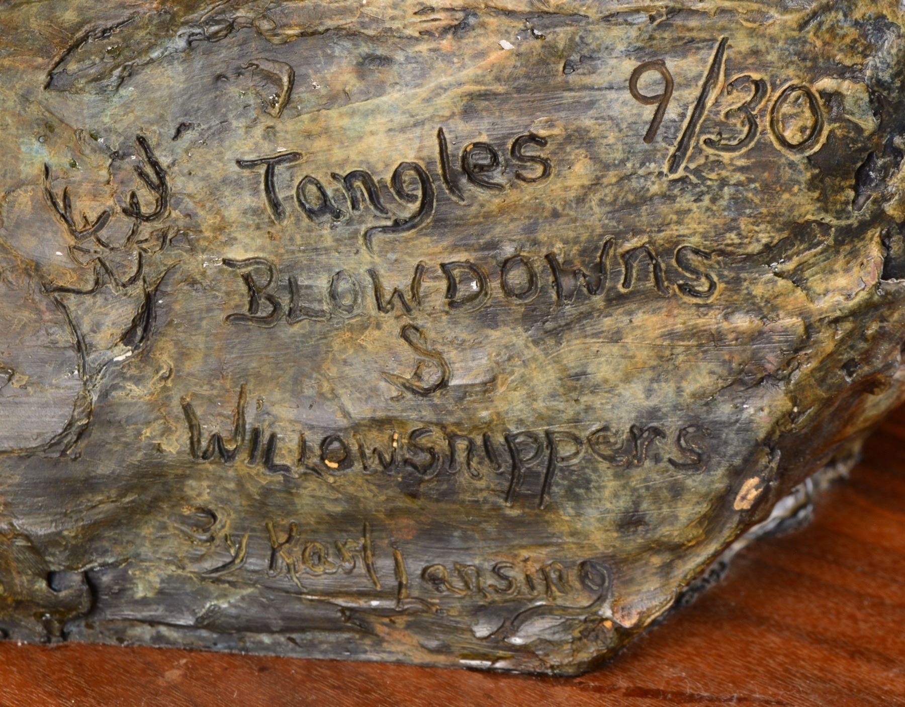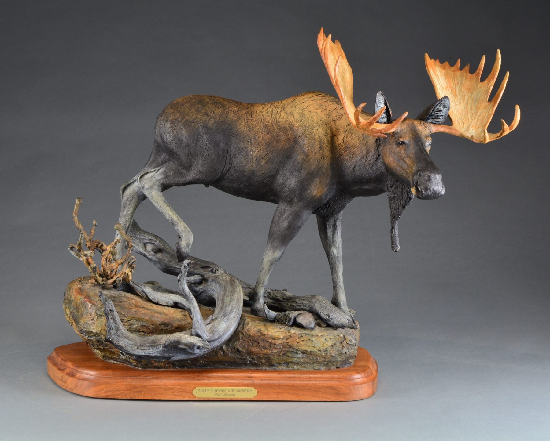 "TANGLES, BLOWDOWNS & WILLOWSNIPPERS". Visually stunning, finely detailed bull moose walking in tangled wooded terrain. Karl Lansing specializes in big game sculptures & wildlife sculptures from North America & Africa along w/ sporting sculptures of dogs, owls & upland game. Sculpture marked on rear of bronze base w/ deer head logo "Tangles, Blowdowns & Willowsnippers by Karl Lansing & is sculpture 9 of 30 produced. Walnut base w/ brass plaque. SIZE: Approx. 36" l x 17" w x 28" h. Approx. 85lbs on swivel base. CONDITION: very nice condition overall. Walnut base has several very sm. scattered handling marks. (02-13474/RW). $4,000-6,000.