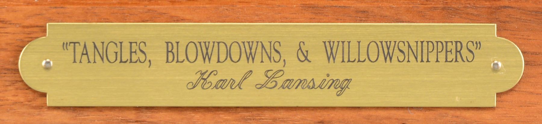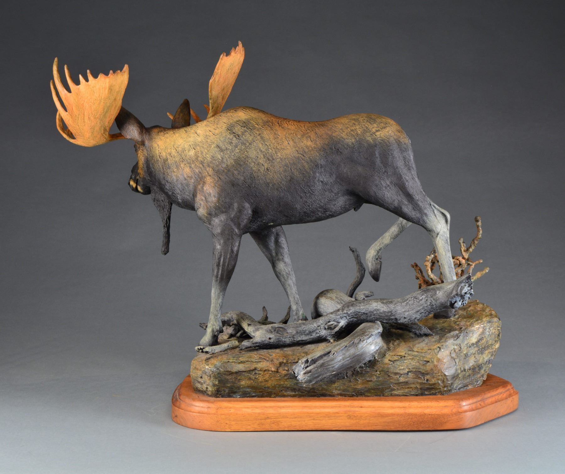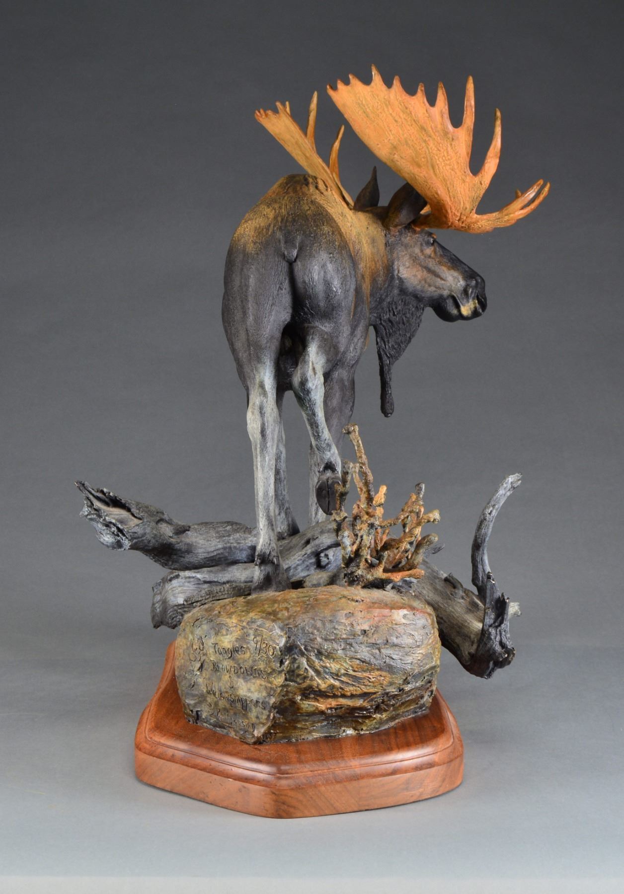 "TANGLES, BLOWDOWNS & WILLOWSNIPPERS". Visually stunning, finely detailed bull moose walking in tangled wooded terrain. Karl Lansing specializes in big game sculptures & wildlife sculptures from North America & Africa along w/ sporting sculptures of dogs, owls & upland game. Sculpture marked on rear of bronze base w/ deer head logo "Tangles, Blowdowns & Willowsnippers by Karl Lansing & is sculpture 9 of 30 produced. Walnut base w/ brass plaque. SIZE: Approx. 36" l x 17" w x 28" h. Approx. 85lbs on swivel base. CONDITION: very nice condition overall. Walnut base has several very sm. scattered handling marks. (02-13474/RW). $4,000-6,000.