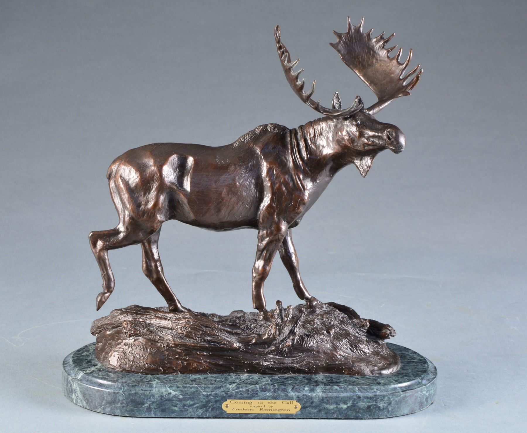 FREDERICK REMINGTON. Depiction of a rutting bull moose responding to a challenge. Overall height is 15". Overall statue length is 12". Base 14 3/4" by 7" by 1 1/4" oval. Base is green toned granite style finish on metal base. Brass plaque on base & statue base are both marked "Inspired by Frederick Remington". CONDITION: very fine. (02-13735/DS). $400-700.