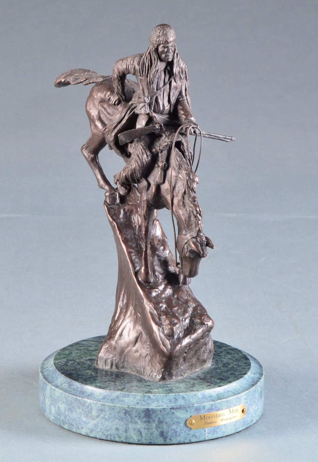 Depicts buckskin clad mountain man on horseback descending a steep mountain slope. The frontiersman's flintlock rifle, Bowie knife & powder horn are clearly visible. Statue is marked "Copywrite by Frederick Remington". Overall height is 10 3/4". Statue is mounted on a 6" diameter rnd. base w/ green toned granite style finish on metal base. Front of base has brass plaque marked "Mountain Man / Frederick Remington". CONDITION: very fine. (02-13736/DS). $400-700.