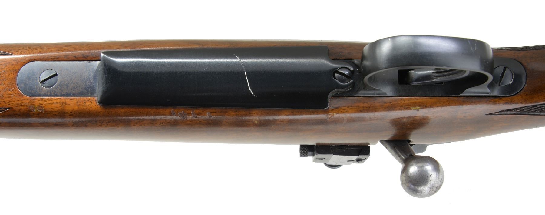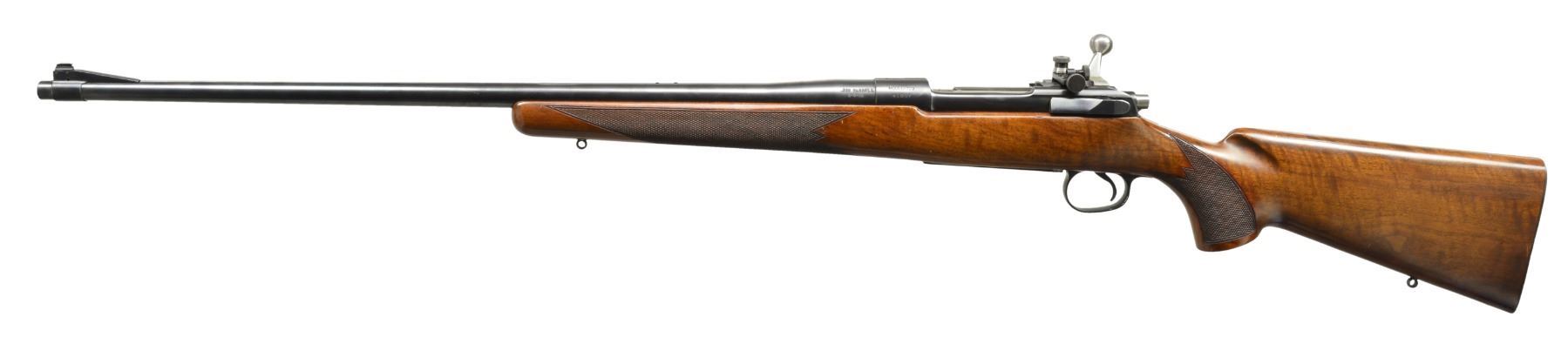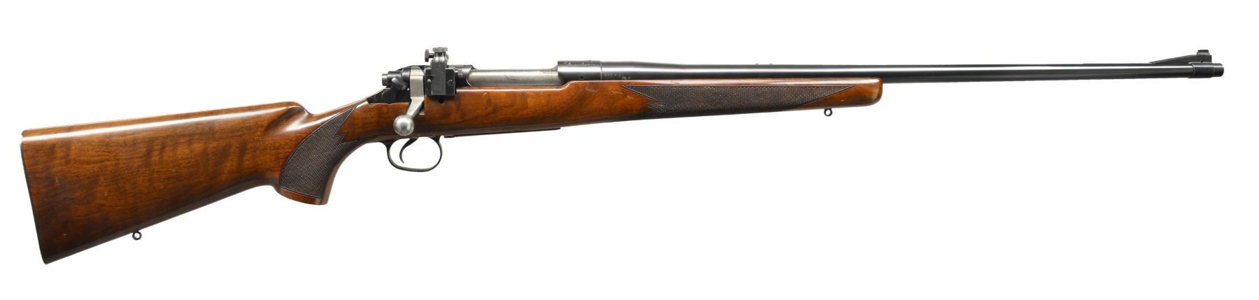 MODEL 720 BOLT ACTION RIFLE. Cal. 350 Carroll. S# 41807. Bbl. 26". Left side of bbl. at breech is marked ".350 CARROLL" over date of "6-9-42". Former 1st Lieutenant Dan Carroll worked for Remington Arms Company Research & Development Department in the Bridgeport Connecticut Machine Shop. His research work & precision shooting knowledge aided in the testing of arms & ammunition during WWII. The Model 720 was designed to compete w/ Winchester's popular Model 70 & is a refined version of the Enfield 1917. The Model 720 was introduced in 1941 w/ a total production of approx. 2,500 rifles. Commercial production was interrupted & never resumed after the war. Nearly 1,000 were purchased in 1942 by the Navy Department & were eventually awarded as trophies in Navy & Marine Corp. shooting competitions into the 1960's. The 350 Carroll is a proprietary cartridge Dan Carroll developed during his time at Remington. A Feb. 26, 1996 letter from Rem. historian J. D. Heath gives the following insight into this rare rifle "The .350 Carroll is also very interesting in the fact that Dan Carroll was w/ the Company at the time, and he was in R & D. He may have put it together & bought it from the Company, and somehow, it got into your hands. Dan Carroll died several years ago, so someone may have sold his firearms. The mystery continues!". The 720 has an Enfield style action w/ improved bolt release having alloy trigger guard & floorplate. Bbl. band fastened bead front sight & fillers in holes for rear sight along w/ Lyman 48RS receiver sight. The action is drilled for scope attachment w/ filler screws. Classic style sporter stock of nicely grained black walnut w/ point pattern hand checkering, sling eyes & checkered aluminum buttplate. UNATTACHED ACCESSORIES: Remington Arms letter dated Feb. 26, 1996. Printed information regarding the 720 rifle & production numbers. Photo of document regarding Dan Carroll dated 7/20/43. Photocopy of a picture of a young Dan Carroll looking down the sights of a Springfield 1903 rifle. CONDITION: retains over 98% metal finish showing some scratches on alloy bottom metal. Front sight retainer & pin are missing. Original stock finish shows some sm. marks & forearm checkering shows a few chipped diamonds. Near excellent bore. (20-630/DS). CURIO. $3,500-5,500.