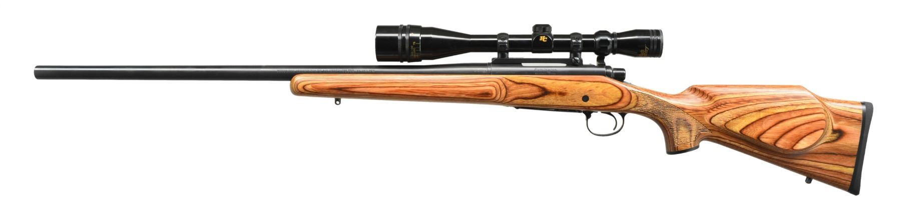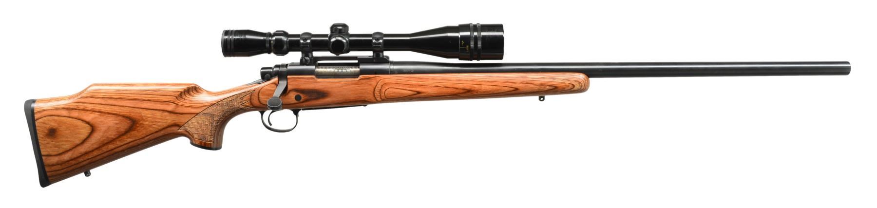 Cal. 22-250. S# E6505248. Bbl. 26" heavyweight. Rifle made w/out iron sights. Receiver marked on left side"REMINGTON MODL 700". Bbl. marked"22-250 REM". Receiver fitted w/ Redfield 1 piece scope base & matching rings. HC 6x24x40 AO scope w/ duplex reticle. Brown laminated stock w/ beavertail forend, cheekpiece & Monte Carlo comb. Solid recoil pad & black plastic grip cap. SQ swivels. UNATTACHED ACCESSORIES: matching shipping box w/ instruction manual. CONDITION: all aspects including scope & bore near new. (20-737/RW). MODERN. $600-900.