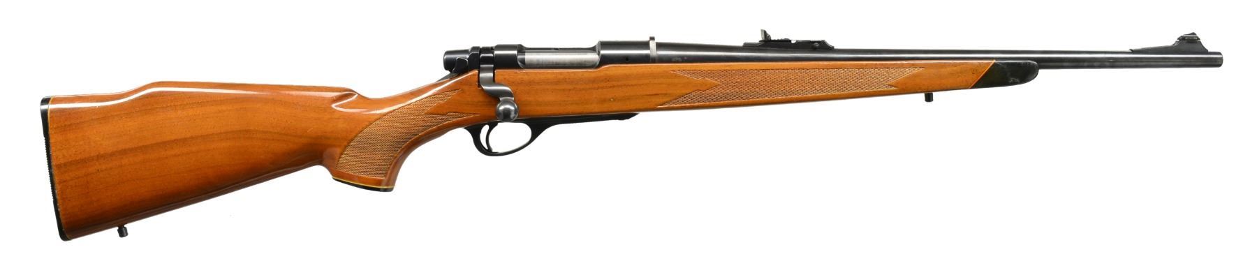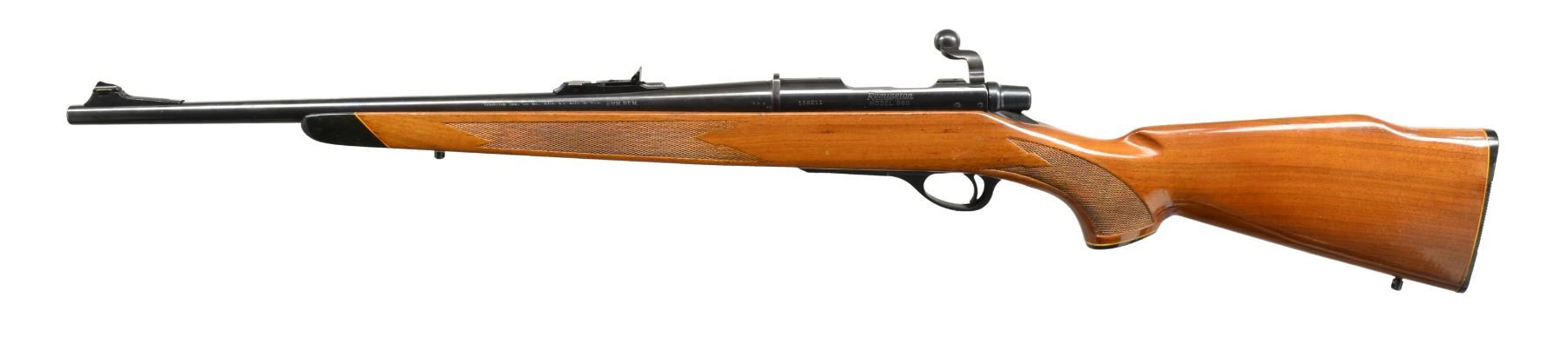 Cal. 6mm Rem. S# 116211. Bbl. 20". Ramp mounted front sight & elevator adj. sporting rear sight. Gloss finished walnut Monte Carlo stock w/ pressed checkering having white line spacers, black forearm tip, grip cap & black plastic buttplate. Original swivel bases. Bbl. code indicates July 1967 mfg. CONDITION: 97% original blue. Original wood finish shows numerous scratches & marks. Bright bore retains strong rifling. (20-930/DS). CURIO. $400-600.