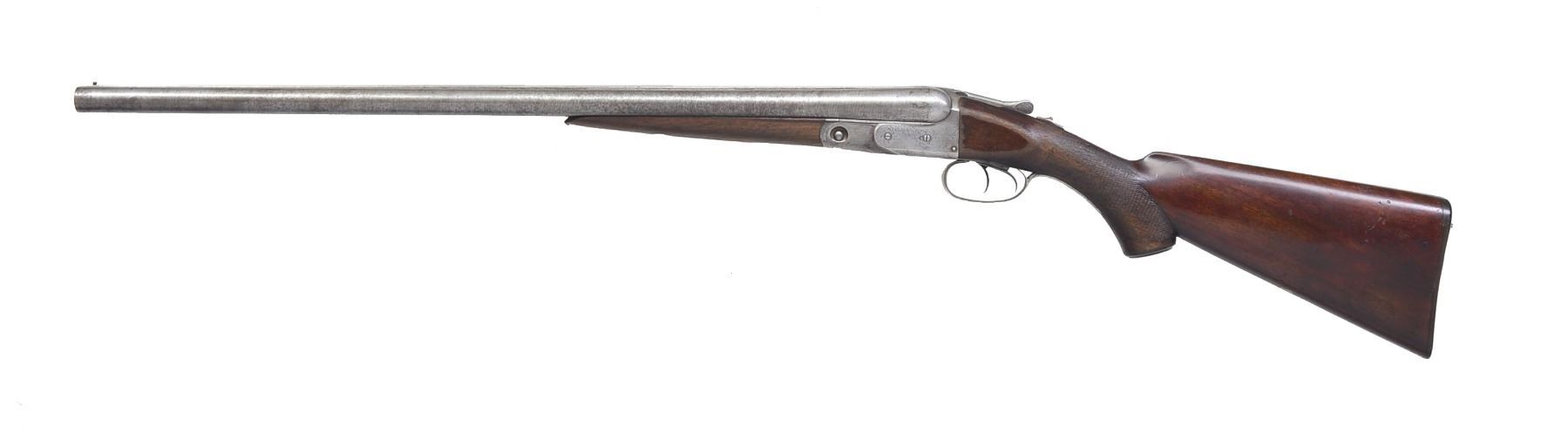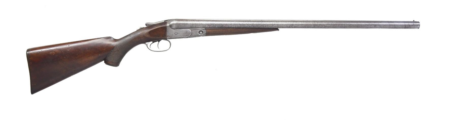 Cal. 12 Ga., 2 5/8". S# 62568. Bbls. of Twist steel are shortened to 26 1/8". Cyl. & cyl. bores. Number 1 frame boxlock action w/ tasteful scroll highlights, dbl. triggers & extractors. Splinter forearm & capped pistol grip stock of checkered walnut w/ name shield in toeline. LOP: 14 1/8" over dog's head buttplate. Mfg. 1891. CONDITION: metal finish has faded to gray showing lg. areas of pitting. Wood is sanded & refinished w/ thinned checkering showing scratches, handling marks & areas of blistered finish. Dark pitted bores. Action is loose on frame. (01-17083/DS). ANTIQUE. $400-600.