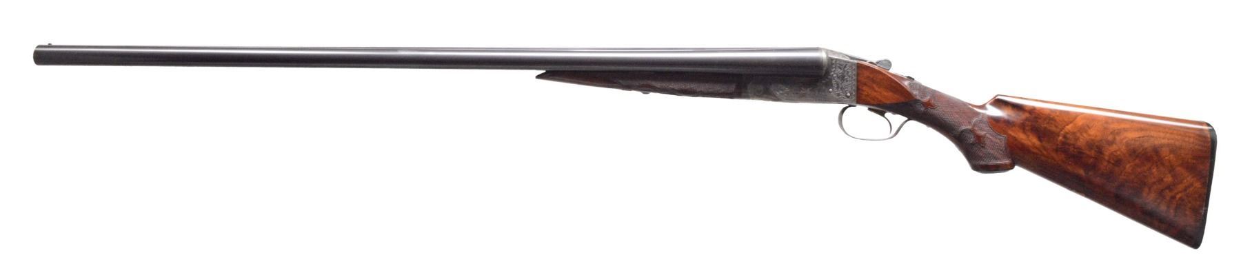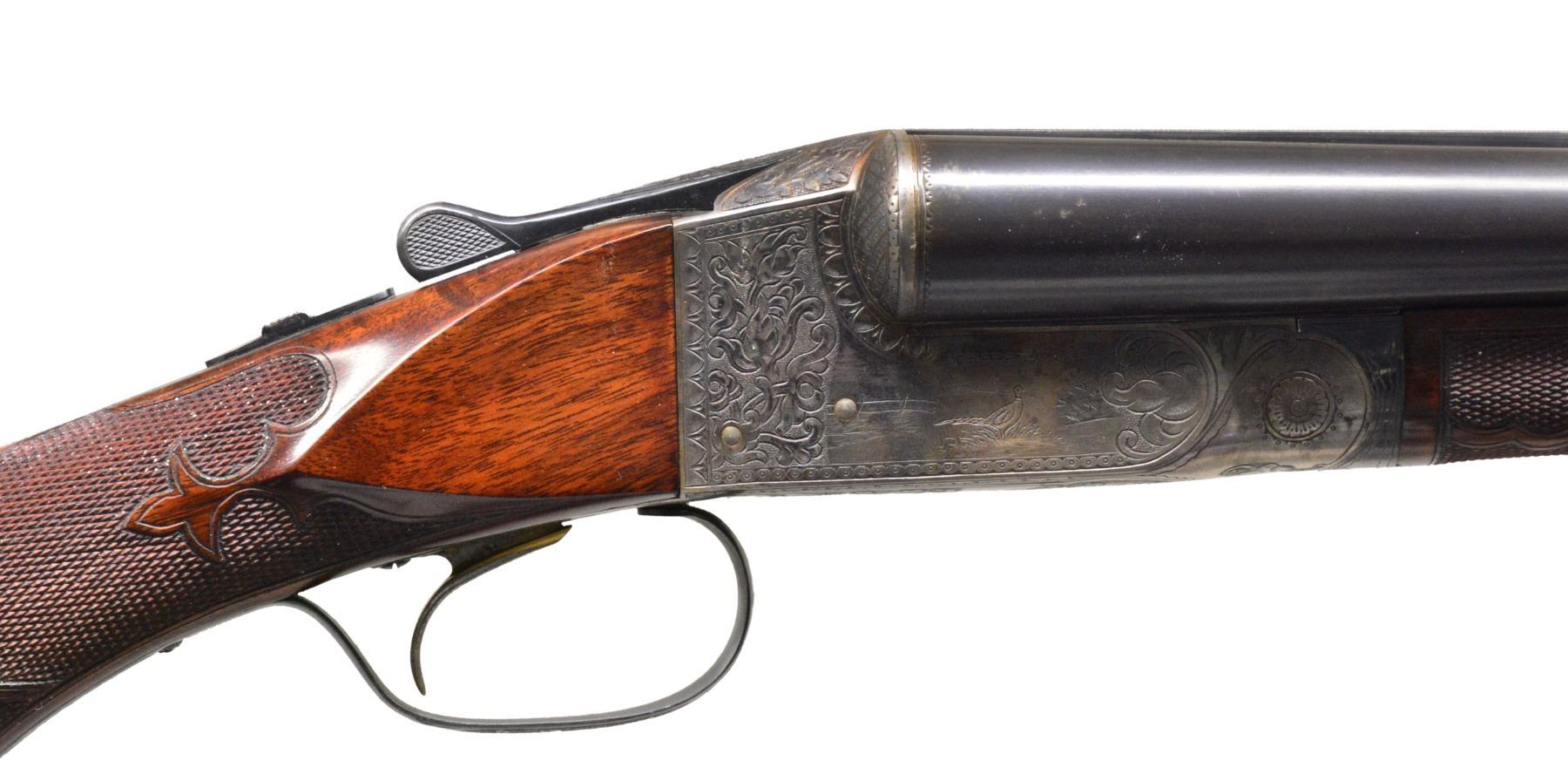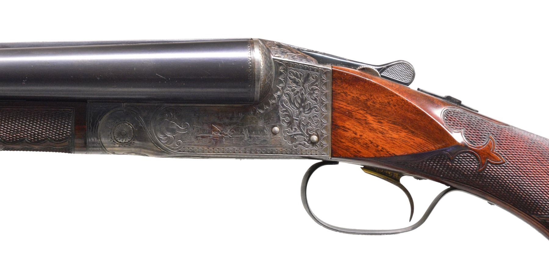 Cal. 12 Ga., 2 3/4". S# 256205. Bbls. 30", engraved "Fluid Steel" on tops & fitted w/ flat matted, slightly raised rib. Bbl. flats are stamped w/ S# & "4" (full choke). Front lump is stamped "NITRO POWDER" "PROVED". Casehardened boxlock flues action features automatic safety, gold plated "Infallible" selective single trigger w/ button on left side of top tang. Action is engraved in typical grade 4 style w/ stylized shaded acanthus w/in geometric borders surrounding game scenes on sides; a duck flies over a marsh on left & a pheasant is standing in meadow on right. "Ithaca Gun Co" is on each side. Blued trigger guard has S# at grip. Nicely crotch figured American walnut capped pistol grip buttstock measures 13 1/8" over Ithaca composition buttplate. Fancy checkering w/ fleur de lis & ribbons through pattern are at grip & a vacant gold shield is on toeline. Matching splinter ejector forend w/ inlet ebony tip has push button & J-spring release. Bore diameters: left - .722, choke .025 (mod), right - .724, choke .013 (lt mod). Wall thickness: left - .040, right - .042. DAC: 1 7/8". DAH: 3". LOP: 13 1/8". WEIGHT: 7 lbs. 13 oz.. CONDITION: bbls. retain over 95% blue, perhaps w/ some touch up over some marks at breech & on left side. Action retains over 90% original casehardening color, silvered on sides of fences & somewhat around bottom, from normal hand wear. Top lever & trigger guard retain over 90% of what appears to be their original blue. Stocks freshened & lightly refinished, checkering recut. There are some cracks at rear portion of forend release escutcheon running back toward iron. Bright & shiny smooth bores. Mechanically very fine w/ tight action & strong ejectors. (19-5436/MGM23). CURIO. $2,000-3,000.