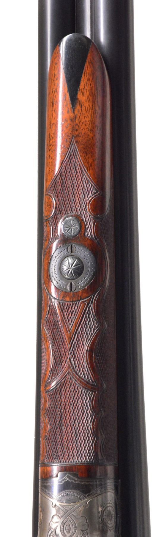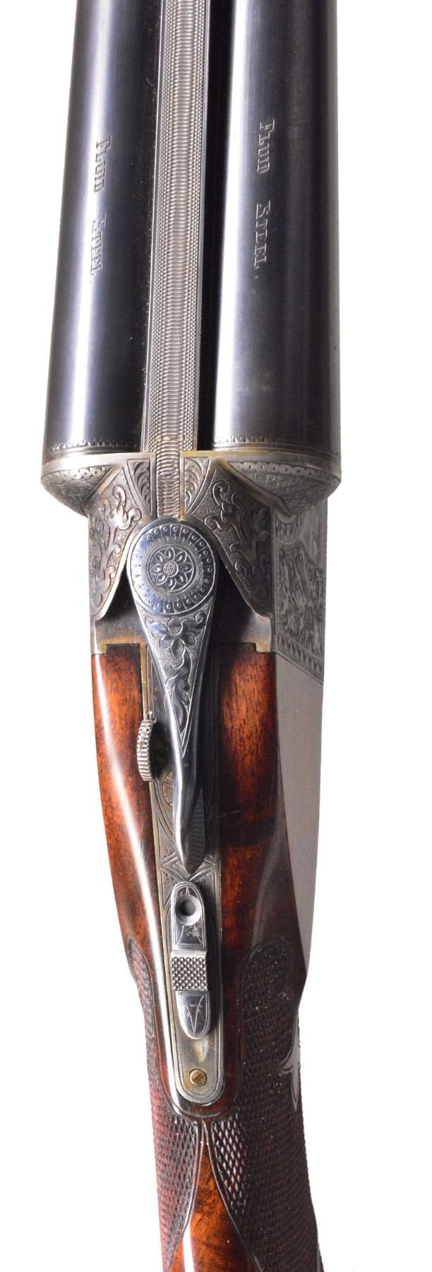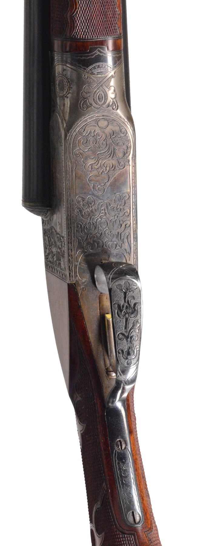 Cal. 12 Ga., 2 3/4". S# 256205. Bbls. 30", engraved "Fluid Steel" on tops & fitted w/ flat matted, slightly raised rib. Bbl. flats are stamped w/ S# & "4" (full choke). Front lump is stamped "NITRO POWDER" "PROVED". Casehardened boxlock flues action features automatic safety, gold plated "Infallible" selective single trigger w/ button on left side of top tang. Action is engraved in typical grade 4 style w/ stylized shaded acanthus w/in geometric borders surrounding game scenes on sides; a duck flies over a marsh on left & a pheasant is standing in meadow on right. "Ithaca Gun Co" is on each side. Blued trigger guard has S# at grip. Nicely crotch figured American walnut capped pistol grip buttstock measures 13 1/8" over Ithaca composition buttplate. Fancy checkering w/ fleur de lis & ribbons through pattern are at grip & a vacant gold shield is on toeline. Matching splinter ejector forend w/ inlet ebony tip has push button & J-spring release. Bore diameters: left - .722, choke .025 (mod), right - .724, choke .013 (lt mod). Wall thickness: left - .040, right - .042. DAC: 1 7/8". DAH: 3". LOP: 13 1/8". WEIGHT: 7 lbs. 13 oz.. CONDITION: bbls. retain over 95% blue, perhaps w/ some touch up over some marks at breech & on left side. Action retains over 90% original casehardening color, silvered on sides of fences & somewhat around bottom, from normal hand wear. Top lever & trigger guard retain over 90% of what appears to be their original blue. Stocks freshened & lightly refinished, checkering recut. There are some cracks at rear portion of forend release escutcheon running back toward iron. Bright & shiny smooth bores. Mechanically very fine w/ tight action & strong ejectors. (19-5436/MGM23). CURIO. $2,000-3,000.