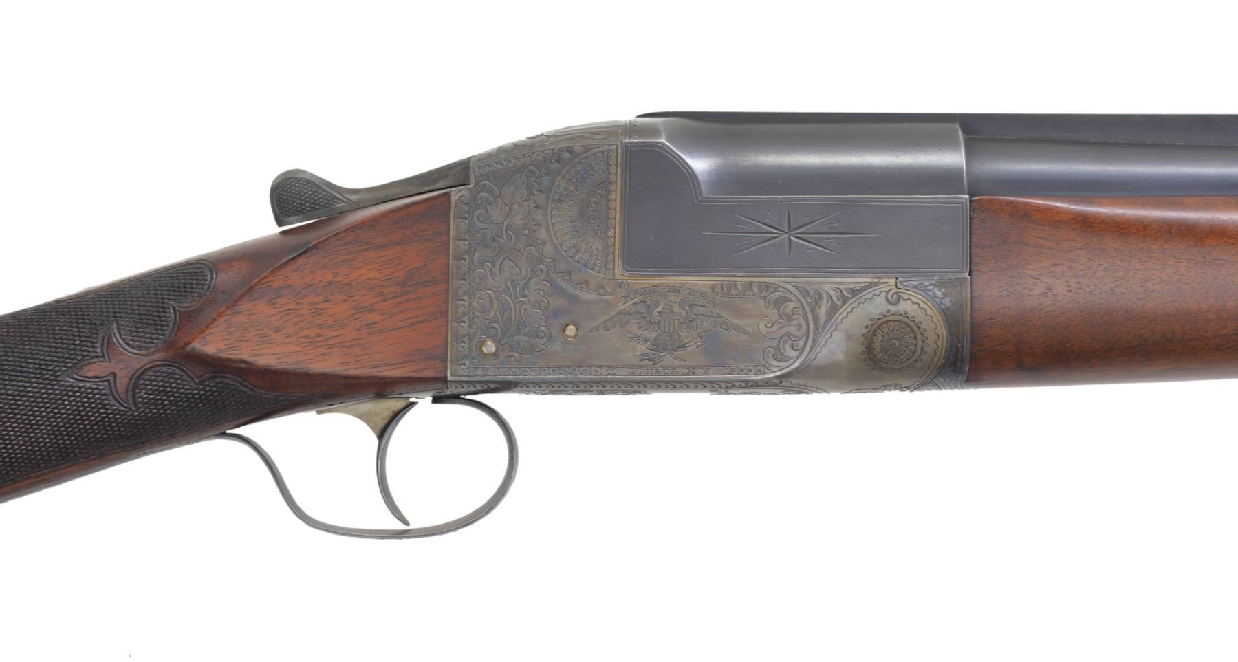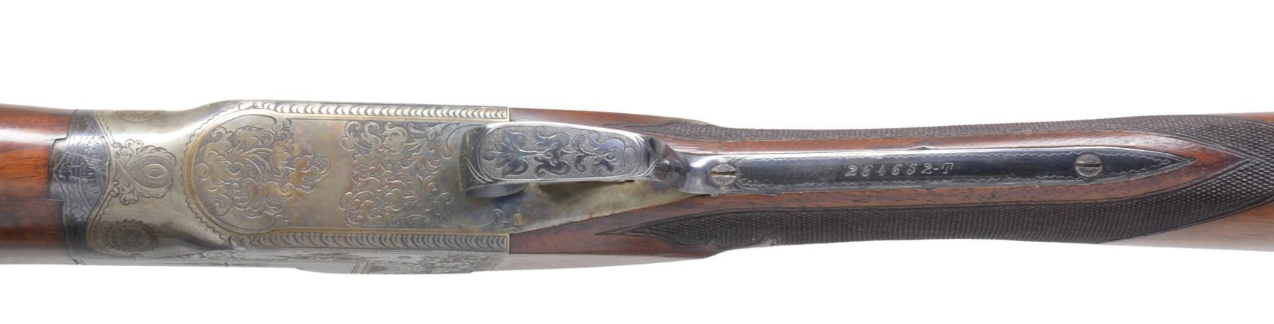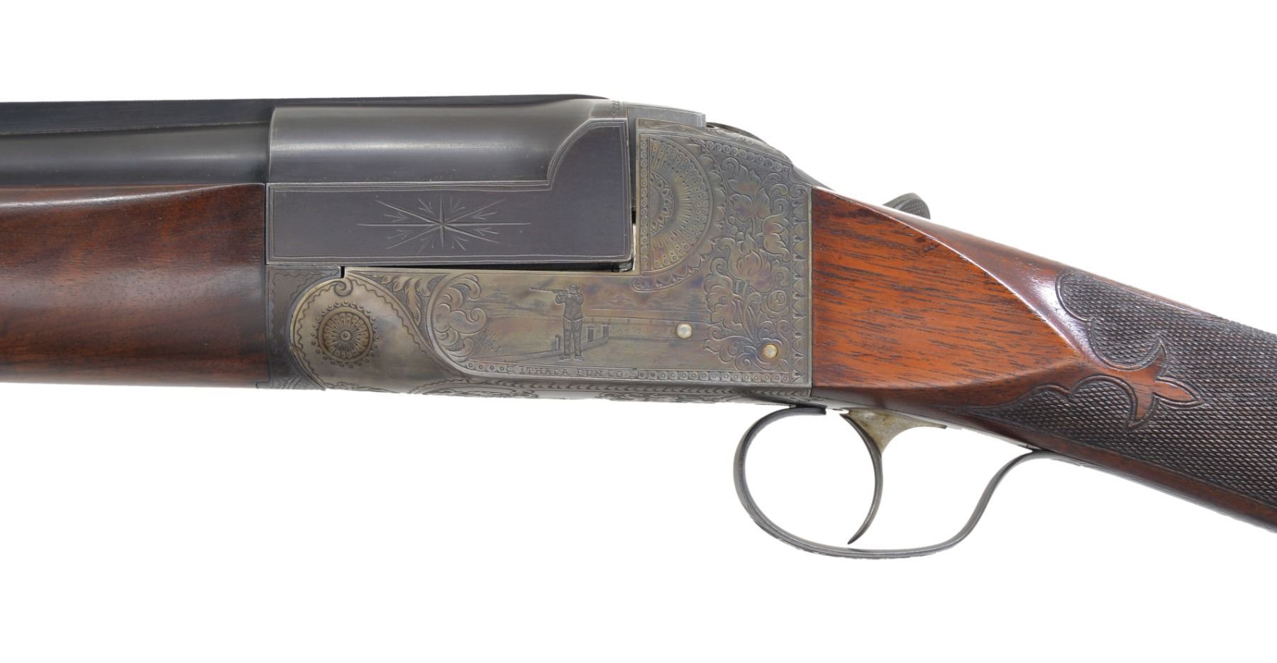 GUN. Cal. 12 Ga. S# 264652-T .This early trap gun has 32" bbl. fitted w/ matted, ventilated rib. Sides of mono-bloc are engraved w/ starbursts. Casehardened flues action w/ dbl. bite on mono-bloc extensions is marked w/ S#, grade & gauge on water table. Action is engraved w/ near full coverage lg. stylized acanthus in shaded background w/in geometric borders. This well done scroll surrounds scene of shooter at traps on left side, & heraldic American eagle on right. Both are over "ITHACA GUN CO" on left & "ITHACA N.Y." on right. Blued trigger guard has S# on tang. Lightly figured American walnut straight grip buttstock measures 14 5/8" over Ithaca hard rubber buttplate. Fancy pattern checkering w/ fleur de lis at front is at grip. A vacant gold shield is on toeline. Matching long flared ejector forend w/ inlet ebony tip has usual J-spring & push button release. Bore diameters: .725, choke .029 (full). Wall thickness: .035. DAC: 1 7/16". DAH: 2". LOP: 14 5/8". WEIGHT: 8 lbs. 0 oz. CONDITION: bbl. retains nearly all its original blue w/ some sharp edge wear. Action retains about 95% original casehardening color, thinning slightly on top tang. Stocks have light oil refinish, most noticeable on butt, checkering lightly worn. Bore is bright & shiny, mechanically crisp. (19-5435/MGM36). CURIO. $1,000-1,500.