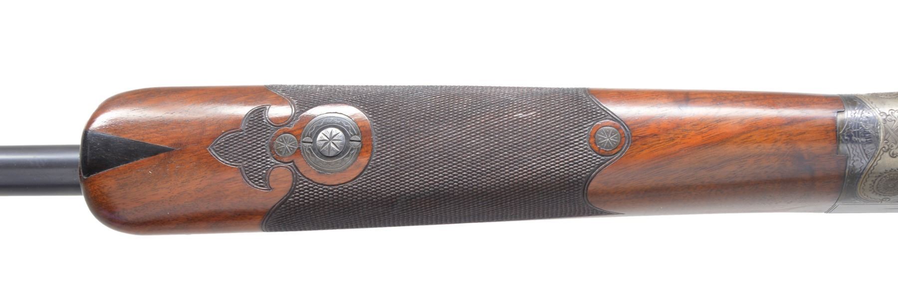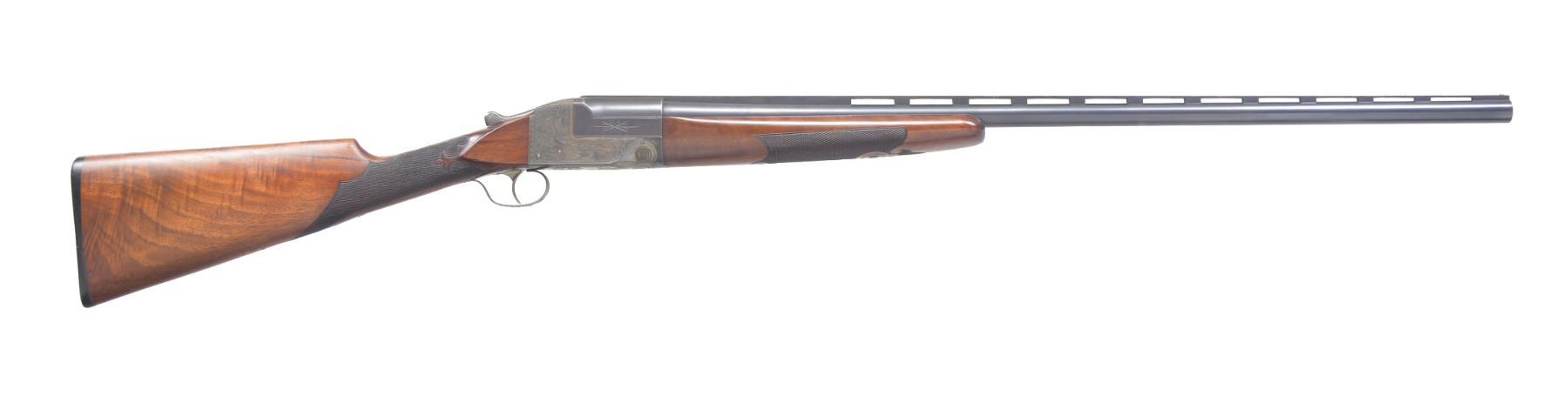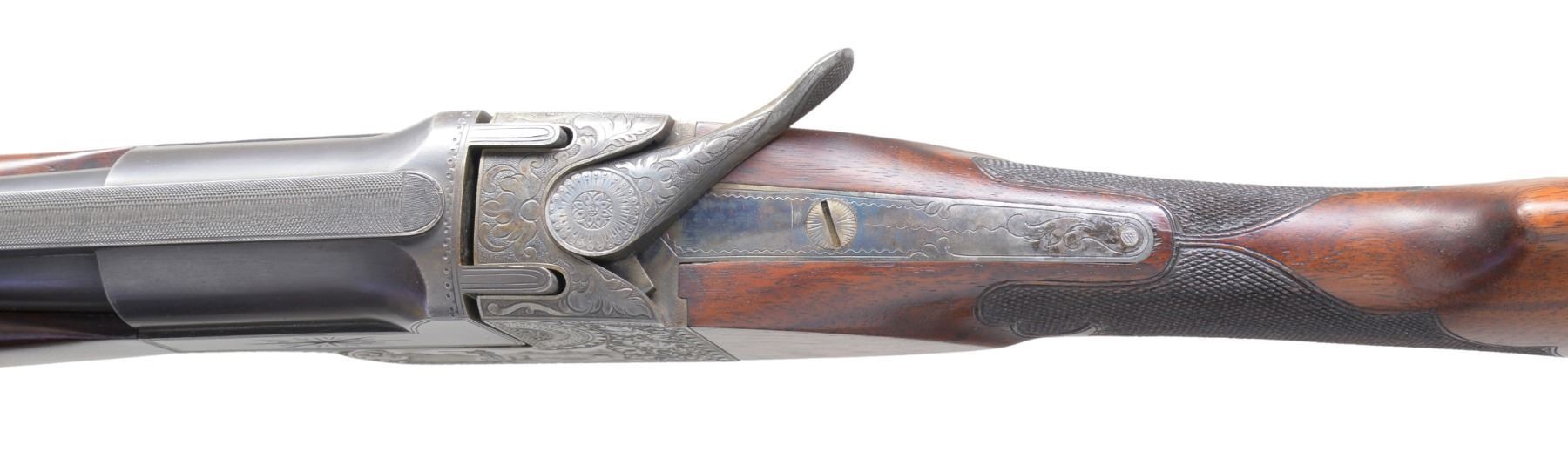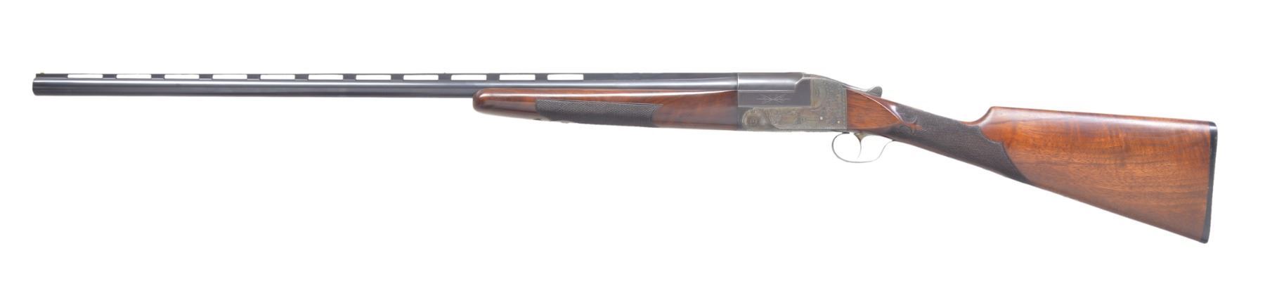GUN. Cal. 12 Ga. S# 264652-T .This early trap gun has 32" bbl. fitted w/ matted, ventilated rib. Sides of mono-bloc are engraved w/ starbursts. Casehardened flues action w/ dbl. bite on mono-bloc extensions is marked w/ S#, grade & gauge on water table. Action is engraved w/ near full coverage lg. stylized acanthus in shaded background w/in geometric borders. This well done scroll surrounds scene of shooter at traps on left side, & heraldic American eagle on right. Both are over "ITHACA GUN CO" on left & "ITHACA N.Y." on right. Blued trigger guard has S# on tang. Lightly figured American walnut straight grip buttstock measures 14 5/8" over Ithaca hard rubber buttplate. Fancy pattern checkering w/ fleur de lis at front is at grip. A vacant gold shield is on toeline. Matching long flared ejector forend w/ inlet ebony tip has usual J-spring & push button release. Bore diameters: .725, choke .029 (full). Wall thickness: .035. DAC: 1 7/16". DAH: 2". LOP: 14 5/8". WEIGHT: 8 lbs. 0 oz. CONDITION: bbl. retains nearly all its original blue w/ some sharp edge wear. Action retains about 95% original casehardening color, thinning slightly on top tang. Stocks have light oil refinish, most noticeable on butt, checkering lightly worn. Bore is bright & shiny, mechanically crisp. (19-5435/MGM36). CURIO. $1,000-1,500.