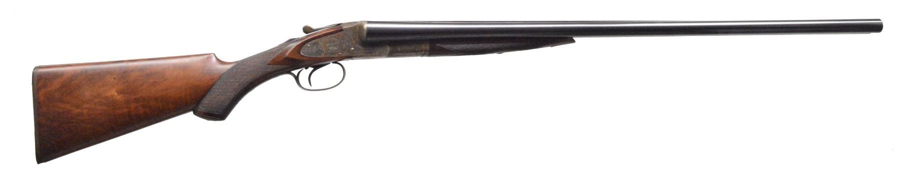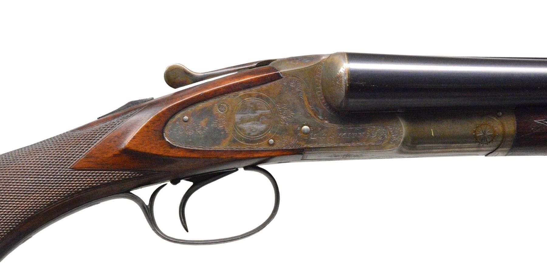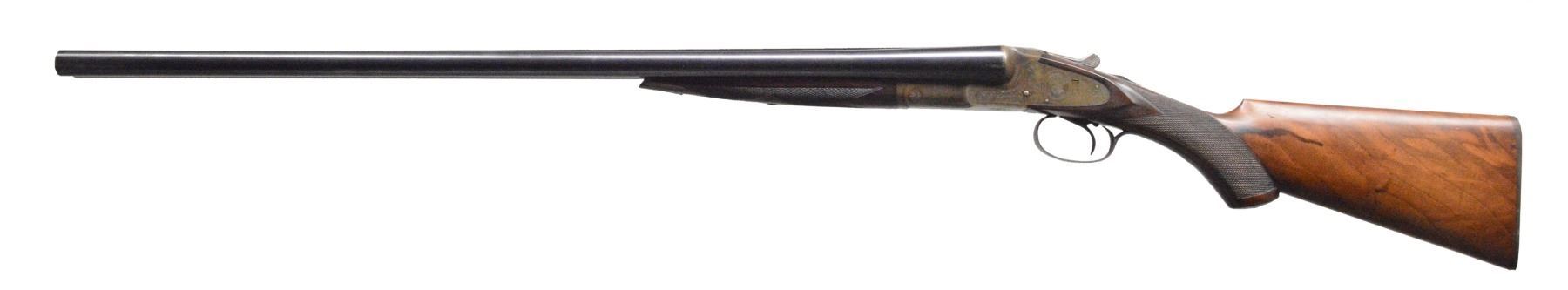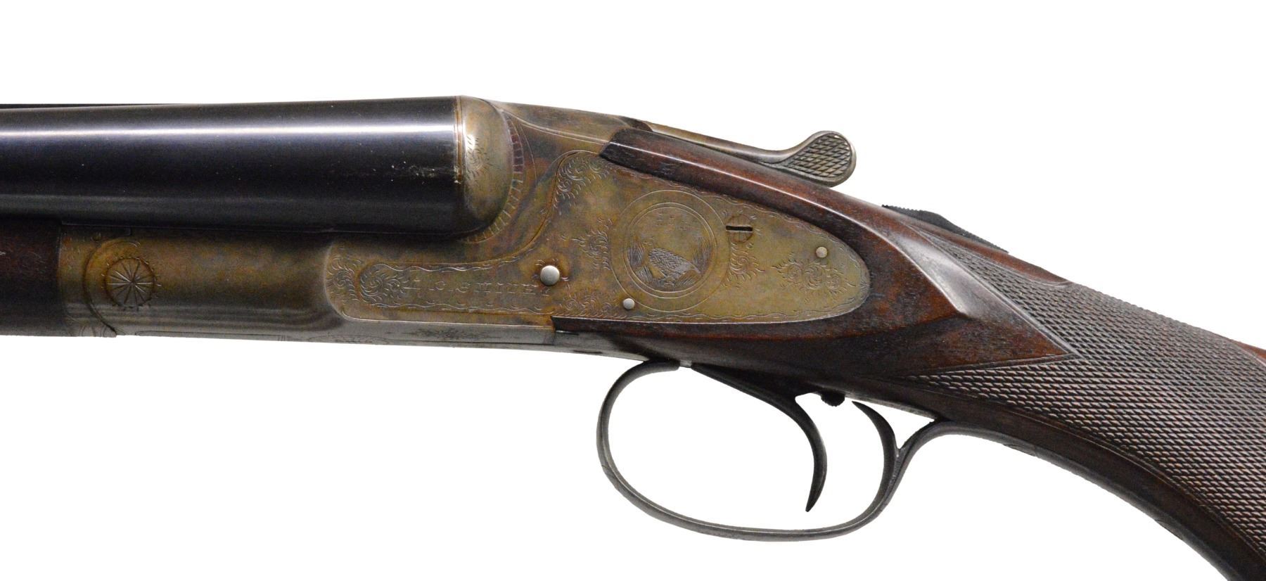 SHOTGUN WITH SINGLE TRIGGER. Cal. 12 Ga., 2 3/4". S# 210036. Bbls. 28", marked "HUNTER ARMS CO" "FULTON, N. Y." on rear portion of matted game rib. Bbl. flats & bottoms of bbls. have all correct factory markings. Casehardened standard weight action is of early type w/ bushed strikers & features non automatic safety, & Hunter One trigger. Action is engraved w/ a few sprays of scroll & line borders. Lockplates have some scroll engraving & circular scenes of game birds; quail on left & duck on right. "L. C. SMITH" is on each lockplate. Blued trigger guard w/ scroll on bow has S# on tang. Lightly fiddle figured & marbled European walnut capped pistol grip buttstock measures 13 3/4" over serrated hard rubber buttplate. Matching splinter ejector forend w/ inset hard rubber tip has typical J-spring & knurled roll release in guitar shaped escutcheon. Bore diameters: left - .724, choke .030 (full), right - .725, choke .024 (mod). Wall thickness: left - .024, right - .025. DAC: 1 11/16". DAH: 2 5/16". Neutral cast. LOP: 13 3/4". WEIGHT: 7 lbs. 0 oz. CONDITION: exceptionally fine, appears close to new, but w/ some ravages of time. All metal parts retain nearly all (95% +) of their original finishes, w/ only some high edge wear. Stocks have nearly all of their original finish w/ a few light marks. Grip cap & buttplate considerably browned. Some water stain on left side of butt. Forend tip re glued & is slightly proud. Bright shiny bores. Very fine mechanics. (19-5429/MGM24). CURIO. $1,500-2,500.
