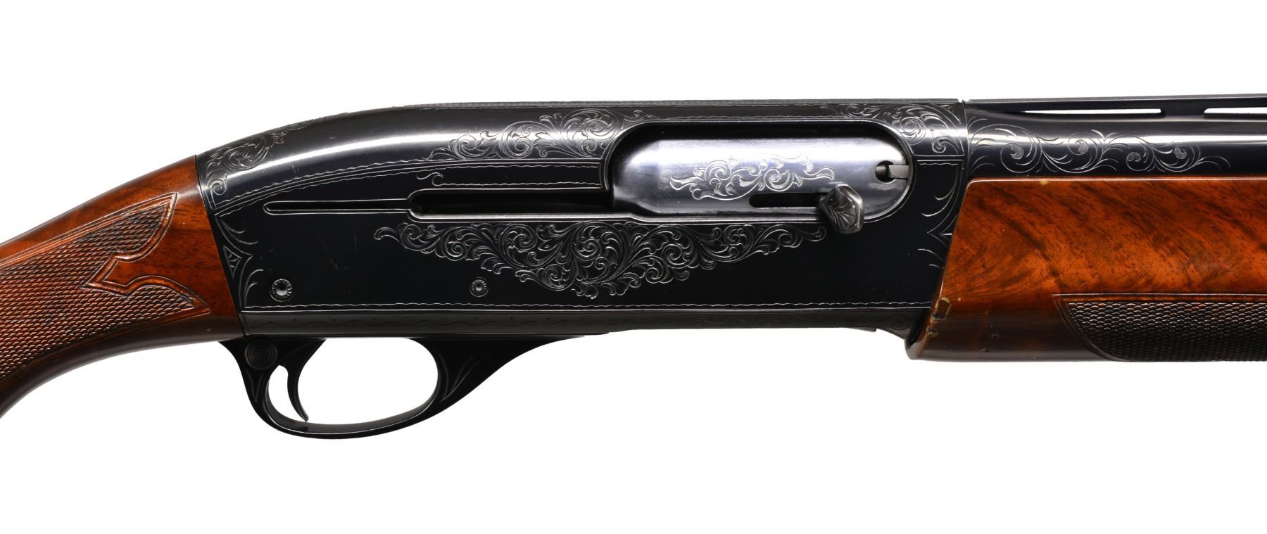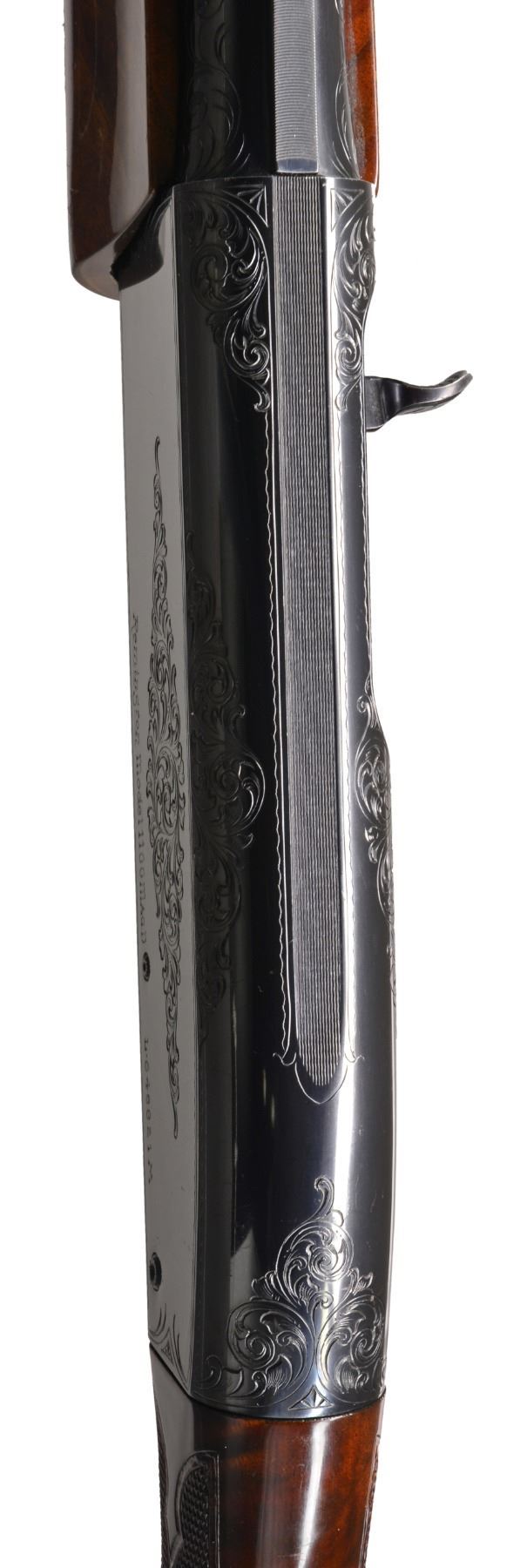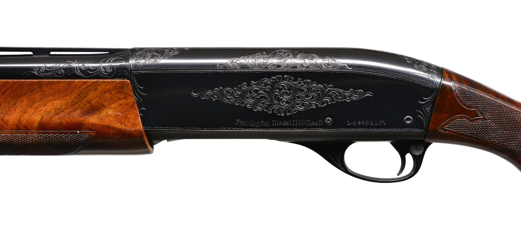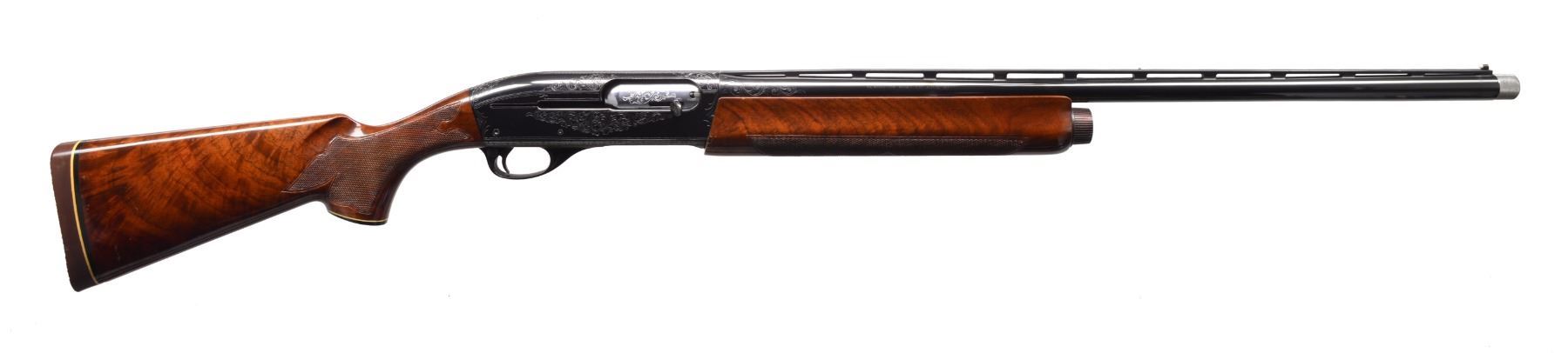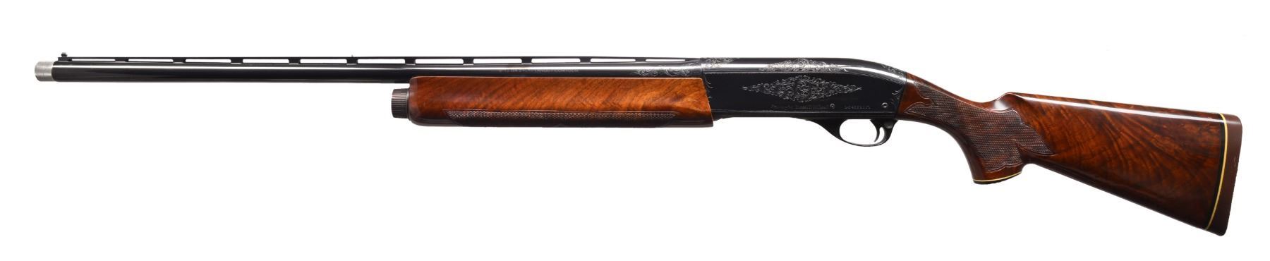 AUTOLOADING SHOTGUN. Cal. 12 Ga. S# L-648821M. Bbl. 25 1/2" VR Target Contour of later mfg. Bbl. fitted for Remchokes, includes Skeet, Imp-Cyl & Mod. stainless steel extended target tubes. White target front sight w/ steel mid bead. Breech end of bbl. has added scroll engraving that compliments the factory engraved action. Blued action has D grade factory engraving featuring wedges of scroll on sides, top & trigger guard bow highlighted by wavy line & dotted borders. Forearm & gloss finished pistol grip stock of fancy walnut have elaborate hand checkering. Stock features black grip cap w/ white diamond inlay & white line spacer. LOP: 14" over Pachmayr Presentation pad w/ white line spacer. CONDITION: action retains over 95% blue showing light scratches w/ some carry wear around loading port. Bbl. retains 99% blue. Original wood finish shows scattered scratches & marks w/ chipped finish along rear edge of forearm. Very nice bright bore. (20-120/DS). MODERN. $2,000-2,750.