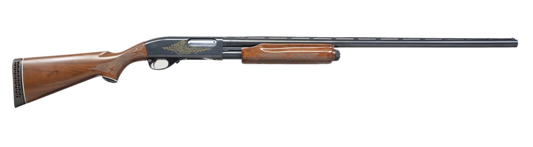 SHOTGUN. Cal. 12 Ga., 2 3/4". S# 6216DU. Bbl. 30" VR w/ fixed Full choke. Action has special gold filled scroll ornamentation w/ multi color DU shield on left side. Gloss finished walnut stock & forearm w/ pressed checkering & original pad. CONDITION: over 97% original wood & metal finish. Very good bright bore. (19-4828/DS). MODERN. $350-550.