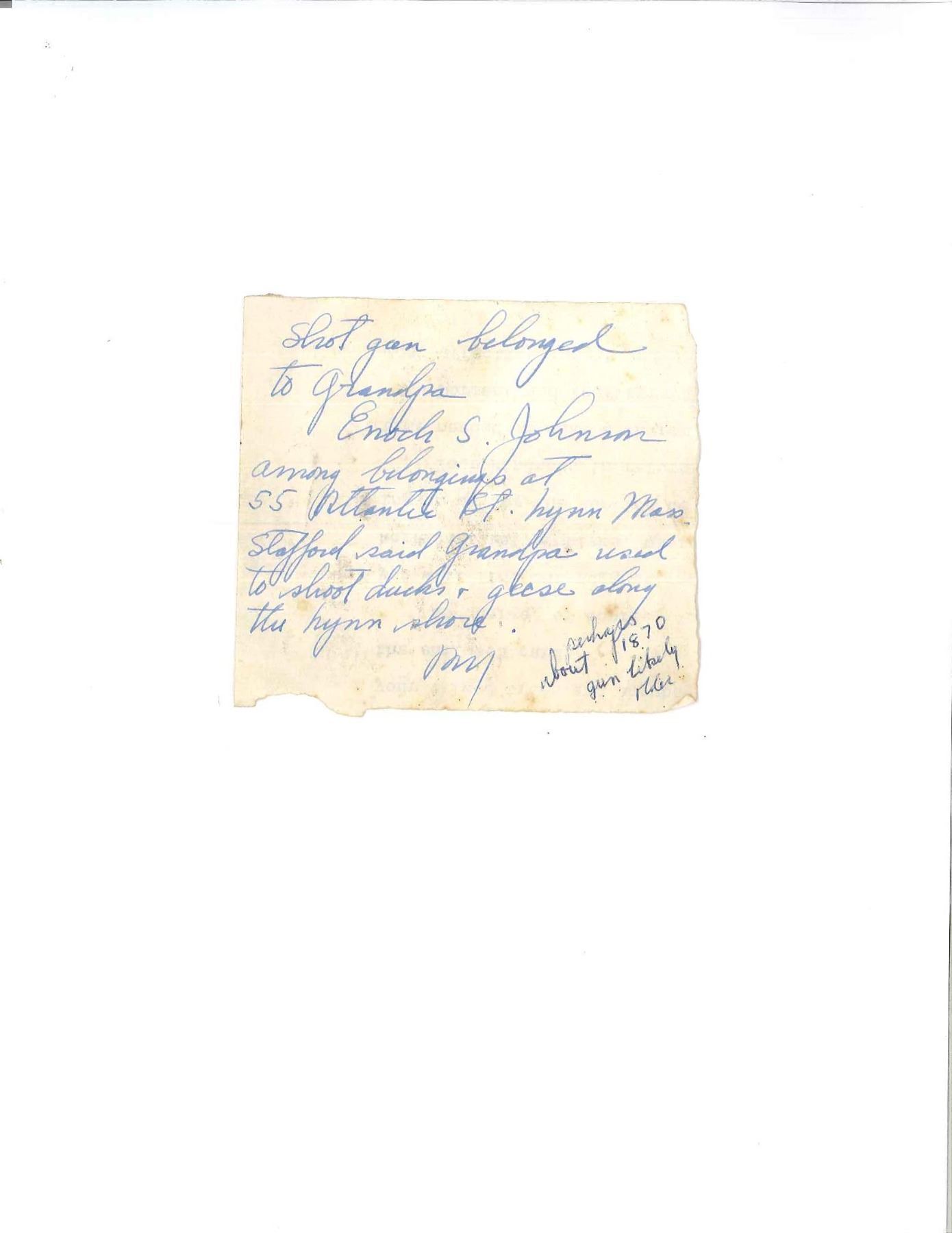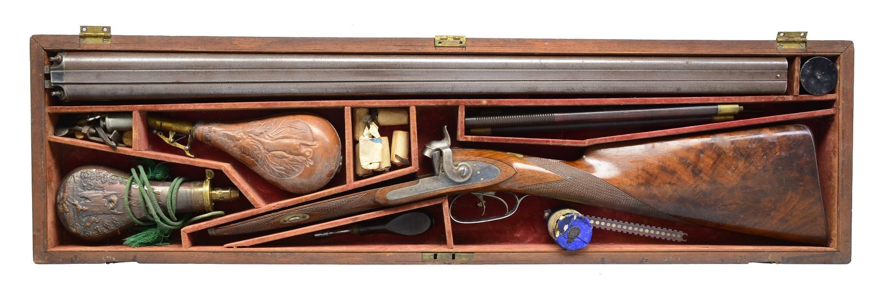 SHOTGUN WITH ORIGINAL CASE & ACCESSORIES. Cal. 12 Ga. (18.4mm). S# 979. Bbls. 30 1/2" twist. Engraved on top rib "JOHN P. LOVELL MAKER BOSTON". Bottom of bbls. have various liege proofs & S#. Patent breeches are case hardened. Wood ramrod w/ brass capped worm & tapered brass tip held by 3 iron pipes. Locks & serpentine hammers are case colored. Locks engraved in block letters "JOHN P. LOVELL". Mounted on nicely figured burled walnut w/ fire blued trigger guard & buttplate. Wrist & forestock nicely checkered. Stock has single key w/ 2 oval German silver escutcheons & steel case colored nose cap/thimble which terminates in a stylized finial matching the forward finial of trigger guard. UNATTACHED ACCESSORIES: mahogany case is red velvet lined & compartmentalized for lg. cap tin, wood & brass 3 piece cleaning rod, ebony handled combination nipple wrench & oiler. Pewter "HAWKSLEY" oiler. Mainspring vise, powder flask & shot bag. Also found in case are 5 complete "ELEY'S IMPROVED PATENT WIRE CARTRIDGES" w/ orange paper labels & gauge marking "12". There is also an original 5 1/2"x3" 2 sided paper instructions for using these cartridges. Also in box is a blue paper wrapped lg. tin of "ELEY'S DOUBLE WATERPROOF PERCUSSION CAPS". Also in case are about a dozen paper wads & a mainspring vise. An accompanying note states this shotgun belonged to Enoch S. Johnson of Lynn Mass. around 1870. CONDITION: very fine overall. Bbls. retain most of their original striped brown finish. Breech retains much of its original case color. Locks retain most of their original case colors, though weaker on left side. Most of the fire blue is present on the trigger guard & bow. Case color on floorplate & thimble is mostly intact, though muted. Stock retains most of its piano polish varnish w/ sm. scuffs scattered on high points. Mechanically fine w/ bright shiny bores. Accompanying accoutrements all very good to fine. Casing is good, lining is soiled & faded w/ reductions. Hinges in need of repair. PROVENANCE: Estate Collection of Dan Poppen. (01-17341/JS). ANTIQUE. $1,500-2,500.