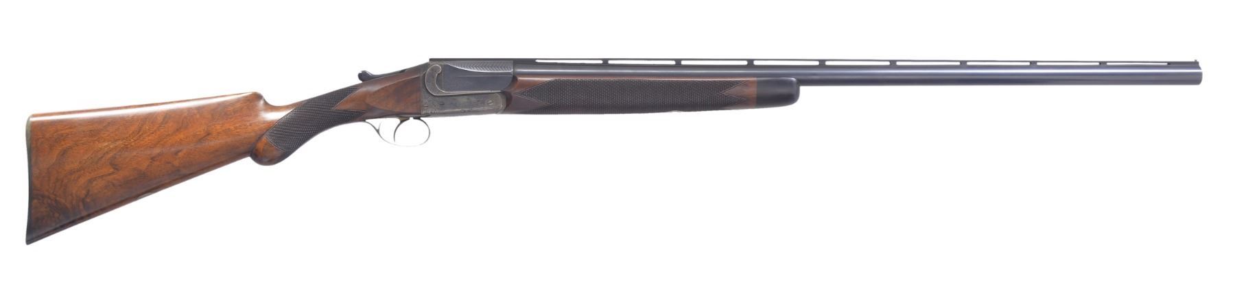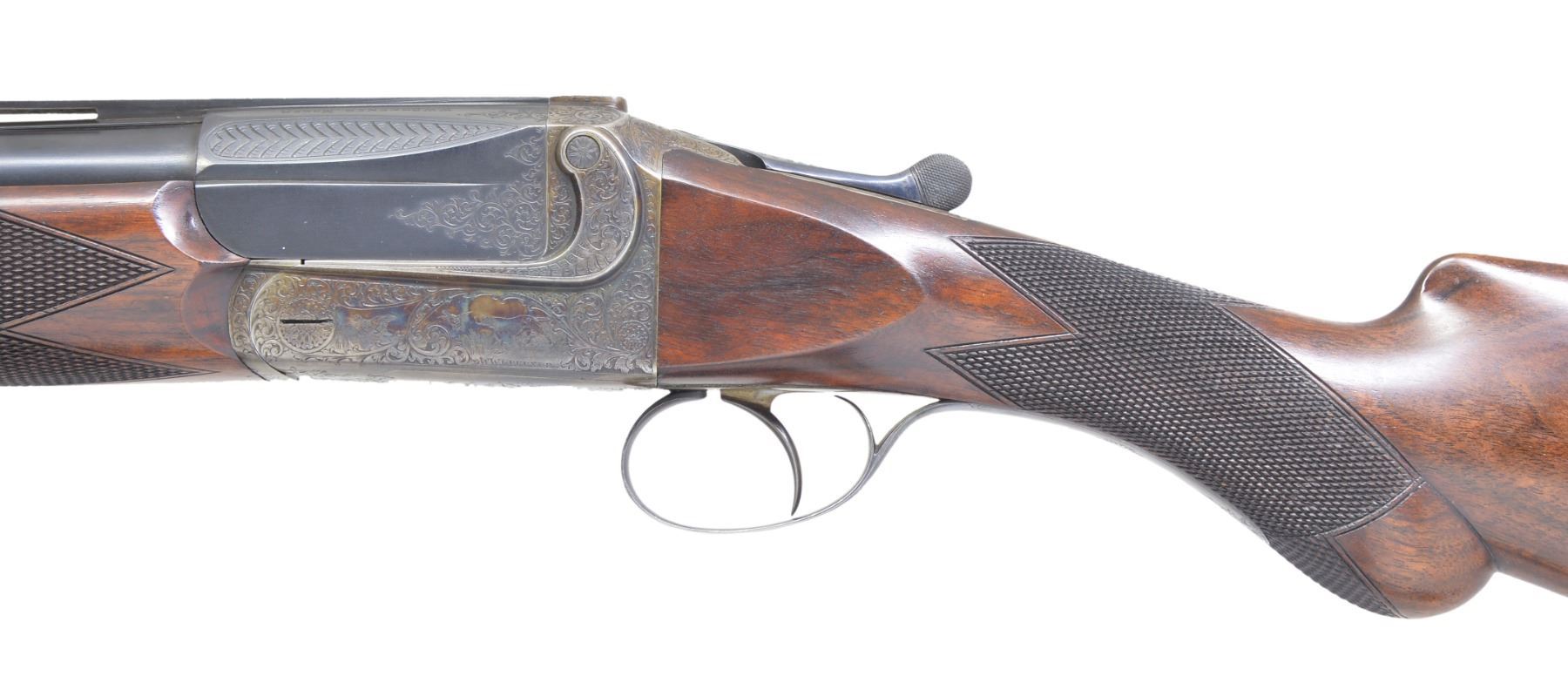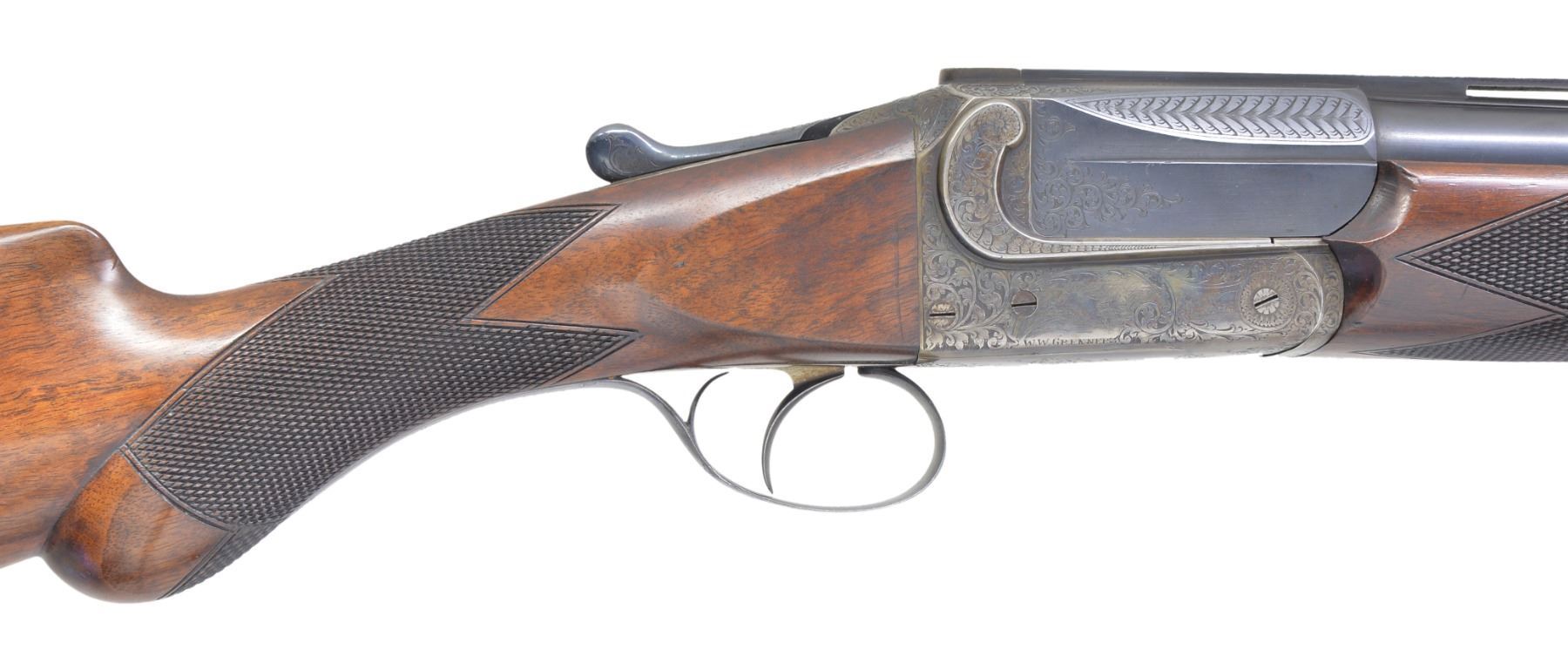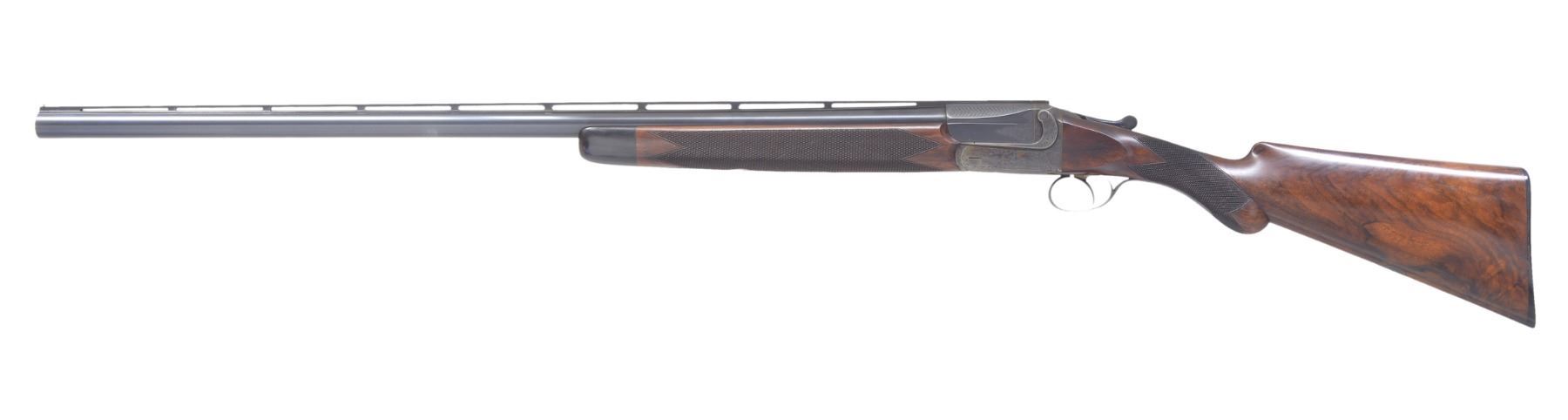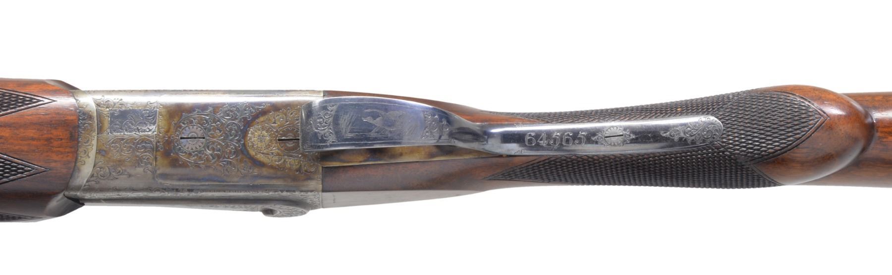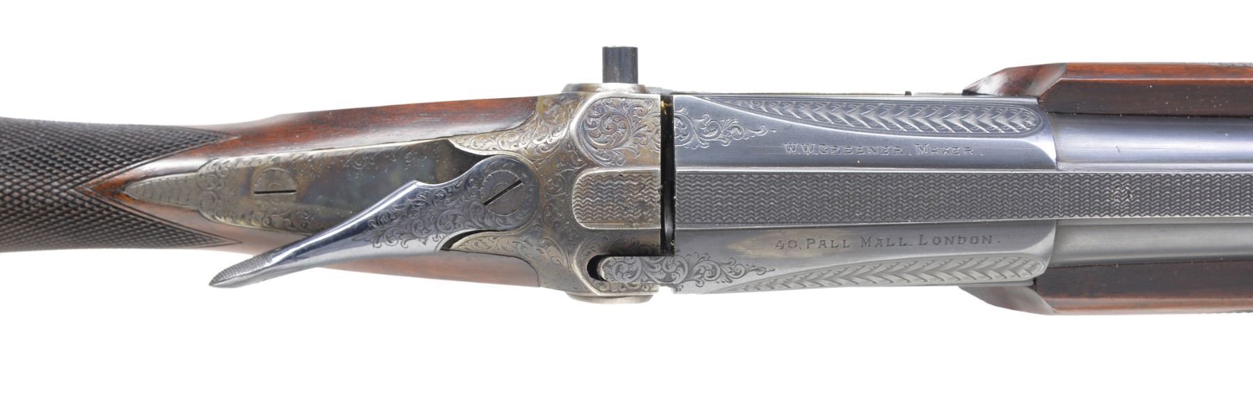SHOTGUN. Cal. 12 Ga. S# 64565. This well made & nicely engraved gun has 32" bbl. w/ slightly raised, matted, ventilated rib. Top of breech section is engraved "W. W. Greener. Maker" "40, Pall Mall. London." There is well cut scroll engraving at breech end. Bbl. flat is stamped w/ Birmingham nitro proof for 2 3/4" chamber. Casehardened boxlock action has nicely filed fence & engraved w/ near full coverage very well cut open shaded scroll surrounding nicely detailed dog & bird scenes on sides; a pointer flushes 2 grouse on left & spaniel is on right. Both of these scenes are over "W. W. Greener". Blued trigger guard is engraved w/ a duck on bow. S# is on tang. Lightly figured & marbled European walnut rnd. knob pistol grip buttstock measures 14 1/2" over checkered horn buttplate. Point pattern checkering is at grip & a vacant silver oval is on toeline. Matching long full ejector forend w/ ebony tip has Deeley type release. Bore diameter: .729, choke .036 (full). Wall thickness: .068. DAC: 1 7/16". DAH: 2 5/16". Cast approx. 1/2" off. LOP: 14 1/2". WEIGHT: 8 lbs. 0 oz. CONDITION: bbl. retains approx. 95% original blue w/ some light cleaning at top of breech area. Action retains approx. 90% original casehardening color, silvered on sharp edges. Top lever & trigger guard are lightly silvered. Stocks retain nearly all of their original finish w/ some light marks & a bit of added oil rubbed into butt. Bores are bright & shiny. Mechanically crisp. (19-5431/MGM35). CURIO. $1,500-2,000.