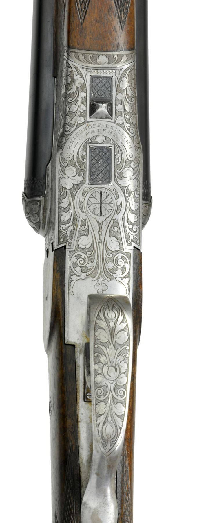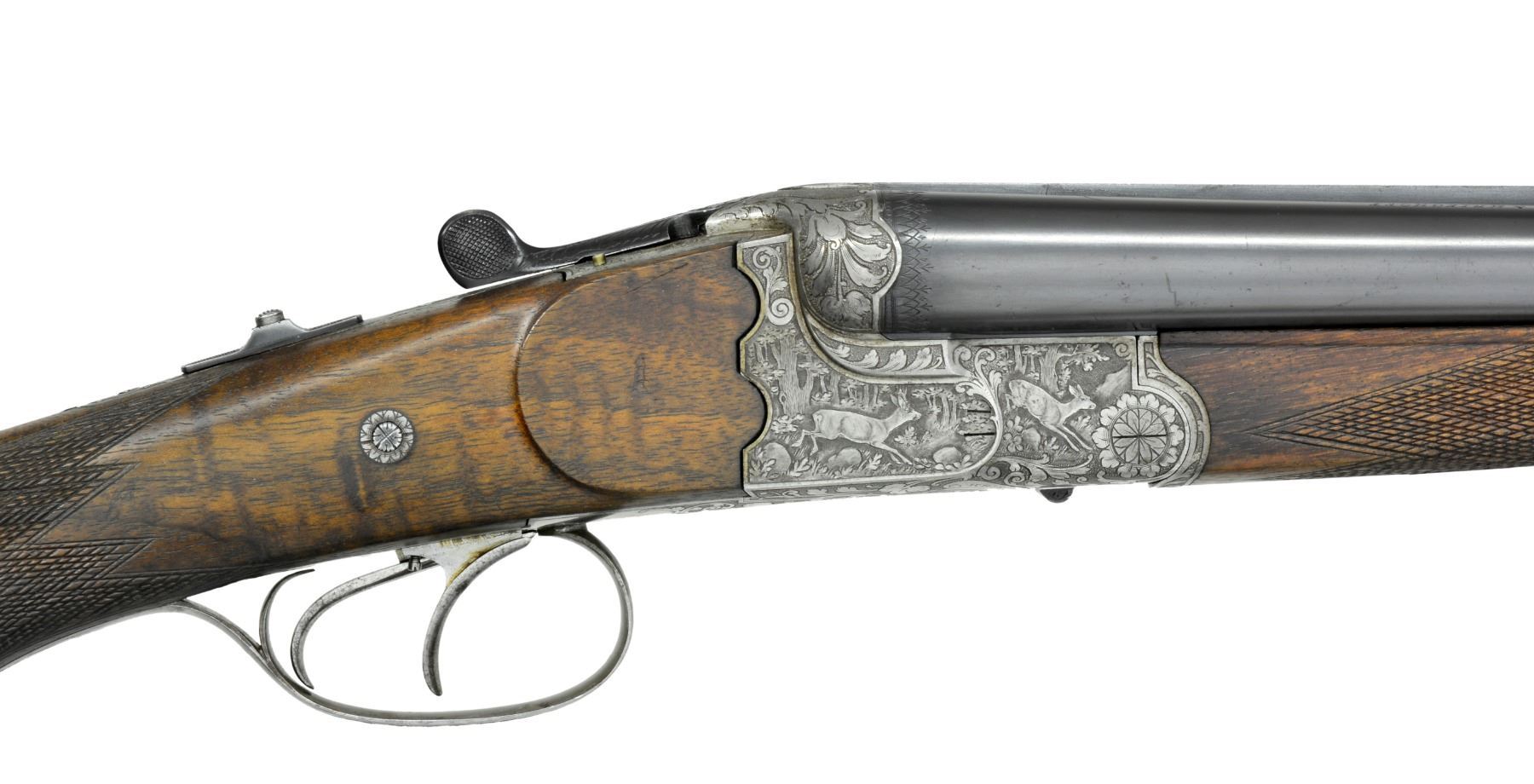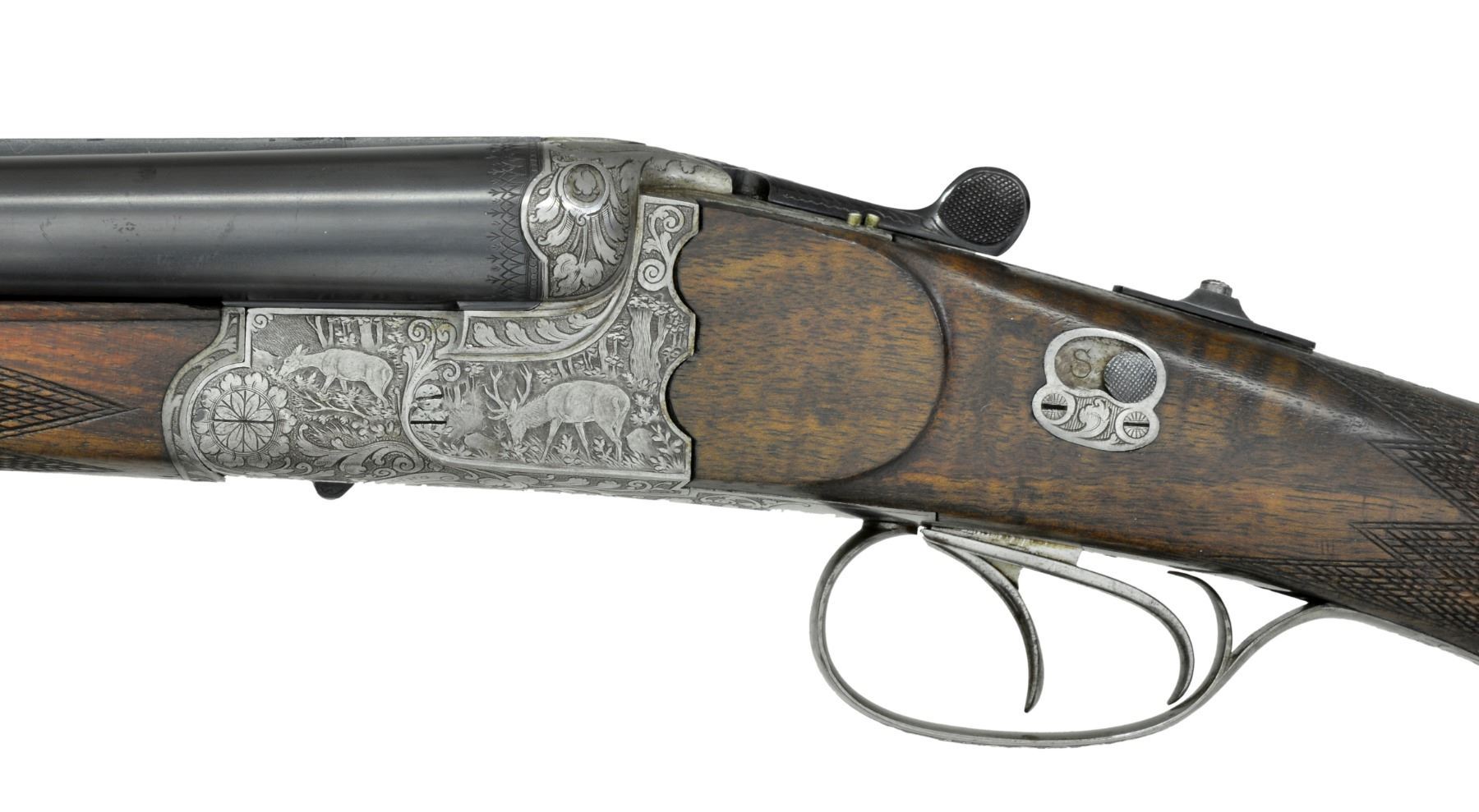 KRIEGHOFF. Cal. 16 Ga., 2 1/2" x 16 Ga., 2 1/2" x 6.5x58R. S# 21911. Bbls. 23 5/8" fitted w/ full length matted rib holding pop up rear sight & silver front bead. Makers name & "SUHL" engraved on tops. Bbl. flats stamped w/ Nazi era nitro proofs & dated "11/43". Coin finished scallop backed Blitz action features side safety, top tang mounted rifle selector, pin cocking indicators, side clips, crossbolt third fastener & dbl. triggers (front set). Action engraved w/ near full coverage shaded acanthus as background for nicely detailed game scenes on sides; stag & hind grazing in forest meadow on left, roebuck & doe bounding through woodlands on right. Bottom of action is engraved "KRIEGHOFF " DRILLING" �PATENT�. Steel trigger guard has matching engraving on bow. Lightly streaked European walnut hard rubber capped pistol grip buttstock measures 14 1/8� over ribbed composition buttplate. Stock features right hand cheekpiece & skip line point pattern checkering at grip. There are sling loops on toeline & bbl. Matching splinter forend has Deeley release. Bore diameter: left - .662, restriction: .030 (IMod), right - .661, restriction: .029 (IMod). Minimum wall thickness: left - .031, right - .035. DAH: 2 13/16�. DAC: 1 5/8�. Cast approx. 1/2� off. WEIGHT: 7 lbs. 0 oz. CONDITION: fine. Bbls. retain approx. 90% what appears to be original blue w/ a few dings & scratches. Coin finish of action is toned a bit w/ some minor staining. Stocks retain approx. 80% of their original hand rubbed oil finish w/ a fair number of scratches & minor dings. Stock shows a repair running from rear of top tang through grip down to trigger guard tang. Checkering nicely cleaned up. Stock remains loose on action & requires more attention. Bores are very fine, bright & shiny. Rifle bore is smooth, shiny w/ perhaps a bit of erosion at throat. Action is tight. Safety is quite loose (needs attention). Set trigger works. Sempert & Krieghoff were known for their superb quality. This wartime production example shows only a minor reduction of workmanship. (20-329/MGM54). CURIO. $1,500-2,500.