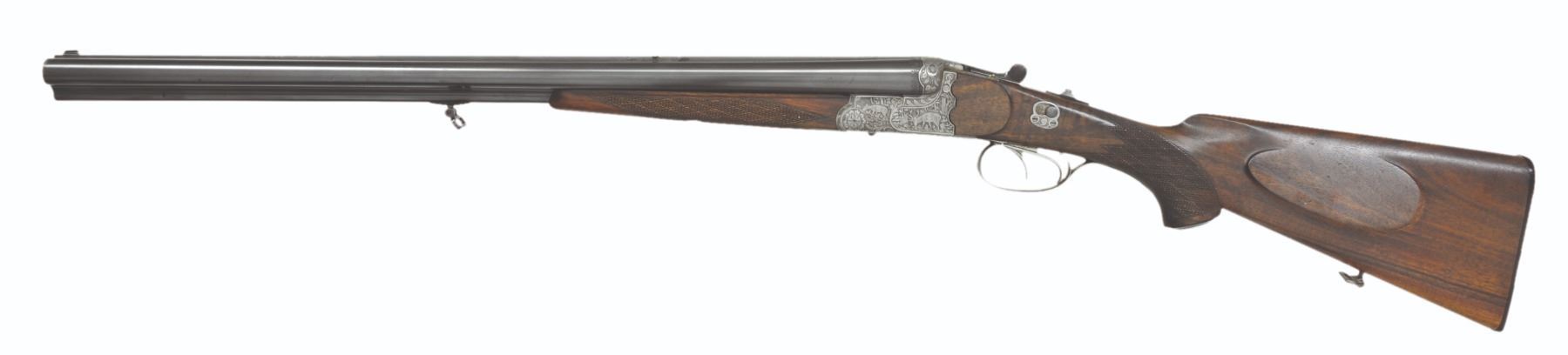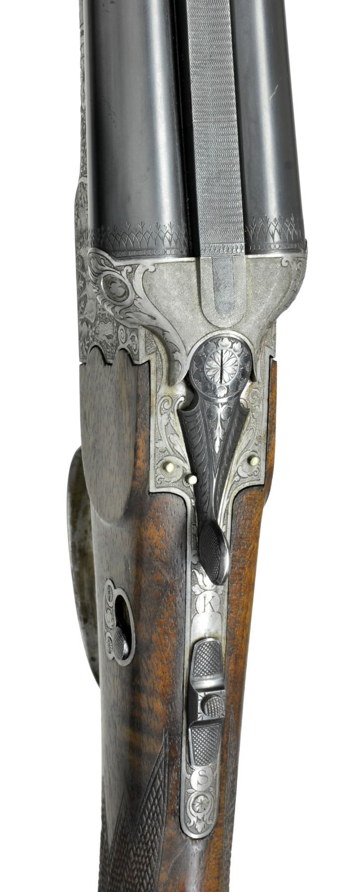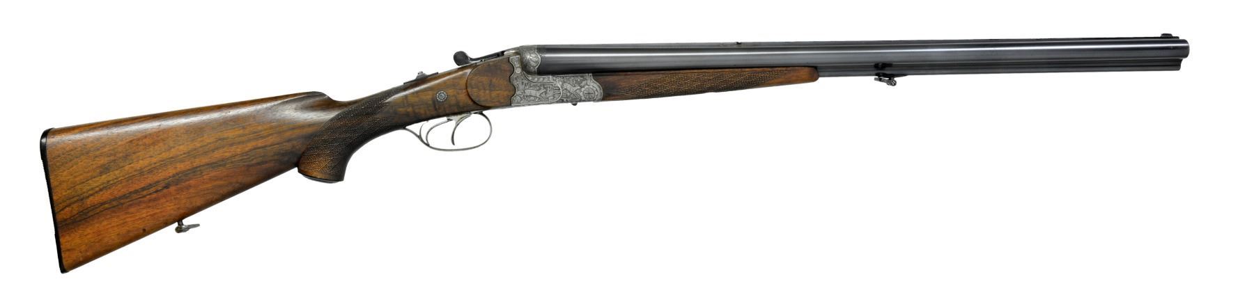 KRIEGHOFF. Cal. 16 Ga., 2 1/2" x 16 Ga., 2 1/2" x 6.5x58R. S# 21911. Bbls. 23 5/8" fitted w/ full length matted rib holding pop up rear sight & silver front bead. Makers name & "SUHL" engraved on tops. Bbl. flats stamped w/ Nazi era nitro proofs & dated "11/43". Coin finished scallop backed Blitz action features side safety, top tang mounted rifle selector, pin cocking indicators, side clips, crossbolt third fastener & dbl. triggers (front set). Action engraved w/ near full coverage shaded acanthus as background for nicely detailed game scenes on sides; stag & hind grazing in forest meadow on left, roebuck & doe bounding through woodlands on right. Bottom of action is engraved "KRIEGHOFF " DRILLING" �PATENT�. Steel trigger guard has matching engraving on bow. Lightly streaked European walnut hard rubber capped pistol grip buttstock measures 14 1/8� over ribbed composition buttplate. Stock features right hand cheekpiece & skip line point pattern checkering at grip. There are sling loops on toeline & bbl. Matching splinter forend has Deeley release. Bore diameter: left - .662, restriction: .030 (IMod), right - .661, restriction: .029 (IMod). Minimum wall thickness: left - .031, right - .035. DAH: 2 13/16�. DAC: 1 5/8�. Cast approx. 1/2� off. WEIGHT: 7 lbs. 0 oz. CONDITION: fine. Bbls. retain approx. 90% what appears to be original blue w/ a few dings & scratches. Coin finish of action is toned a bit w/ some minor staining. Stocks retain approx. 80% of their original hand rubbed oil finish w/ a fair number of scratches & minor dings. Stock shows a repair running from rear of top tang through grip down to trigger guard tang. Checkering nicely cleaned up. Stock remains loose on action & requires more attention. Bores are very fine, bright & shiny. Rifle bore is smooth, shiny w/ perhaps a bit of erosion at throat. Action is tight. Safety is quite loose (needs attention). Set trigger works. Sempert & Krieghoff were known for their superb quality. This wartime production example shows only a minor reduction of workmanship. (20-329/MGM54). CURIO. $1,500-2,500.