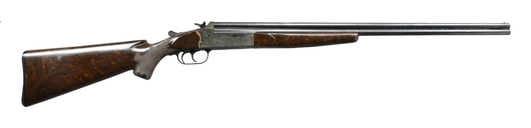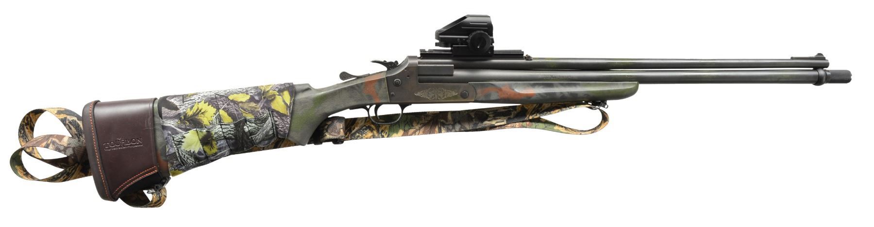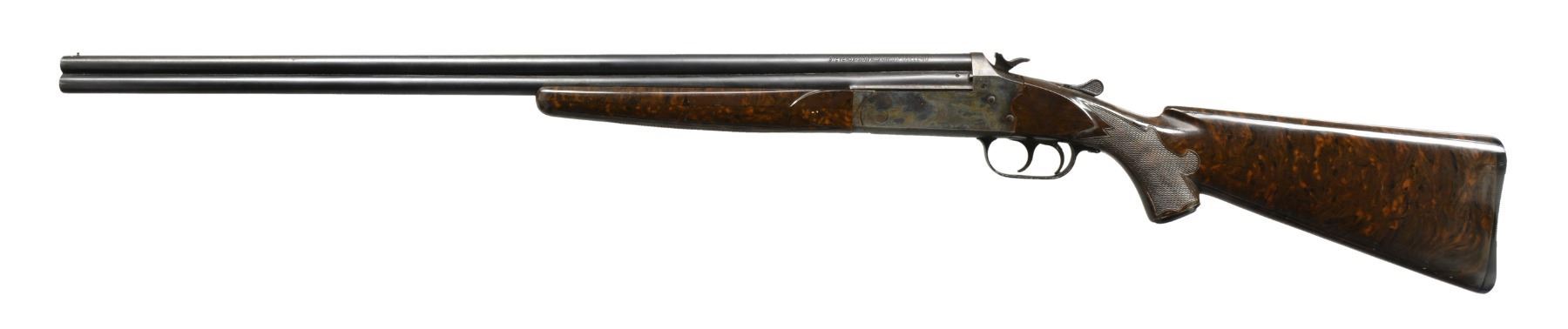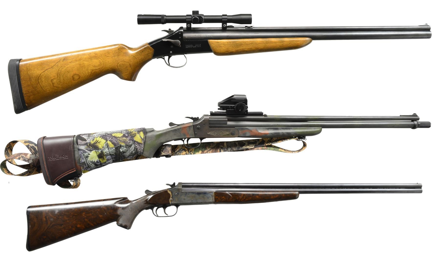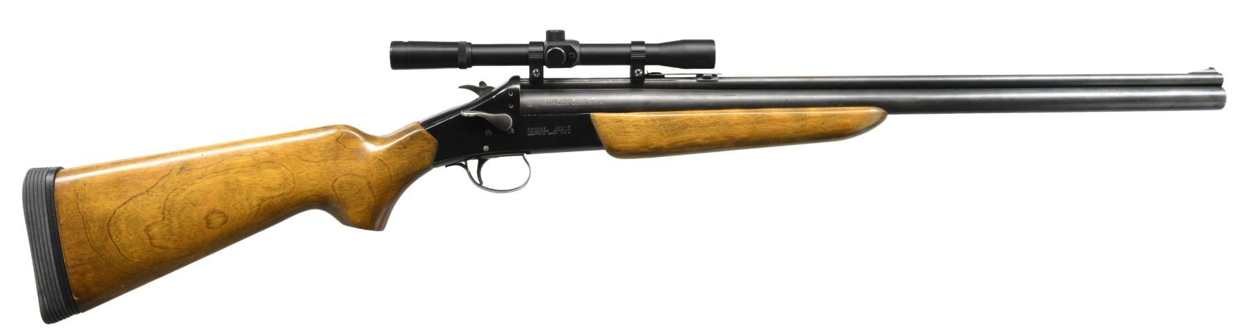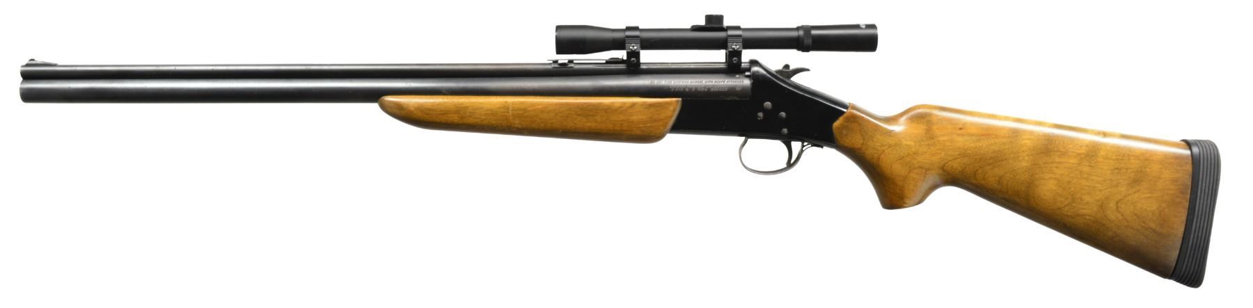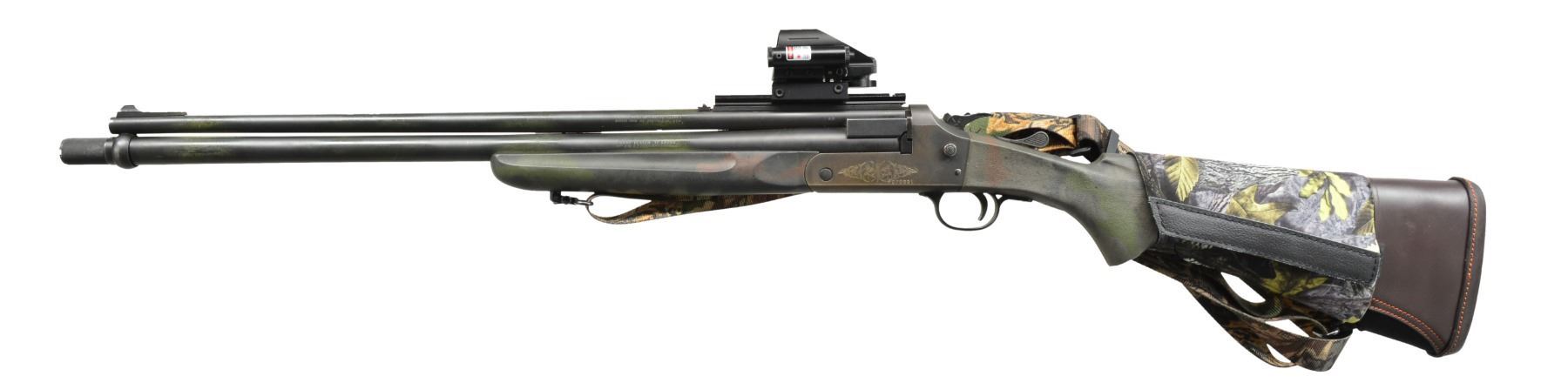 1) SAVAGE MODEL 24S-E COMBO. Cal. 22 LR / 20 Ga., 3". NSN. Bbls. 24". Top bbl. grooved for scope mt. & open sporting rear sight. Blade front sight. Bottom shotgun bbl. choked Full. Selector in hammer. Has imported 4x20 scope w/ crosshair reticle. Hardwood stock set. Buttstock has added unfitted solid recoil pad. CONDITION: stock set has light wear, scattered scratches & handling marks throughout. Bbls. have thinning blue finish w/ scattered spots of oxidation & fine pitting. Bores very good shiny. Scope does not focus well. (20-1092/RW). CURIO. 2) SAVAGE MODEL 24 F COMBO. Cal. 22 Hornet / 12 Ga., 3". S# F070691. Bbls. 24" markings include "SAVAGE MODEL 24 F WESTFIELD MA 22 HORNET 12 GAUGE 3" CHAMBER". Top rifle bbl. has Weaver type scope base. Shotgun bbl. has interchangeable chokes; Turkey choke tube included. Top bbl. has incomplete folding sporting rear sight. Ramp front sight w/ white colored bead. Illuminated laser sight w/ red & green dots. Crossbolt safety. Selector in hammer. Camouflage pattern synthetic stock. 2 Web carrying straps. Torbon leather slip on buttpad. CONDITION: stock set has light wear & handling marks. Metal has black type finish having appearance of added camouflage w/ light wear & scratches. Shotgun bore has shiny bore w/ streaks of fouling throughout. Rifle bore has lightly worn bore. Sight appears to function. (20-1111/RW). MODERN. 3) STEVENS 240 O/U SHOTGUN. Cal. 410. 3". NSN. Bbls. 26" w/ fixed Full chokes. Bbls. markings include "J STEVENS ARMS CO CHICOPEE FALLS MASS MODEL 240 3 INCH CHAMBERS". Gold colored bead front sight. Twin hammers as selectors. Dbl. triggers. Plain extractor. Brown Tenite stock set. CONDITION: stock set has light wear, scattered scratches & handling marks. Metal has light wear & spots of peppery oxidation throughout. Good shiny bores, but w/ streaks of fouling. ( 20-1114/RW). CURIO. $1,100-1,600.