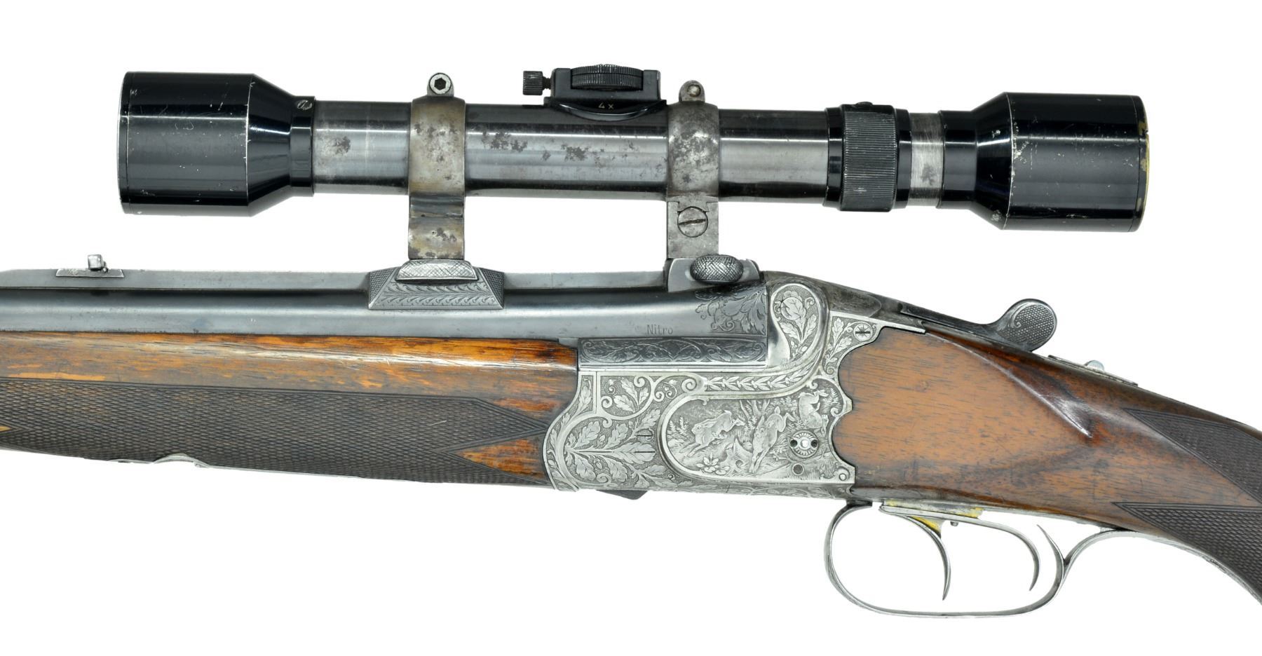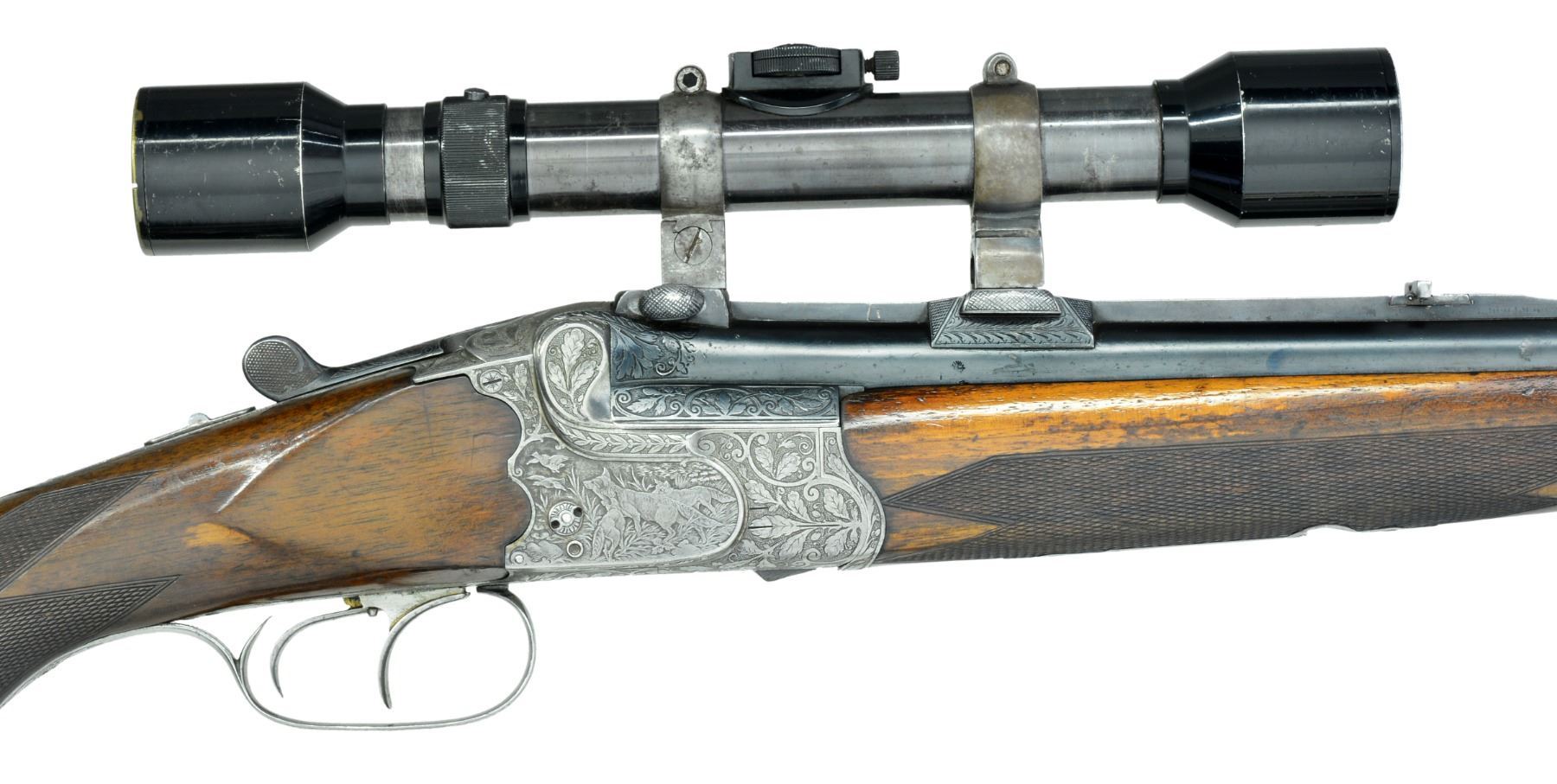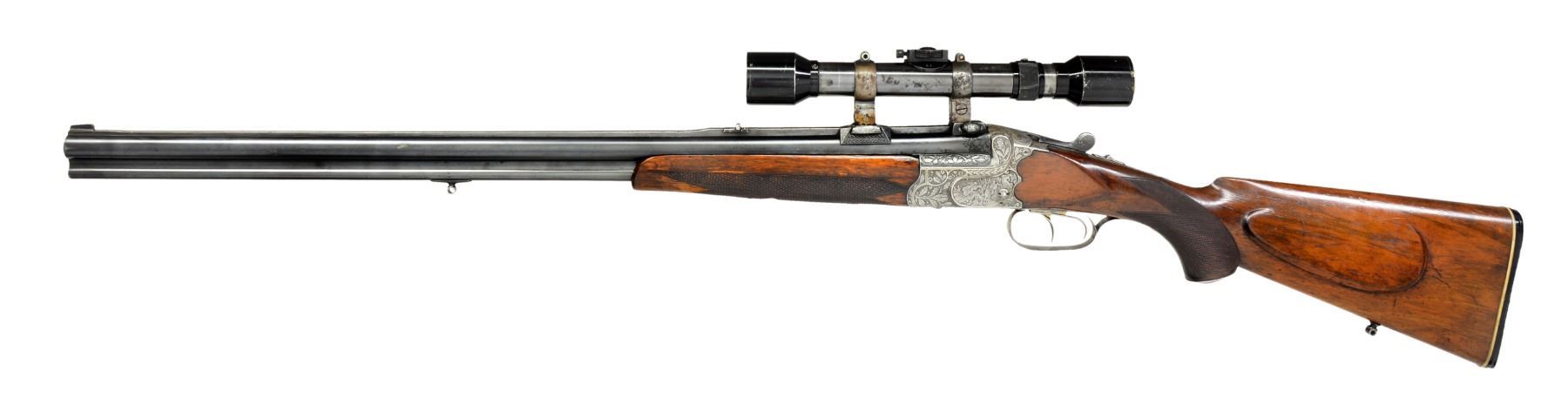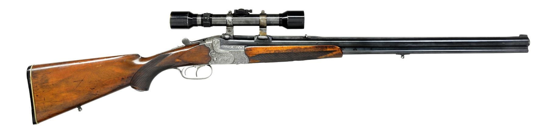 Cal. 12 Ga., 2 3/4" X 7 x 57R. S# 4203. Bbls. 27" w/ full length matted rib fitted w/ flip over rear sight are engraved "Carl Funk in Suhl" on rib. Rib is fitted w/ claw scope bases holding old 4X German scope in claw rings. Coin finished boxlock scallop backed O/U action features tang safety, single Kersten third fastener, pin cocking indicators on sides & dbl. triggers (front set). Action engraved w/ shaded scrolling oak leaves surrounding game scenes on sides; 3 scampering hares on left, 1 tumbling, as shot. Right side depicts a scene of a vixen w/ 2 cubs watching 2 departing grouse (no dinner tonight!). Trigger guard is of steel. Plain European walnut steel capped pistol grip buttstock measures 13 7/8" over ribbed composition buttplate on 1/4" black & white spacer & features shadow line right hand cheekpiece & point pattern checkering. Matching slim forend has Deeley release. Bore diameter: top .722. Restriction: .040 (extra full). Minimum wall thickness: .024. WEIGHT: w/ scope 7 lbs. 5 oz. CONDITION: fair to good. Bbls. show most of a reblue. Action cleaned, engraving still sharp & clear. Stocks show old refinish & numerous marks. Shotgun bore is fine, shiny; rifle bore is dark, rifling strong. Chamber lengthened in shotgun bbl. Rifle bbl. should be checked for excess head space as rim cut measures over .080".Trigger will not set. Scope will not detach. (20-327/MGM57). CURIO. $800-1,200.