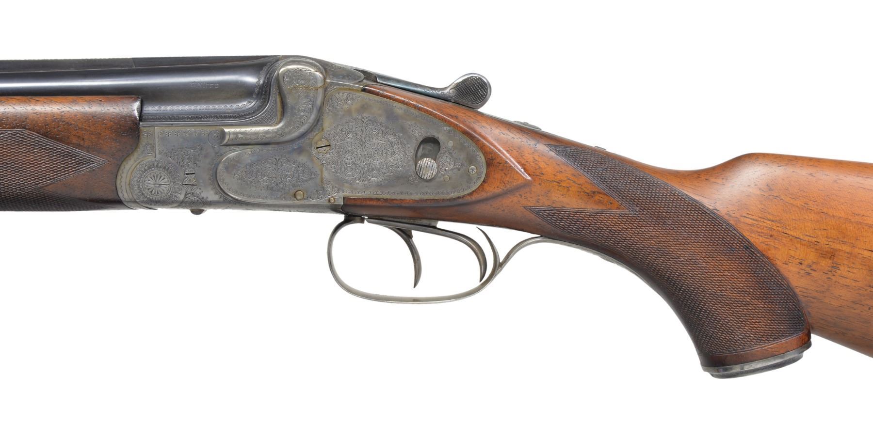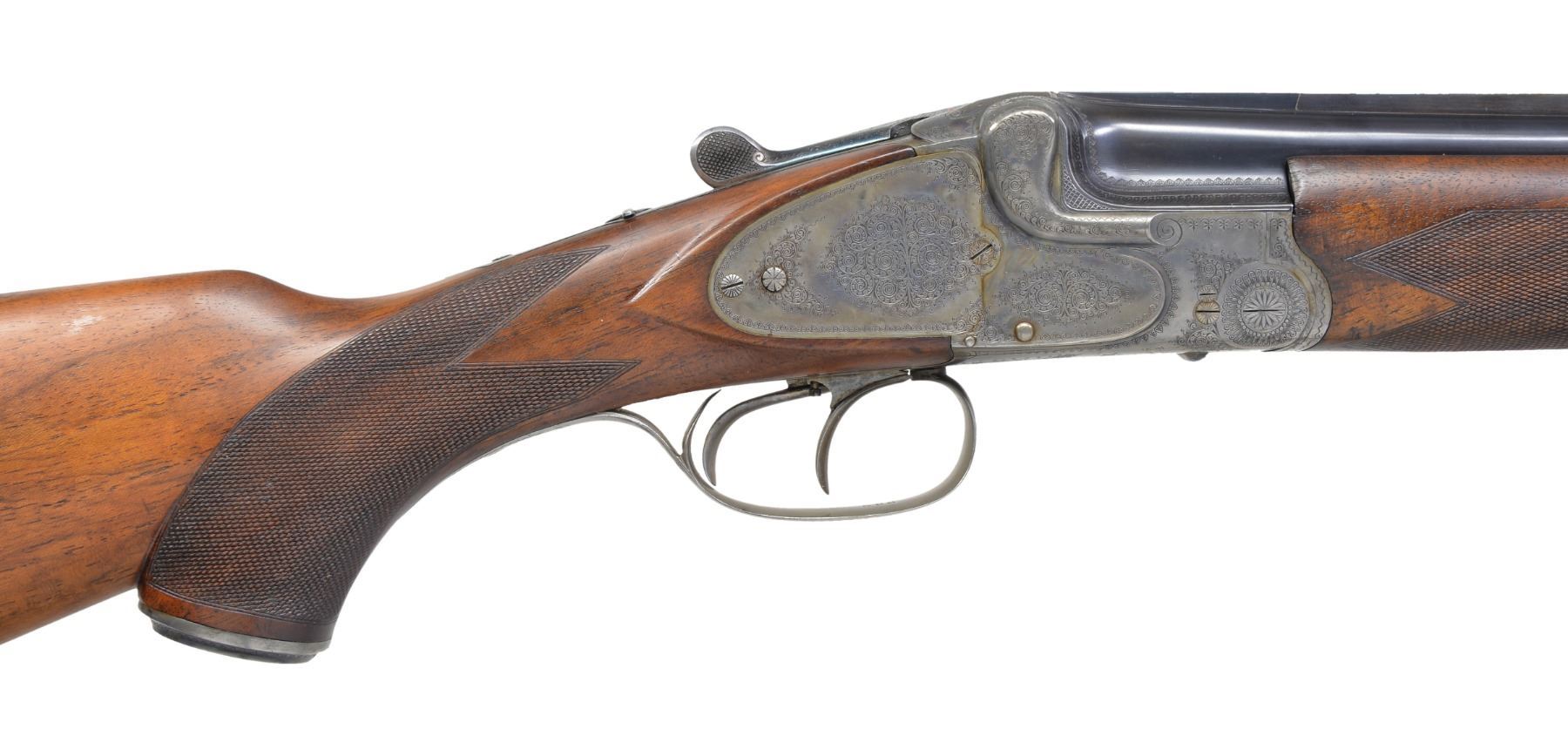 O/U RIFLE / SHOTGUN BY F. JAEGER, MADE FOR THE AMERICAN MARKET. Cal. 20 Ga. / 30-30 Win. S# 12989. Bbls. 27 1/2". Demi bloc bbls. are fitted w/ full length matted rib holding flip up rear rifle sight. Pre WWII German nitro proofs are on bbls. for 20 Ga. 2 3/4" chamber & 7.5mm x 52mm (30-30 Winchester). Casehardened O/U dbl. Kerston action fitted w/ ornamental sideplates features Greener type side safety in left plate, flip up peep sight in top tang & dbl. triggers (front set). Action & sideplates are engraved w/ 70% coverage of very nicely cut unusual style scroll w/in scroll & geometric borders. "F. Jaeger & Co" "Suhl in Germany" is on bottom of action. Steel trigger guard is engraved to match. Well marbled & lightly figured European walnut trap steel capped pistol grip buttstock measures 14 1/8" over checkered steel buttplate w/ trap, (space for 3 cartridges under trap.) Point pattern checkering is at grip & a vacant silver oval is on toeline. Matching one piece forend has Anson type release. Bore diameter: .627, choke .018 (mod). Wall thickness: .030. DAC: 1 9/16". DAH: 2 1/2". LOP: 14 1/8". Cast about 3/8" off. WEIGHT: 6 lbs. 11 oz. CONDITION: fine, as lightly & partially refinished. Bbls. retain nearly all of what appears to be original blue, which has been touched up over a few marks. Action retains 70-80% original casehardening color. Sideplates have over 90% of their color. Thumb piece & trigger guard tang silvered. Stocks lightly refinished, checkering cleaned. There is a sm. old stable crack behind top tang. Bores are bright & shiny. Action is tight. A very nice sm. bore combo. (19-5473/MGM11). CURIO. $800-1,200.