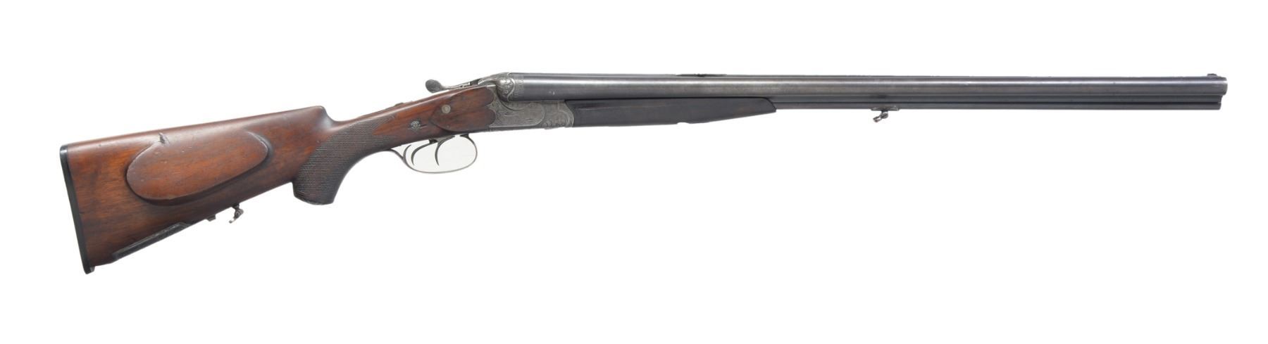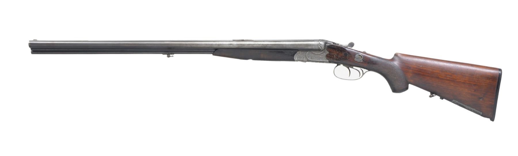 Cal. 16 Ga. / 7.8mmx58 1/2R, 2 1/2". S# 887. Bbls. 27 1/4" of Rochling's steel. Bead front sight w/ V notch rear sight operated by switch. Scalloped boxlock action featuring cocking indicators, Greener side safety & side clips w/ dbl. under lug & crossbolt locks. Full coverage vine type foliate scroll engraving surrounds game scenes of deer & elk. Dbl. triggers, front trigger is set. Splinter forearm & pistol grip stock of checkered walnut w/ cheekpiece for left handed shooter. Features include a fluted pistol grip cap, checkered horn buttplate w/ engraved cartridge trap in toeline. European style sling swivels, front swivel bbl. mounted. CONDITION: metal retains 40% dull fading blue w/ balance fading to gray. Wood has dark heavily worn weathered appearance. Stock is cracked through head w/ cracks & chips extending from action, tang having a plug type repair. Toe of stock is missing a lg. chip. Shotgun bores show some very light pitting. Rifle bore has worn rifling. (19-5535/DS). CURIO. $500-750.