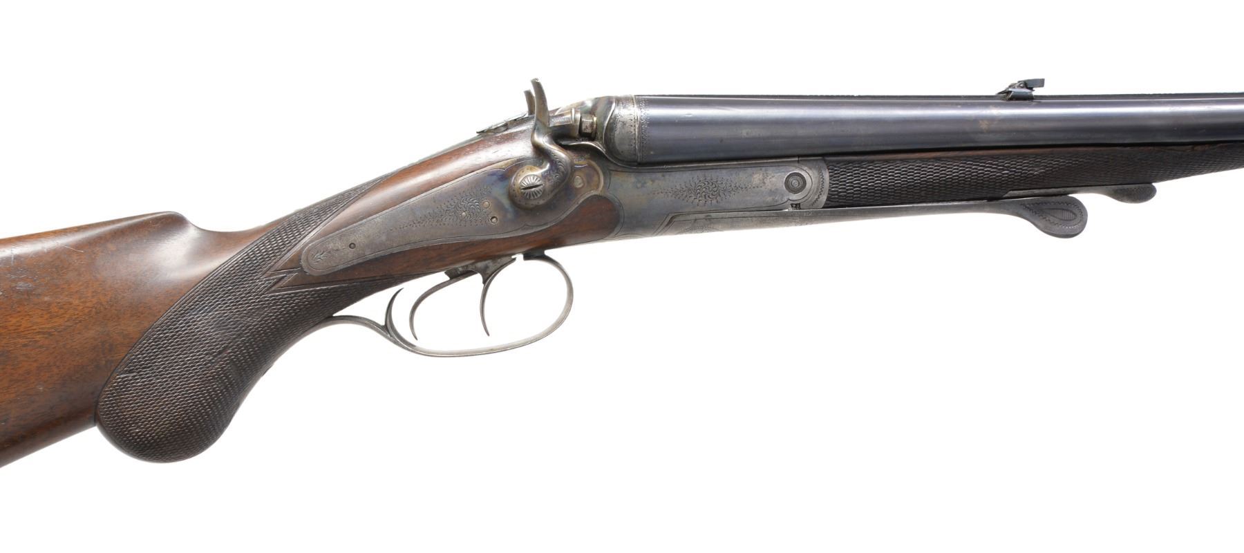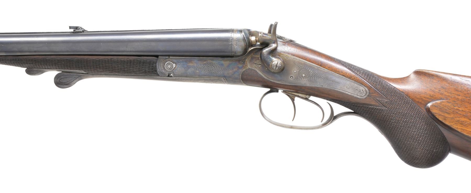 FERLACH. Cal. 16 Ga.,11.6mm, 2 3/4". (.452 Groove dia.). ( 45-70 Drops in, but bbl. base diameter measures .035 oversize). S# 2439. Bbls. 27" SxS, engraved "M. OGRIS" & "FERLACH" on tops. Full length matted rib holds Lyman folding rear sight & silver bead front. Bottoms of bbls. are stamped w/ 1901 Ferlach black powder proofs. Casehardened forward pivoting Jones type under lever action is fitted w/ peninsula back spring rebounding locks. A flip up rear sight is in top tang. Action is engraved w/ sprays of scroll w/in line borders. Relatively plain European walnut rnd. knob pistol grip buttstock measures 13 5/8" over steel buttplate & features shadow line right hand cheekpiece & point pattern checkering. Captive forend attaches to bbls. w/ sm. forward pivoting lever. Bore diameter: left - .633, choke .000 (cyl). Wall thickness: left - .038. DAC: approx. 1 5/8". DAH: approx. 2 7/8". CONDITION: bbls. retain over 90% original blue w/ some marks quite deep on rifle bbl. Action & lockplates retain 70-80% original case color w/ some browning & flecking. Stocks retain 80-90% original finish w/ numerous light marks, checkering lightly worn w/ some dings & compressions, quite lg. & deep on right side of grip. There are some slivers of wood missing from forend bbl. channels from someone attempting to remove forend w/out knowing how. Bores are bright & shiny w/ a few light pits in shotgun bbl. Mechanically fine. (19-5742/MGM33). CURIO. $600-900.