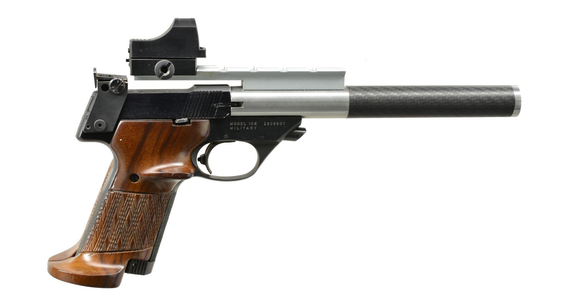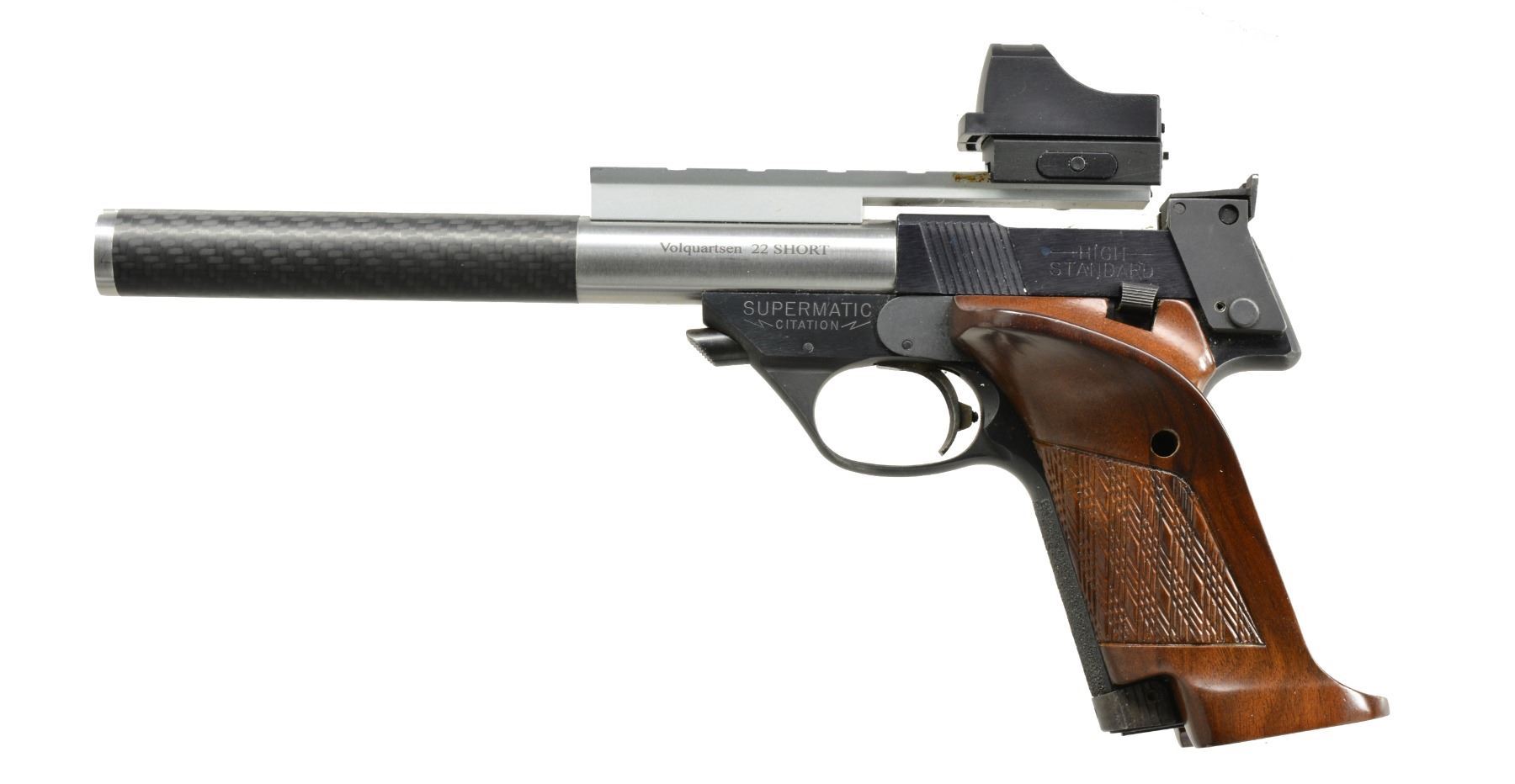 CITATION SEMI AUTO PISTOL. Cal. 22 Short. S# 1808807. Bbl. 8" custom Volquartsen bull bbl. w/ fiberglass wrapping. Unmarked red dot sight on aluminum rail. Action retains original square notch target rear sight. Action has custom stippled grip straps. Black anodized alloy slide. Aftermarket walnut thumb rest target grips w/ skip line checkering. MAGS: 2 detachable 10 rd. CONDITION: action retains over 90% blue showing edge wear. Slide retains over 90% anodized finish. Custom bbl. has very good finish & very good bright bore. Grips show sm. handling marks. Sight battery is dead. (20-941/DS). MODERN. $600-900.