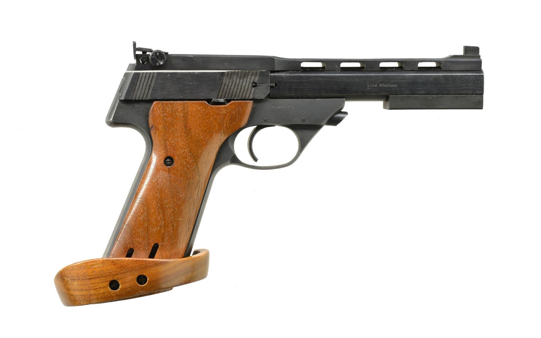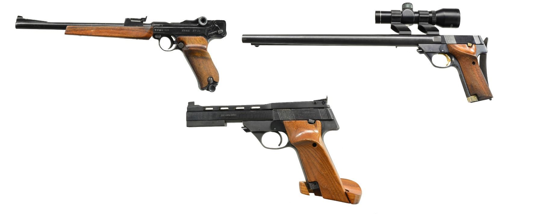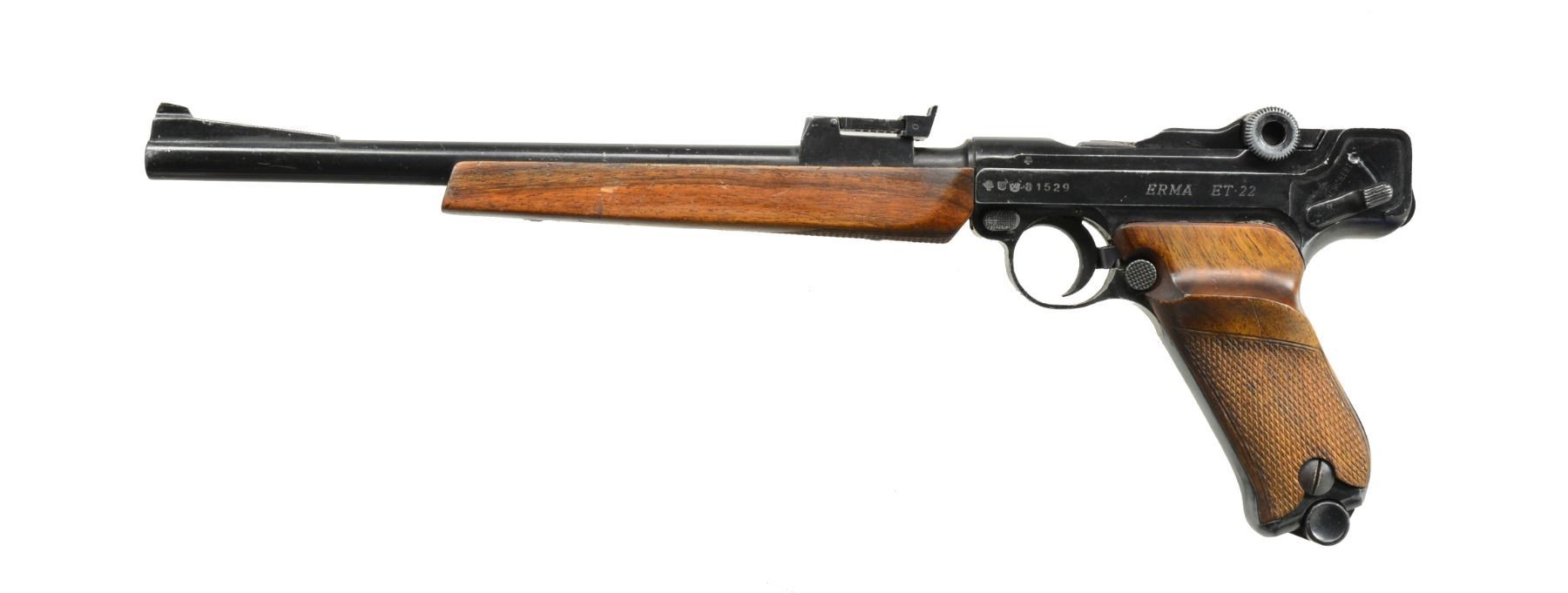 1) HIGH STANDARD TARGET. Cal. 22 LR. S# ML 45173. Bbl. 5 3/4". High Standard ML Series pistol & target configuration, dual serrated rear slide, heavy weighted, vent rib target bbl. w/ push button interface. Adj. wooden pistol grips. Blued finish. Blade front sight w/ adj. rear target sight. MAGS: 4-10 rd. CONDITION: bluing coverage is consistent throughout w/ majority of wear surrounding the pistol grip area w/ some loss in serrated sections of slide. Bore is shiny w/ decent rifling. Fire control mechanism appears to function correctly when cycled by hand. (20-971/JZ). 2) HIGH STANDARD ML W/ CARBINE KIT. Cal. 22 LR. S# ML28175. Bbl. 16 3/4". High Standard ML Series pistol w/ push button style bbl. interface. Target grips & high luster, blue finish w/ gold accented trigger, mag. release & slide release. To coincide w/ the long bbl. is an adj., collapsible, tubular stock which is attached to the bbl. on the right side. The bbl. is also drilled & tapped for a scope & utilizes a Tasco 2.5-20 optical sight. Bbl. & stock incorporate a matte finish bluing w/ the latter utilizing a 5" rubber tube to function as a cheek rest. MAGS: 3-10 rd. UNATTACHED ACCESSORIES: plastic mag. loader & scope caps. CONDITION: grips are free of any major defect & bluing is uniform, complete throughout. Thinning primarily at spots of mechanical interface. Stock mechanism locks tight in open position & scope clarity seems decent. Bore is shiny w/ strong rifling. Fire control mechanism appears to function correctly when cycled by hand. (20-975/JZ). 3) ERMA ET-22 CARBINE. Cal. 22 LR. S# 81529. Bbl. 11 3/4". Target variation, chambered in 22 Long Rifle of the ERMA Artillery type pistol. Metal finish is blued w/ hardwood forend & checkered pistol grips. Blade style front sight w/ Artillery style rear sight. MAGS: 2-11 rd. UNATTACHED ACCESSORIES: nylon holster. CONDITION: decent bore w/ strong rifling. Fire control mechanism appears to function correctly when cycled by hand. Finish is even w/ heavy thinning in the pistol grip region. Assorted scratches & some bbl. finish thinning between sights. (20-1075/JZ). ALL MODERN. $900-1,100.
