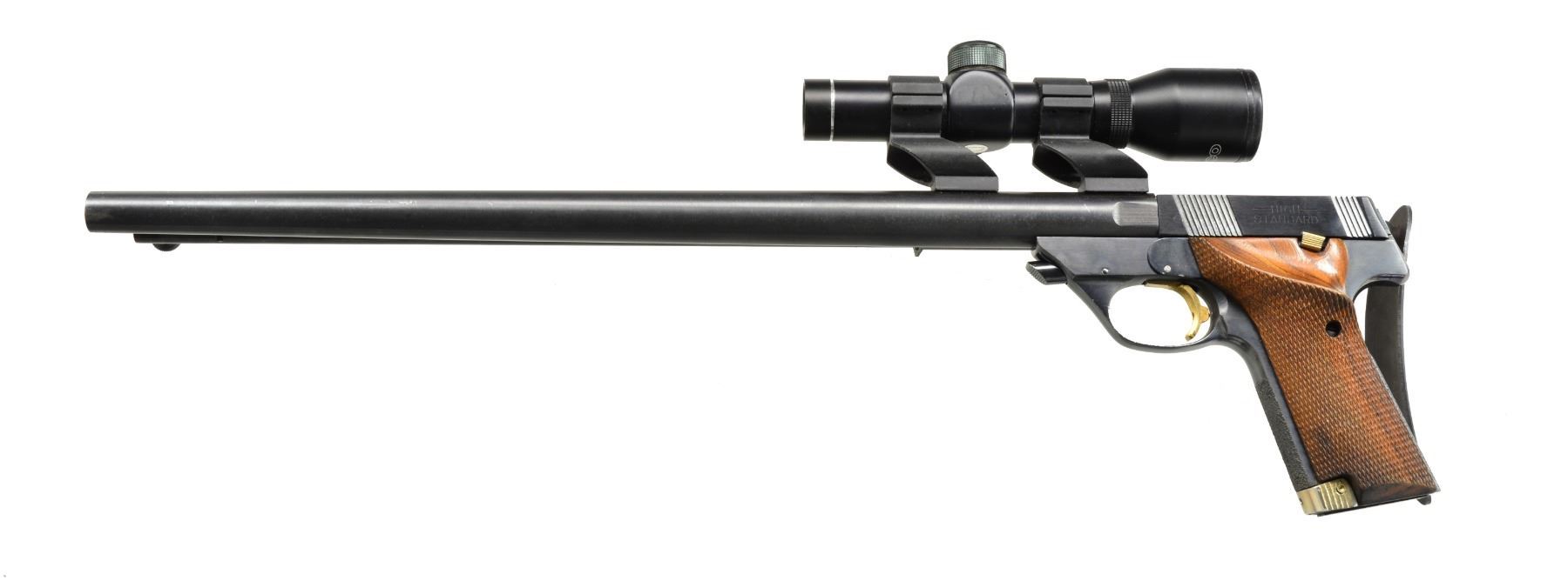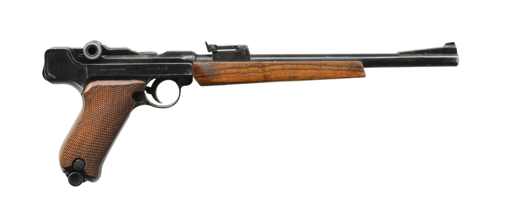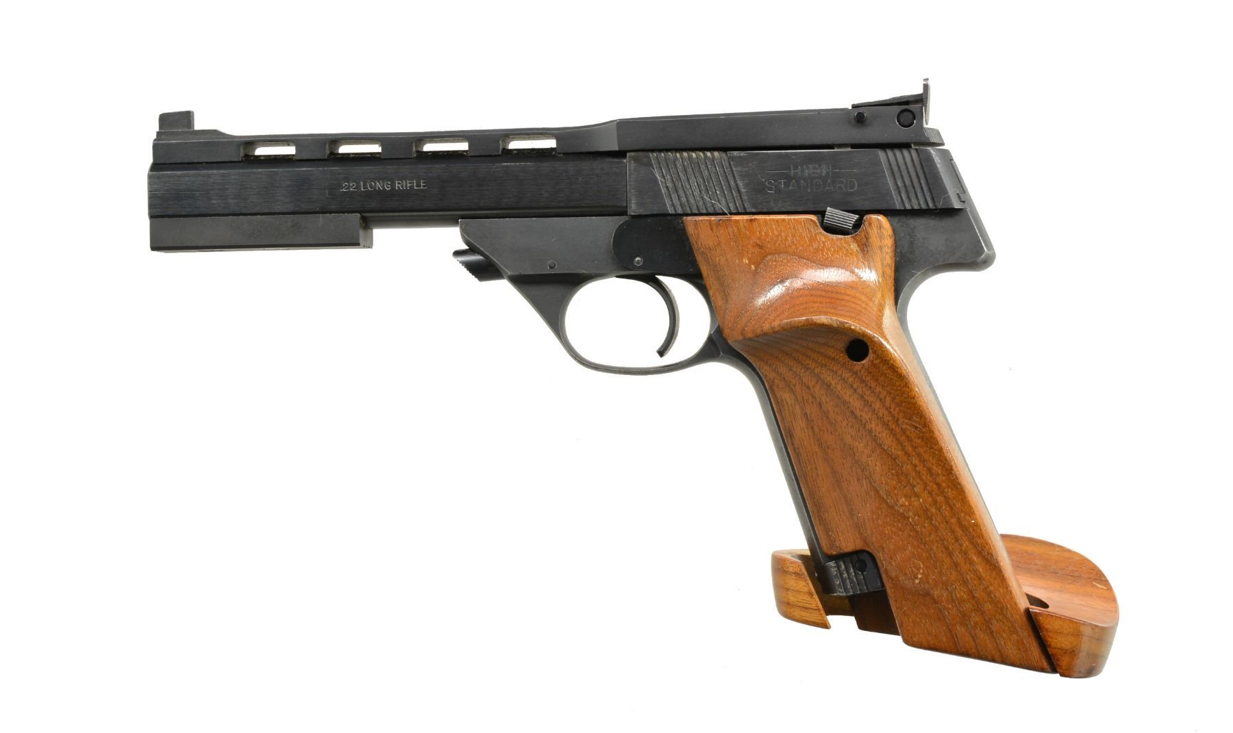 1) HIGH STANDARD TARGET. Cal. 22 LR. S# ML 45173. Bbl. 5 3/4". High Standard ML Series pistol & target configuration, dual serrated rear slide, heavy weighted, vent rib target bbl. w/ push button interface. Adj. wooden pistol grips. Blued finish. Blade front sight w/ adj. rear target sight. MAGS: 4-10 rd. CONDITION: bluing coverage is consistent throughout w/ majority of wear surrounding the pistol grip area w/ some loss in serrated sections of slide. Bore is shiny w/ decent rifling. Fire control mechanism appears to function correctly when cycled by hand. (20-971/JZ). 2) HIGH STANDARD ML W/ CARBINE KIT. Cal. 22 LR. S# ML28175. Bbl. 16 3/4". High Standard ML Series pistol w/ push button style bbl. interface. Target grips & high luster, blue finish w/ gold accented trigger, mag. release & slide release. To coincide w/ the long bbl. is an adj., collapsible, tubular stock which is attached to the bbl. on the right side. The bbl. is also drilled & tapped for a scope & utilizes a Tasco 2.5-20 optical sight. Bbl. & stock incorporate a matte finish bluing w/ the latter utilizing a 5" rubber tube to function as a cheek rest. MAGS: 3-10 rd. UNATTACHED ACCESSORIES: plastic mag. loader & scope caps. CONDITION: grips are free of any major defect & bluing is uniform, complete throughout. Thinning primarily at spots of mechanical interface. Stock mechanism locks tight in open position & scope clarity seems decent. Bore is shiny w/ strong rifling. Fire control mechanism appears to function correctly when cycled by hand. (20-975/JZ). 3) ERMA ET-22 CARBINE. Cal. 22 LR. S# 81529. Bbl. 11 3/4". Target variation, chambered in 22 Long Rifle of the ERMA Artillery type pistol. Metal finish is blued w/ hardwood forend & checkered pistol grips. Blade style front sight w/ Artillery style rear sight. MAGS: 2-11 rd. UNATTACHED ACCESSORIES: nylon holster. CONDITION: decent bore w/ strong rifling. Fire control mechanism appears to function correctly when cycled by hand. Finish is even w/ heavy thinning in the pistol grip region. Assorted scratches & some bbl. finish thinning between sights. (20-1075/JZ). ALL MODERN. $900-1,100.