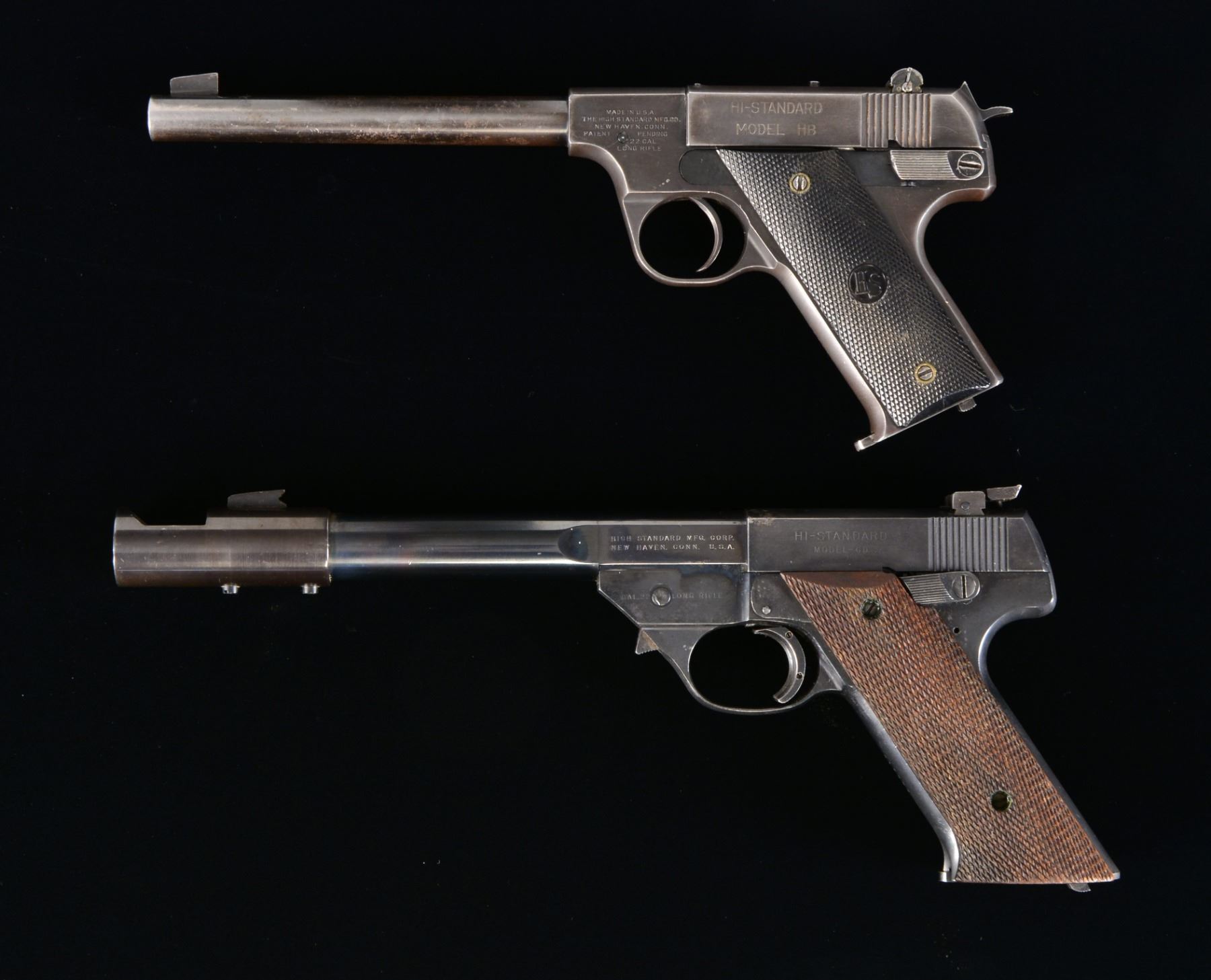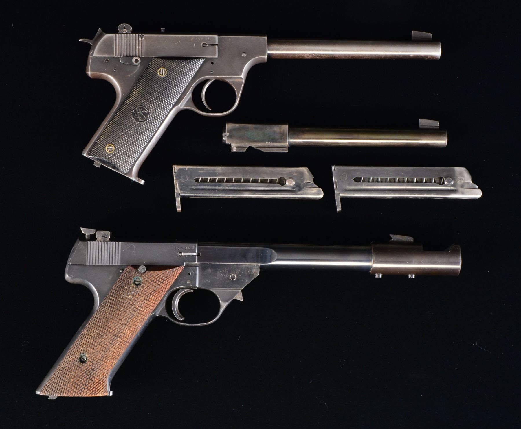 Both: cal. 22 LR. 1) MODEL HB. S# 295836. Bbl. 6 7/8" rnd. w/ blade front sight & adj. square notch rear sight. Slide has cocking indicator. Exposed hammer sm. frame action. Checkered black plastic grips w/ "HS" monogram. MAGS: 1 detachable 10 rd. CONDITION: 60% dull worn blue. Grips show light wear. Bore has lightly worn rifling. (20-1006/DS). 2) MODEL GD. S# 317959. Bbl. 7 7/8" over added ported extension. Blade front sight w/ square notch adj. target rear sight. Trigger has added wide shoe. 2 Piece checkered walnut grips. MAGS: 3 detachable 10 rd. UNATTACHED ACCESSORIES: extra 6 5/8" standard weight bbl. w/ blade front sight. CONDITION: 90% lightly faded blue showing handling marks. Grips show light wear. Both bbls. have very good bright bores. (20-1010/DS). BOTH CURIO. $600-900.