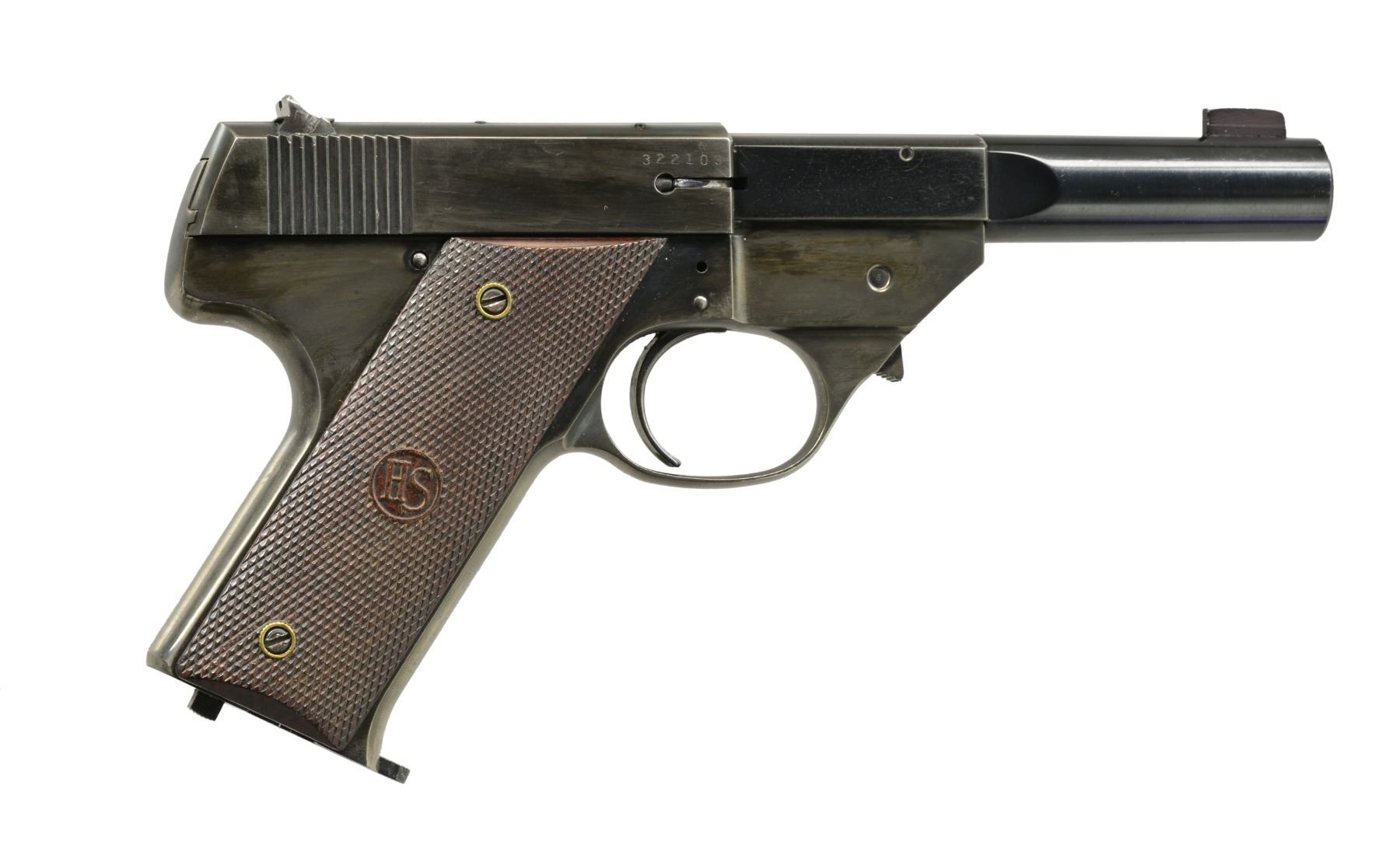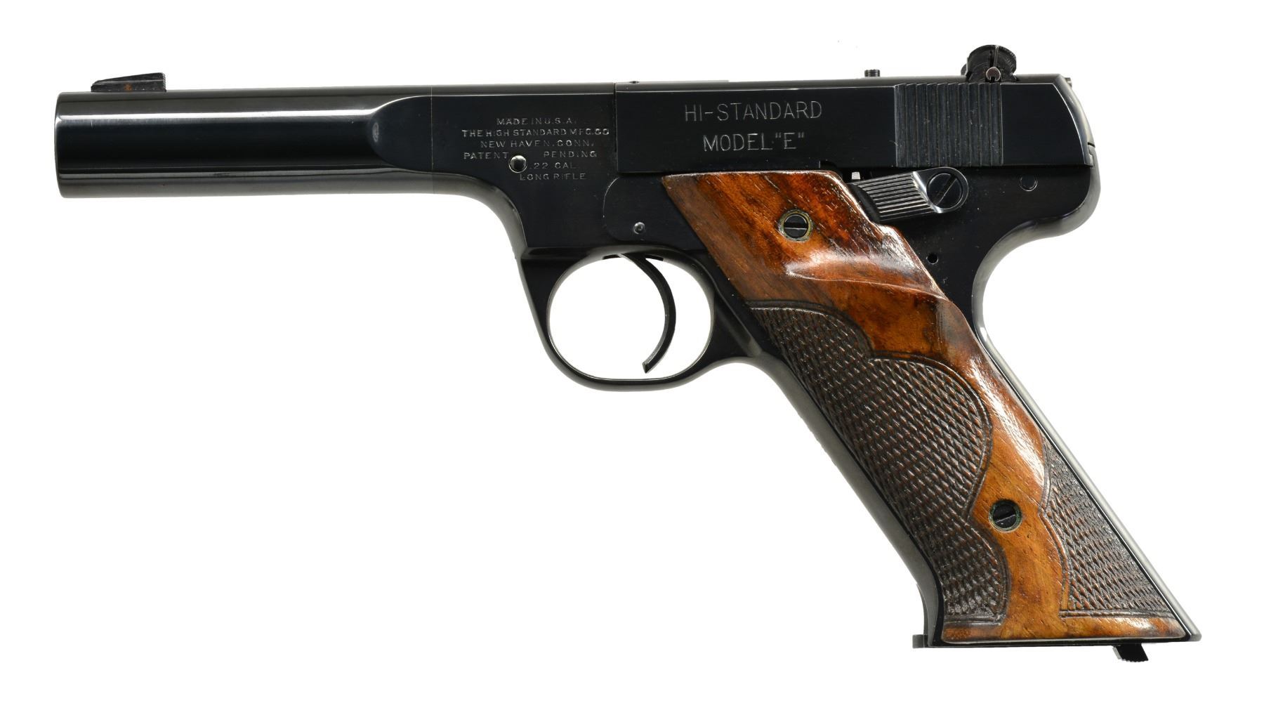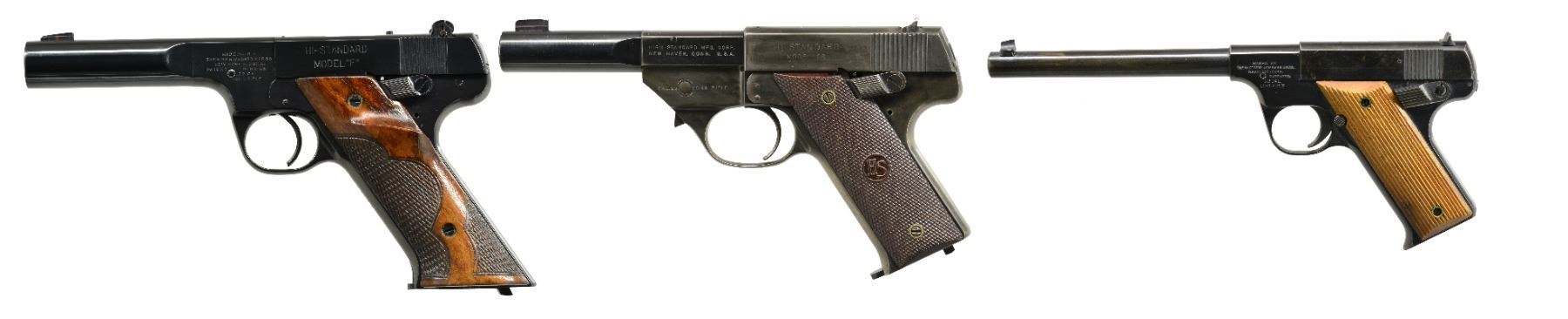 ALL: cal. 22 LR. 1) HIGH STANDARD MODEL E SEMI AUTO. S# 86403. The Deluxe Model of the hammerless series. Bbl. 4 1/2" of heavy bull style. Blade front sight w/ adj. square notch rear sight. 2 Piece checkered walnut thumb rest grips. Total production of approx. 2,600. MAGS: 1 detachable 10 rd. CONDITION: over 95% brightly polished reblued finish. Refinished grips have rough appearance. Bore retains light worn rifling. (20-1012/DS). 2) HIGH STANDARD MODEL GB SEMI AUTO. Cal. 22 LR. S# 322103. Bbl. 4 1/2" heavy replacement w/ blade front sight & fixed square notch rear sight. Sm. frame hammerless action. 2 Piece checkered brown plastic grips w/ "HS" monograms. MAGS: 1 detachable 10 rd. CONDITION: bbl. retains 80% original blue. Action & slide have gray coloration from touch up blue showing spots of pitting. Very good grips. Bright bore retains strong rifling. (20-1014/DS). 3) HARTFORD ARMS TARGET MODEL OF 1925 SEMI AUTO. Cal. 22 LR. S# 853. Bbl. 6 3/4" rnd. w/ blade front sight & fixed square notch rear sight. Blue finished hammerless action. 2 Piece grooved hardwood grips. Total of 4,991 mfg. 1926-1930. CONDITION: over 80% lightly worn blue showing scattered scratches & marks. Grips show light wear. Bore is bright w/ strong rifling. (20-1015/DS). ALL CURIO. $1,000-1,750.
