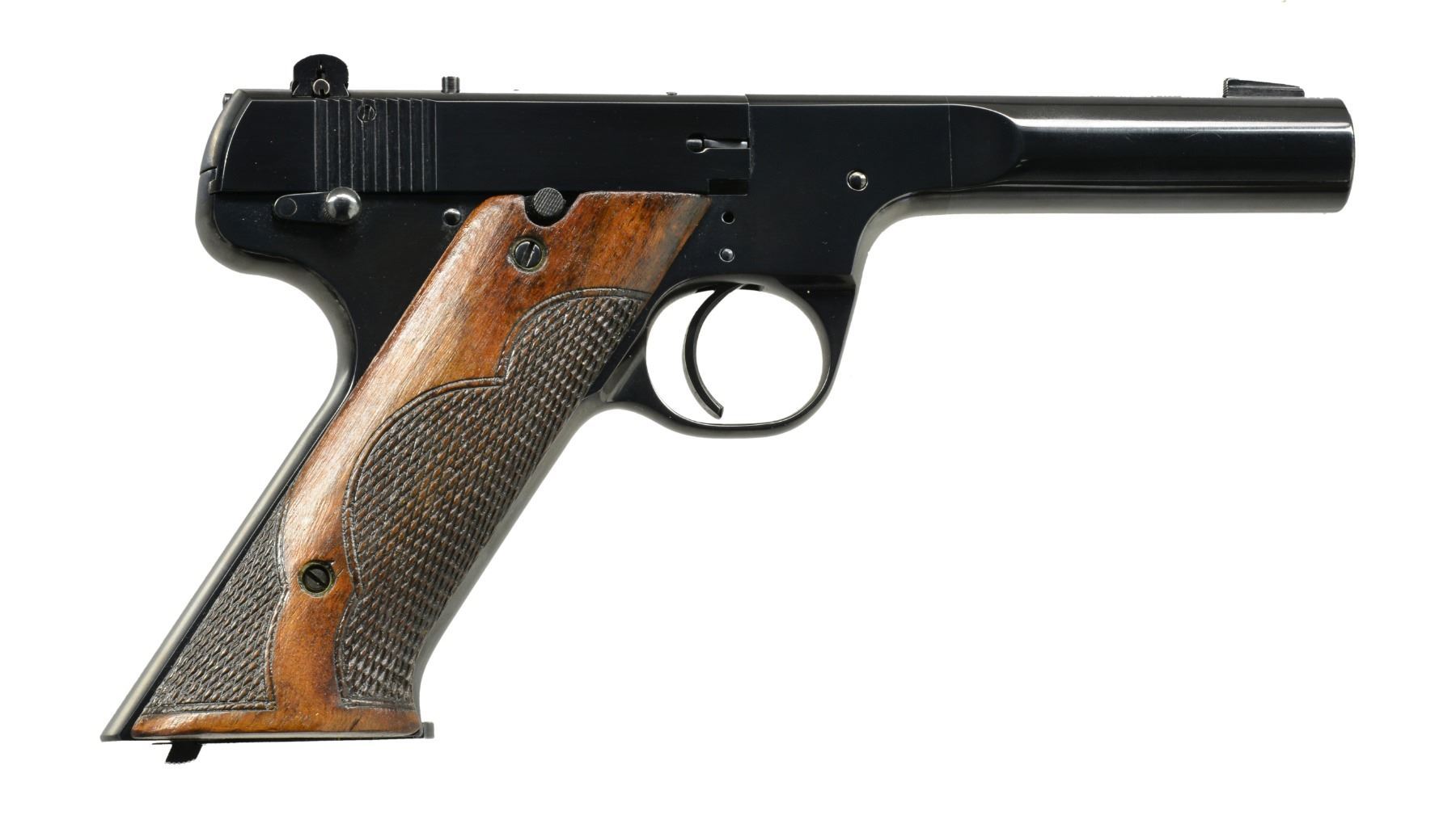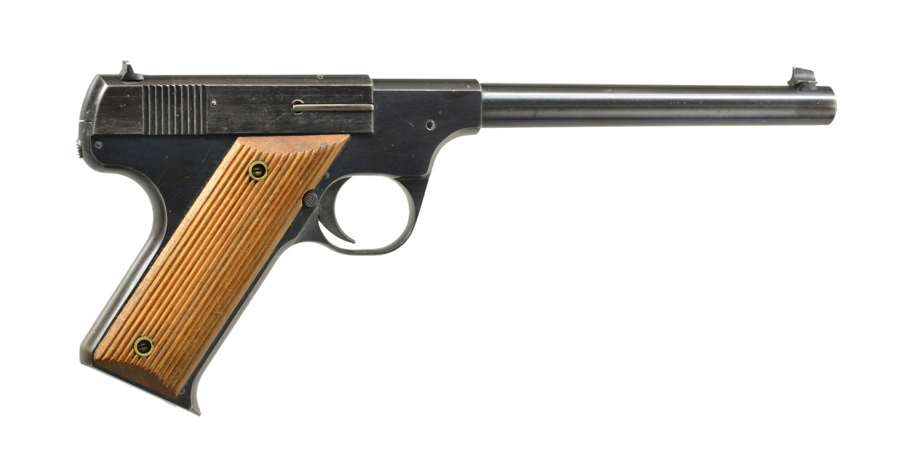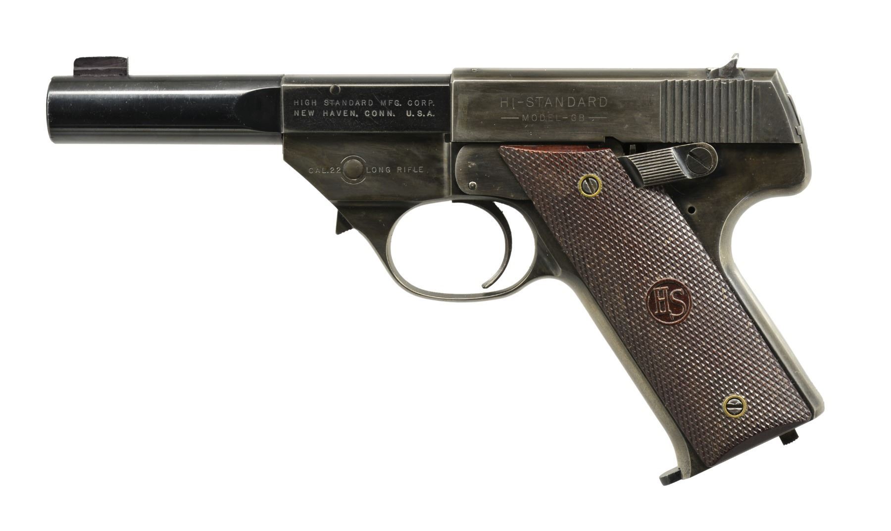 ALL: cal. 22 LR. 1) HIGH STANDARD MODEL E SEMI AUTO. S# 86403. The Deluxe Model of the hammerless series. Bbl. 4 1/2" of heavy bull style. Blade front sight w/ adj. square notch rear sight. 2 Piece checkered walnut thumb rest grips. Total production of approx. 2,600. MAGS: 1 detachable 10 rd. CONDITION: over 95% brightly polished reblued finish. Refinished grips have rough appearance. Bore retains light worn rifling. (20-1012/DS). 2) HIGH STANDARD MODEL GB SEMI AUTO. Cal. 22 LR. S# 322103. Bbl. 4 1/2" heavy replacement w/ blade front sight & fixed square notch rear sight. Sm. frame hammerless action. 2 Piece checkered brown plastic grips w/ "HS" monograms. MAGS: 1 detachable 10 rd. CONDITION: bbl. retains 80% original blue. Action & slide have gray coloration from touch up blue showing spots of pitting. Very good grips. Bright bore retains strong rifling. (20-1014/DS). 3) HARTFORD ARMS TARGET MODEL OF 1925 SEMI AUTO. Cal. 22 LR. S# 853. Bbl. 6 3/4" rnd. w/ blade front sight & fixed square notch rear sight. Blue finished hammerless action. 2 Piece grooved hardwood grips. Total of 4,991 mfg. 1926-1930. CONDITION: over 80% lightly worn blue showing scattered scratches & marks. Grips show light wear. Bore is bright w/ strong rifling. (20-1015/DS). ALL CURIO. $1,000-1,750.